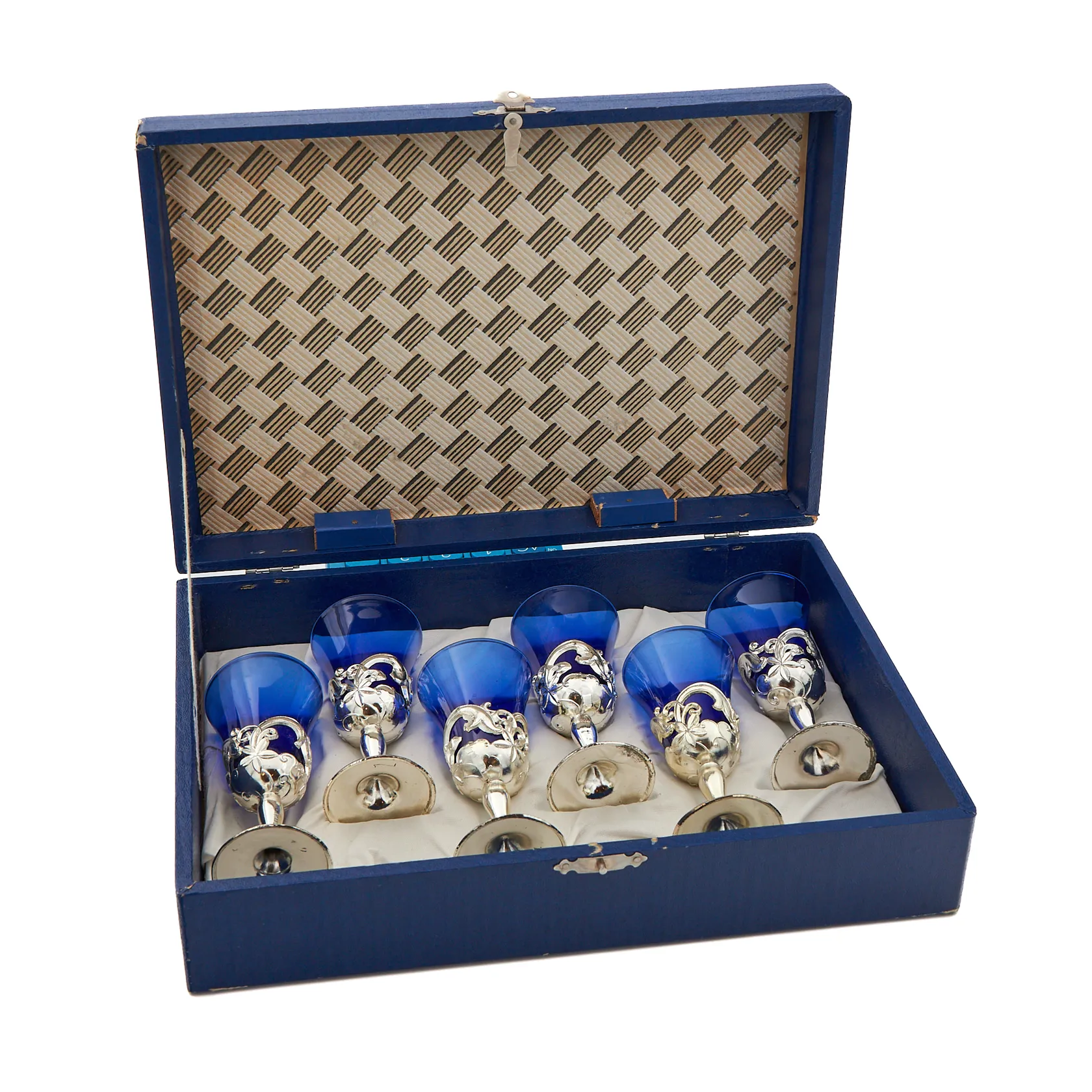 Kuusi koristeellista snapsipikaria, korkeus 90mm, jalka metallia, laatikko,