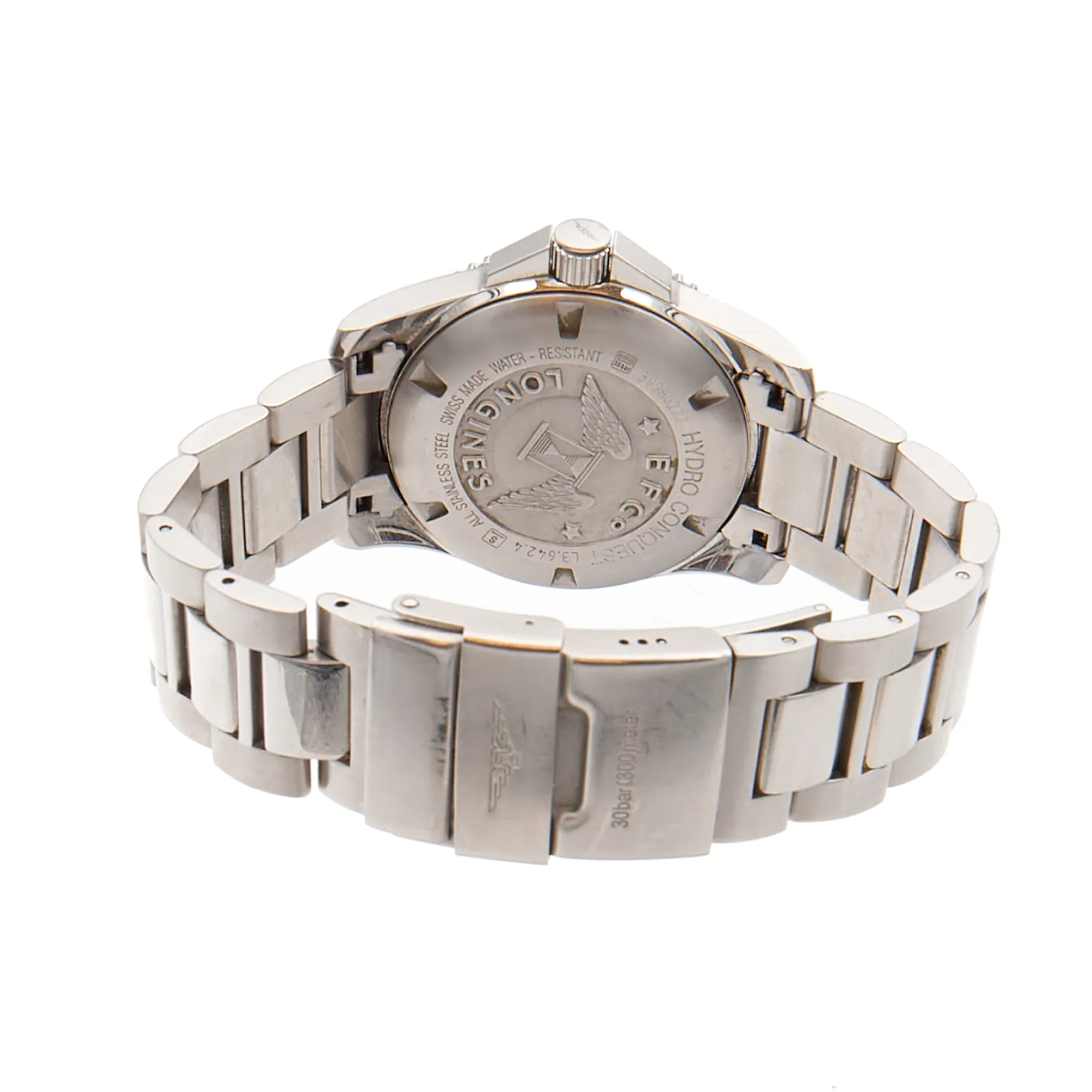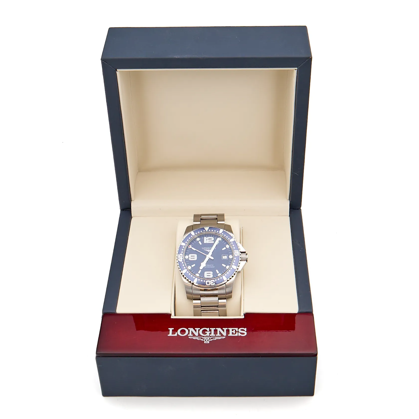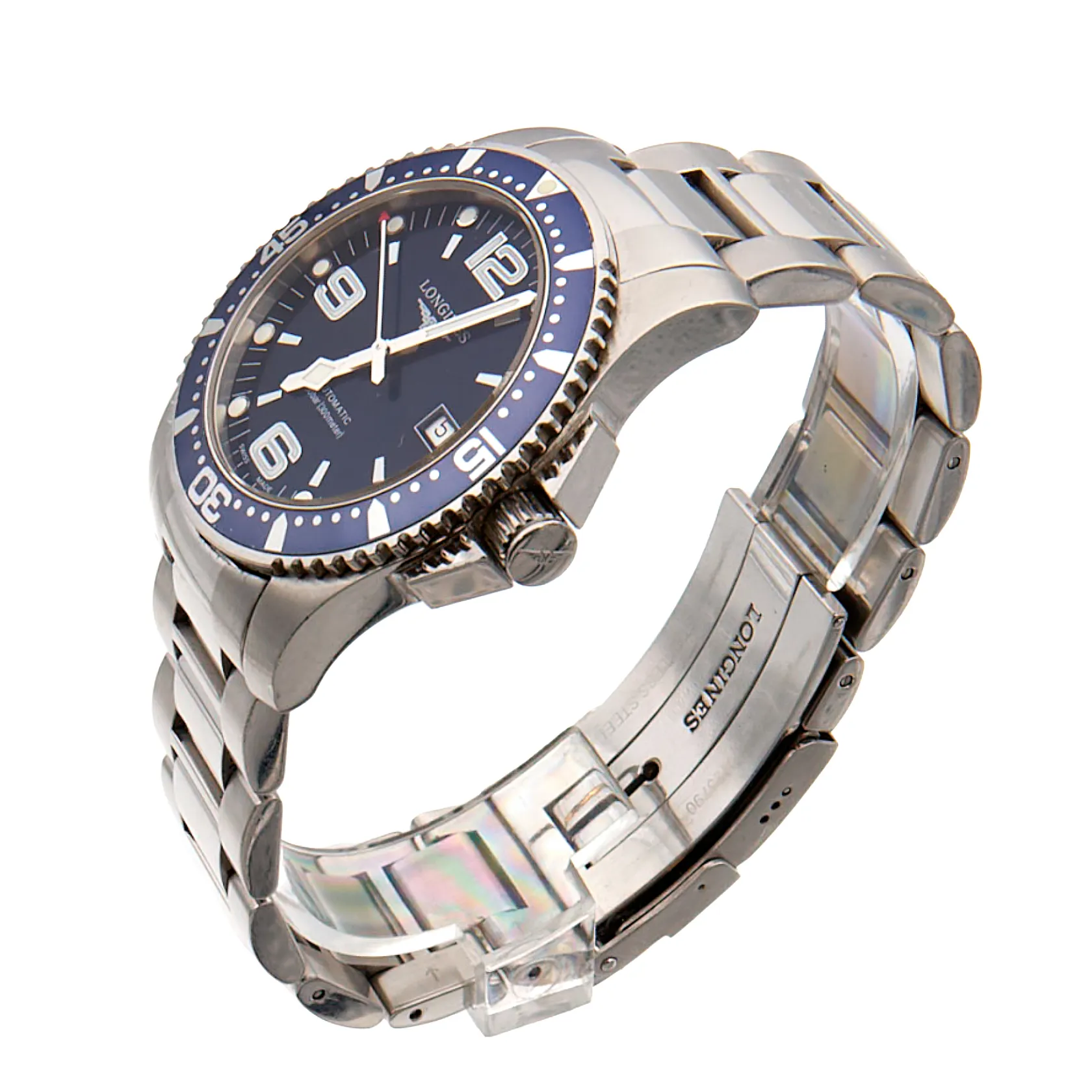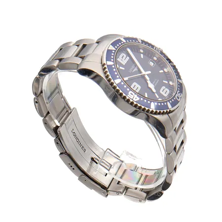Teräsrannekello Longines Hydro Conquest, automaatti, ref. L3.642.4, sr. 399980222, taulun Ø 42mm, kellon kehässä ja rannekkeessa käytön jälkiä, rannekkeen pituus 180mm, yksi lisäpala ja laatikko.
