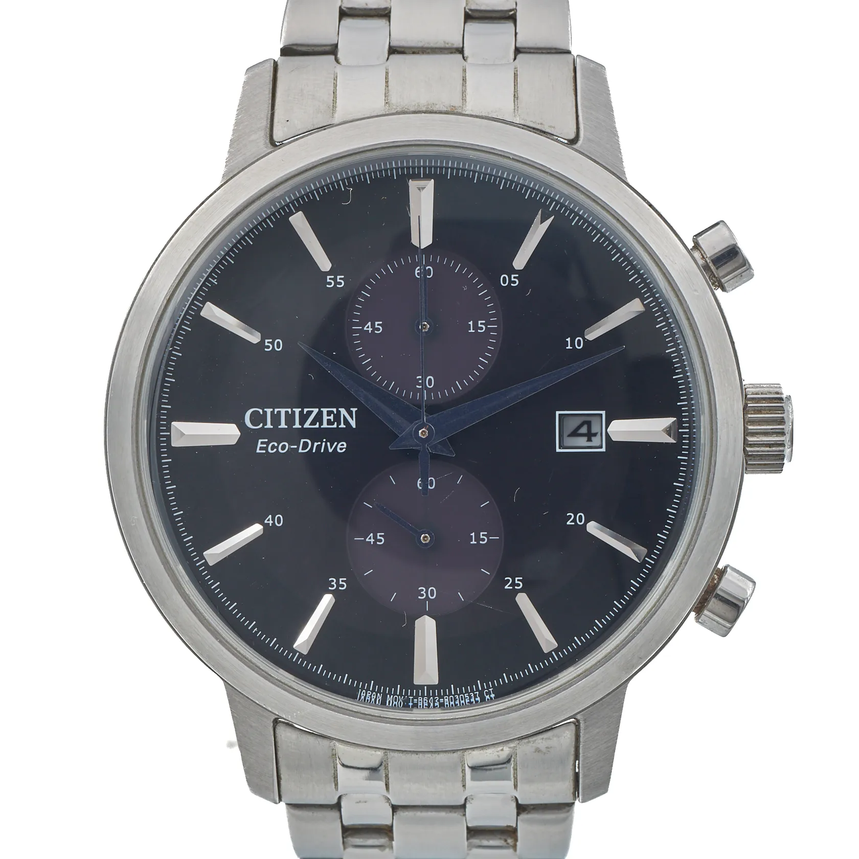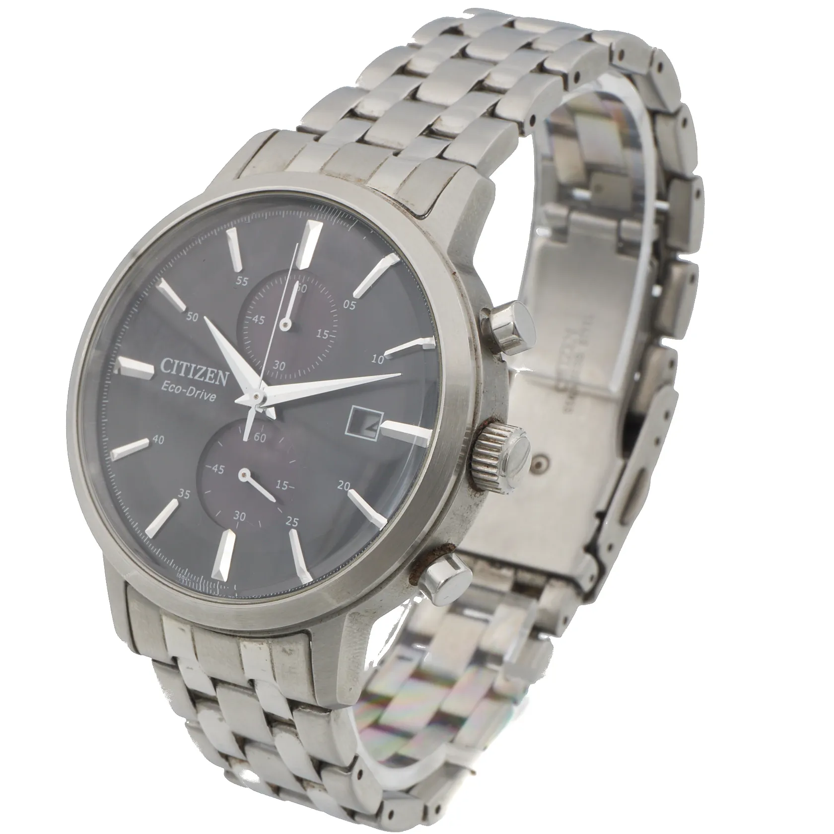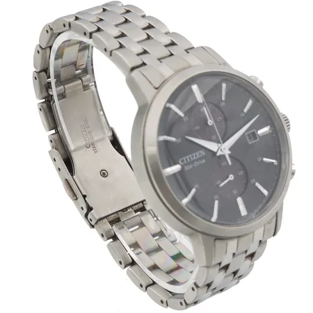 Teräsrannekello, Citizen Eco-Drive Chronograph, lasissa mikronaarmu kello viiden kohdalla, ref. CA7060-88E, quartz, rungon Ø 42mm, rannekkeen pituus 195mm