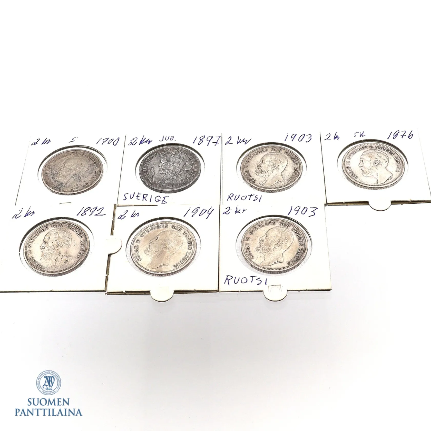 Seitsemän hopea rahaa, nimellisarvo kaksi kruunua, vuosilta1876, 1892, 1900, 1903, 1903, 1904, 1897, Ruotsi Paino: 0 g