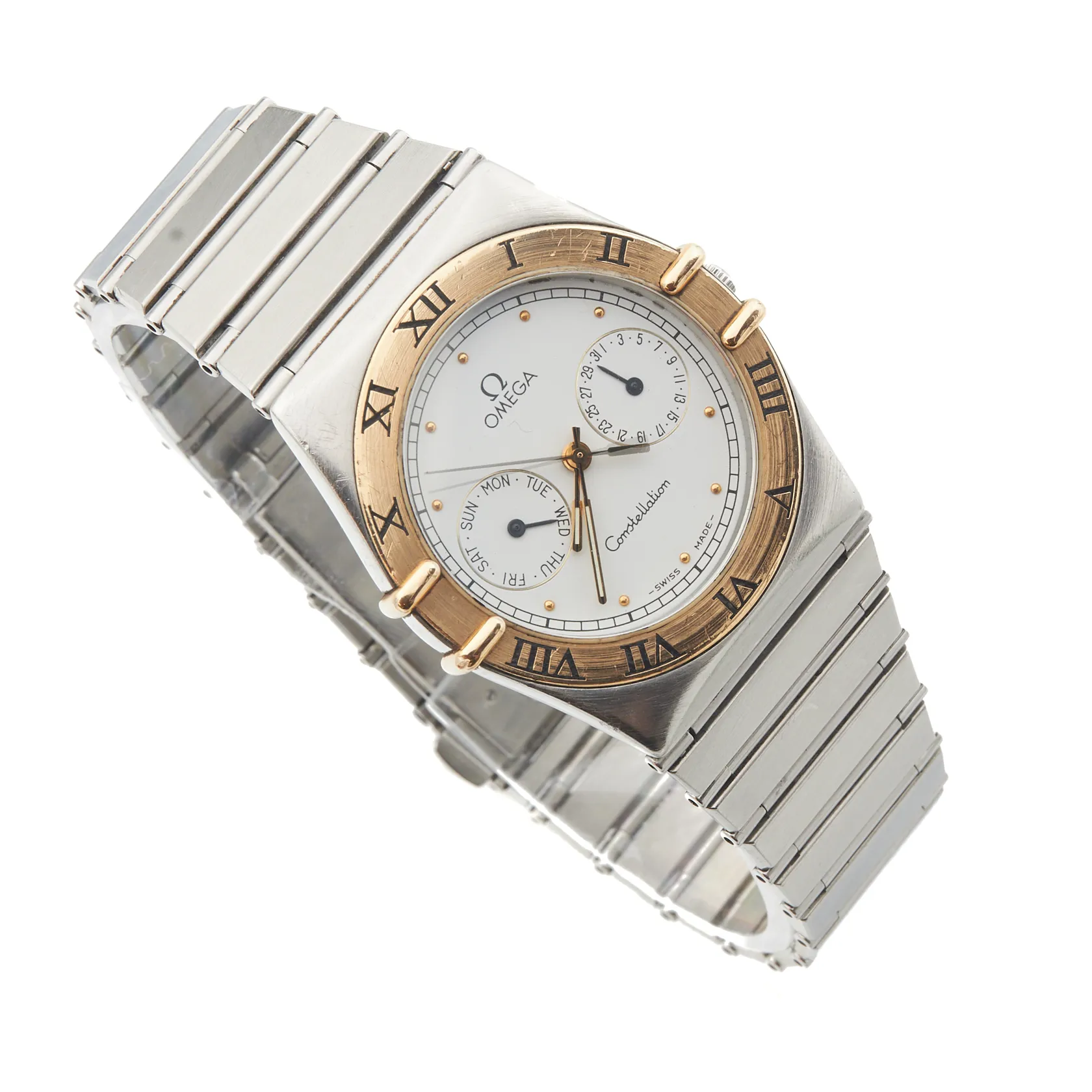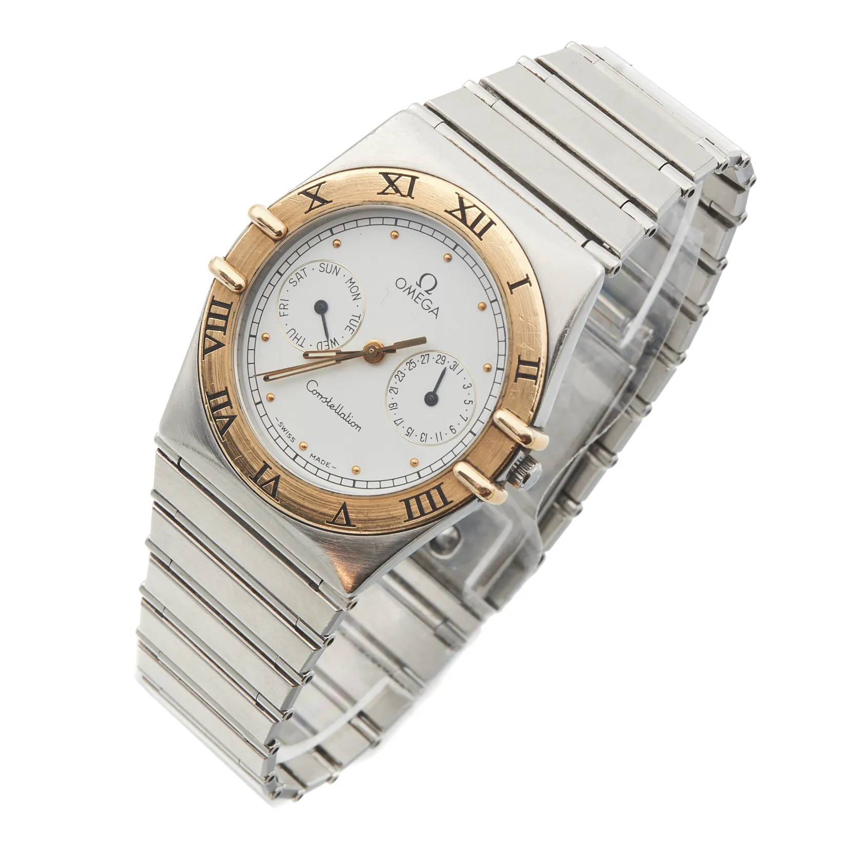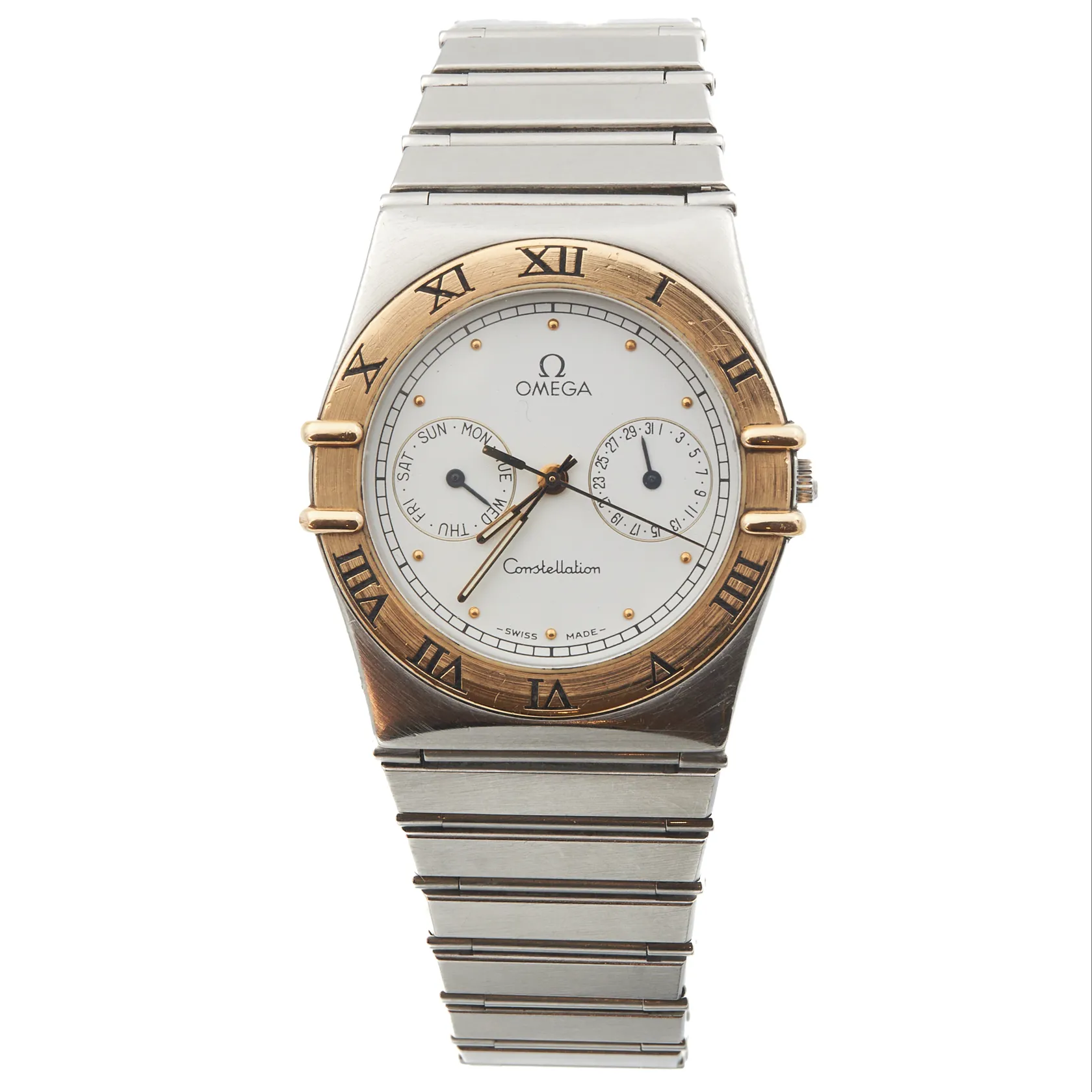 Teräsrannekello Omega, Constellation Day-Date, quartz, rungon Ø 32mm, rannekkeen pituus 195mm, käytön jälkiä