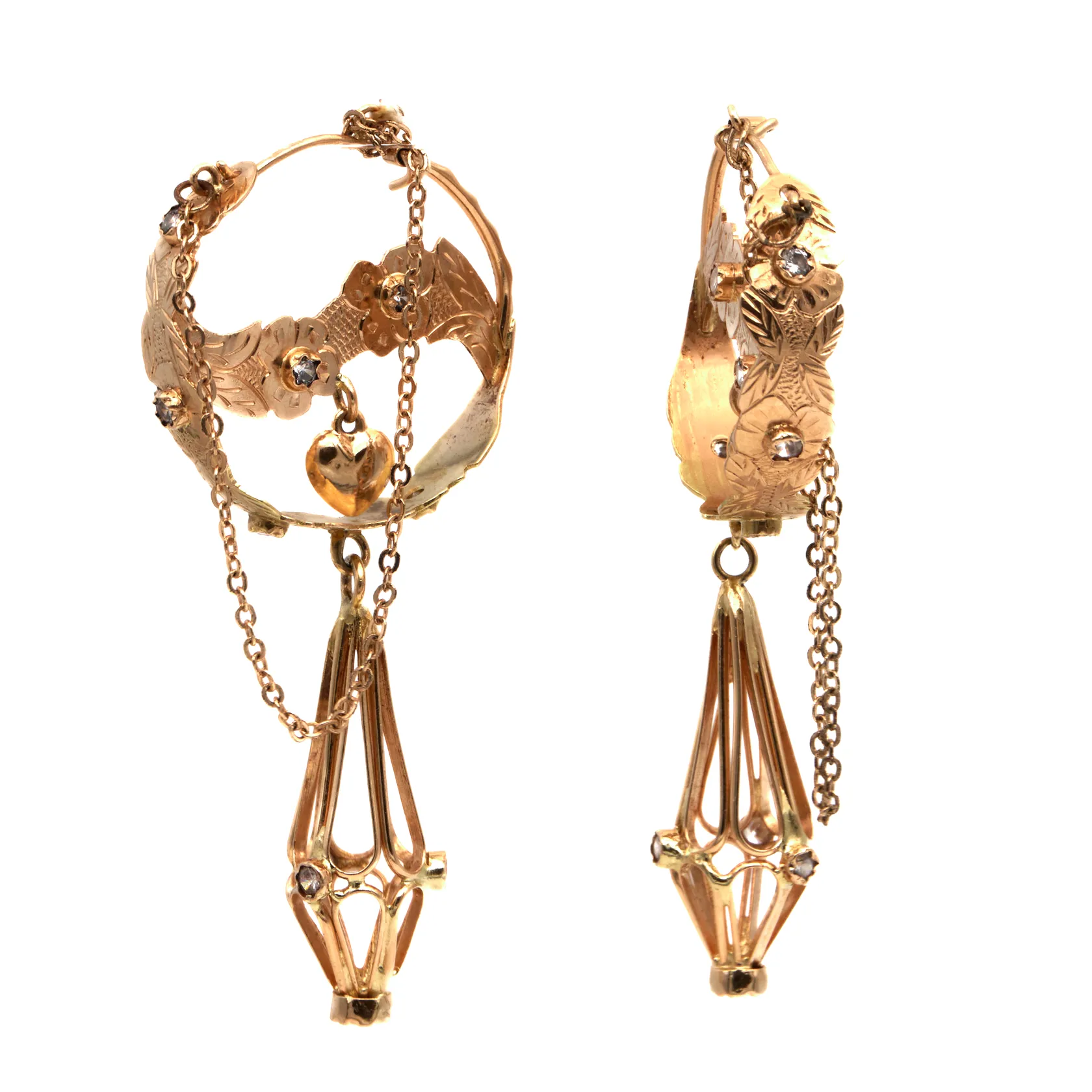 Kivikehäkorvakorut punteilla, kehän Ø 29mm, korkeus 70mm, toinen turvaketju vaatii korjausta, 585br,
