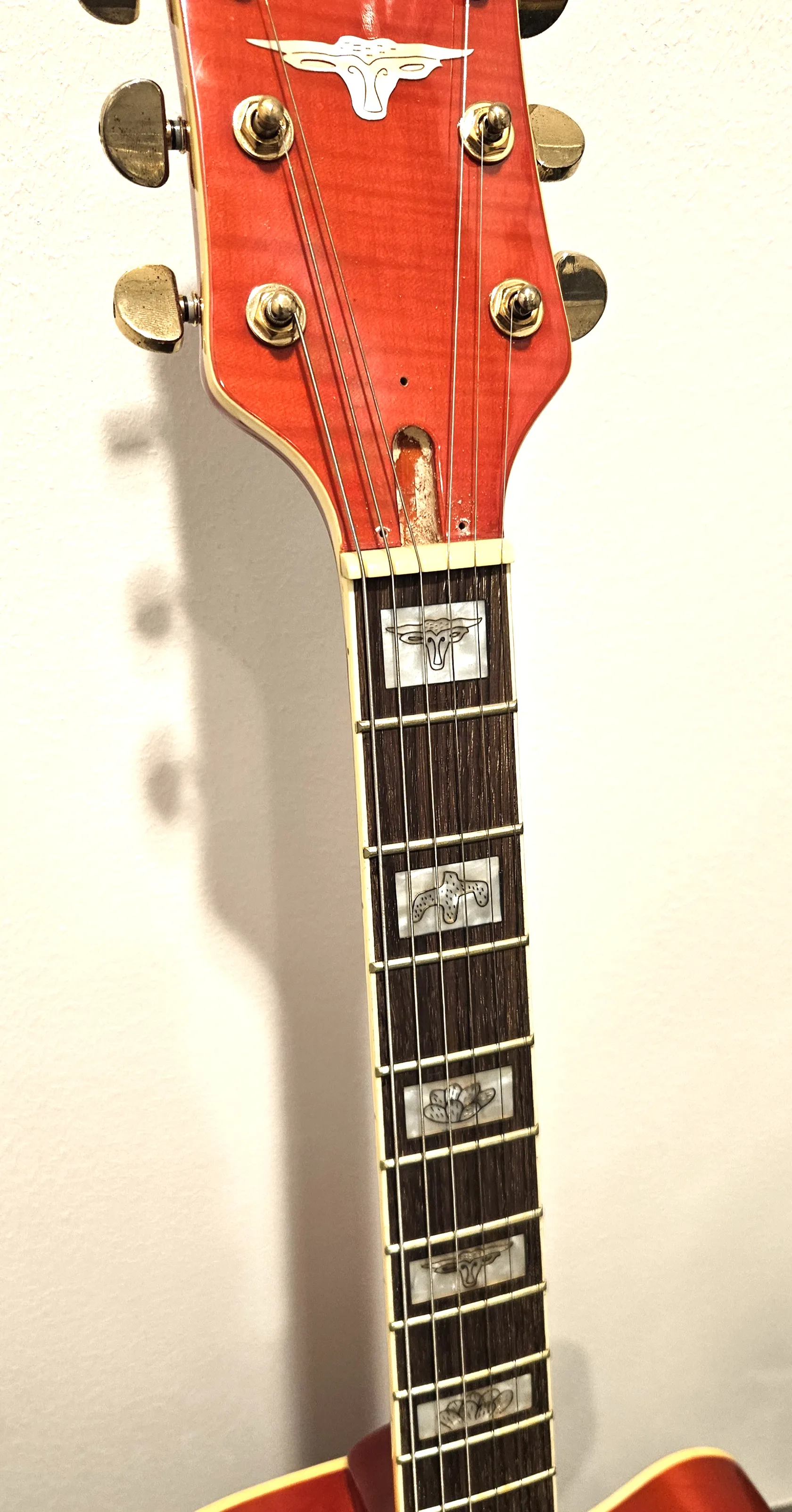 Sähkökitara, kaularaudan suojakansi puuttuu, vibra-kampi irronnut, valmistettu kiinassa, hihna, kova laukku
