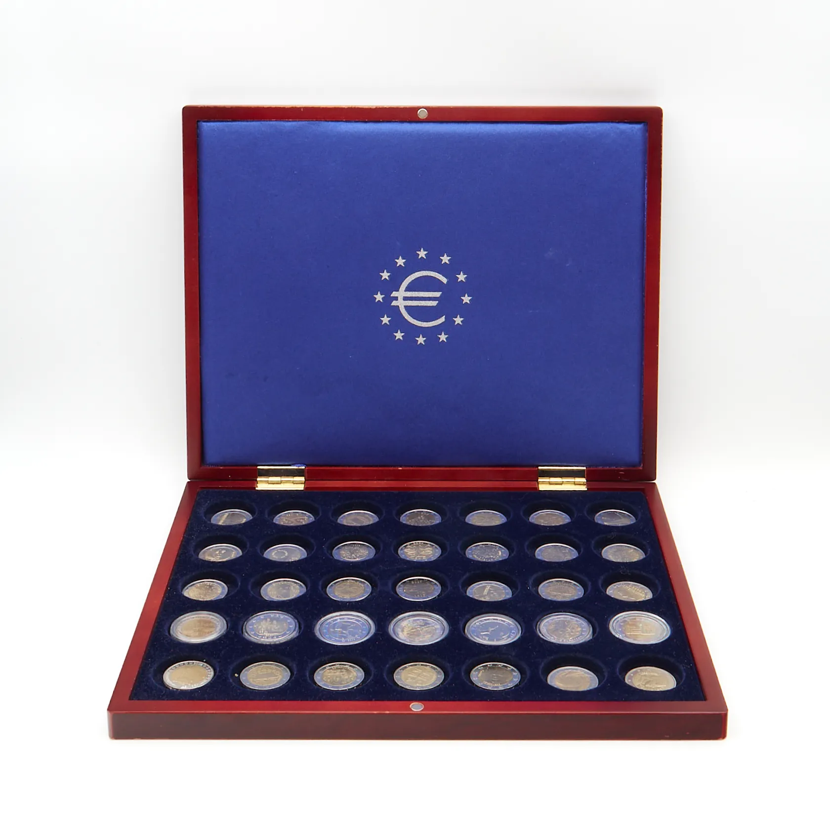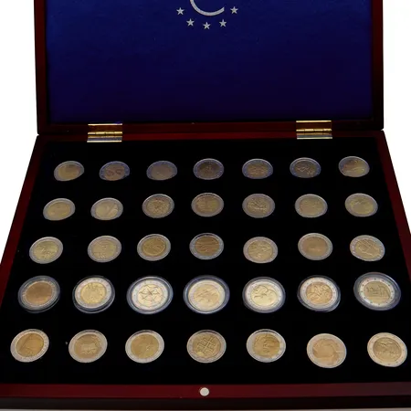 Rahakokoelma, 18 suomalaista (2002-2015) 17 ulkomaalaista juhlarahaa (Slovenia: 2007, 2009, Alankomaat: 2007, 2011, Luxemburg: 2004, 2007, Saksa: 2007, 2008, 2012, 2014, Ranska: 2011, Espanja: 2005, Italia: 2004, 2005, Latvia: 2014), nimellisarvo 70 euroa, puulaatikko.