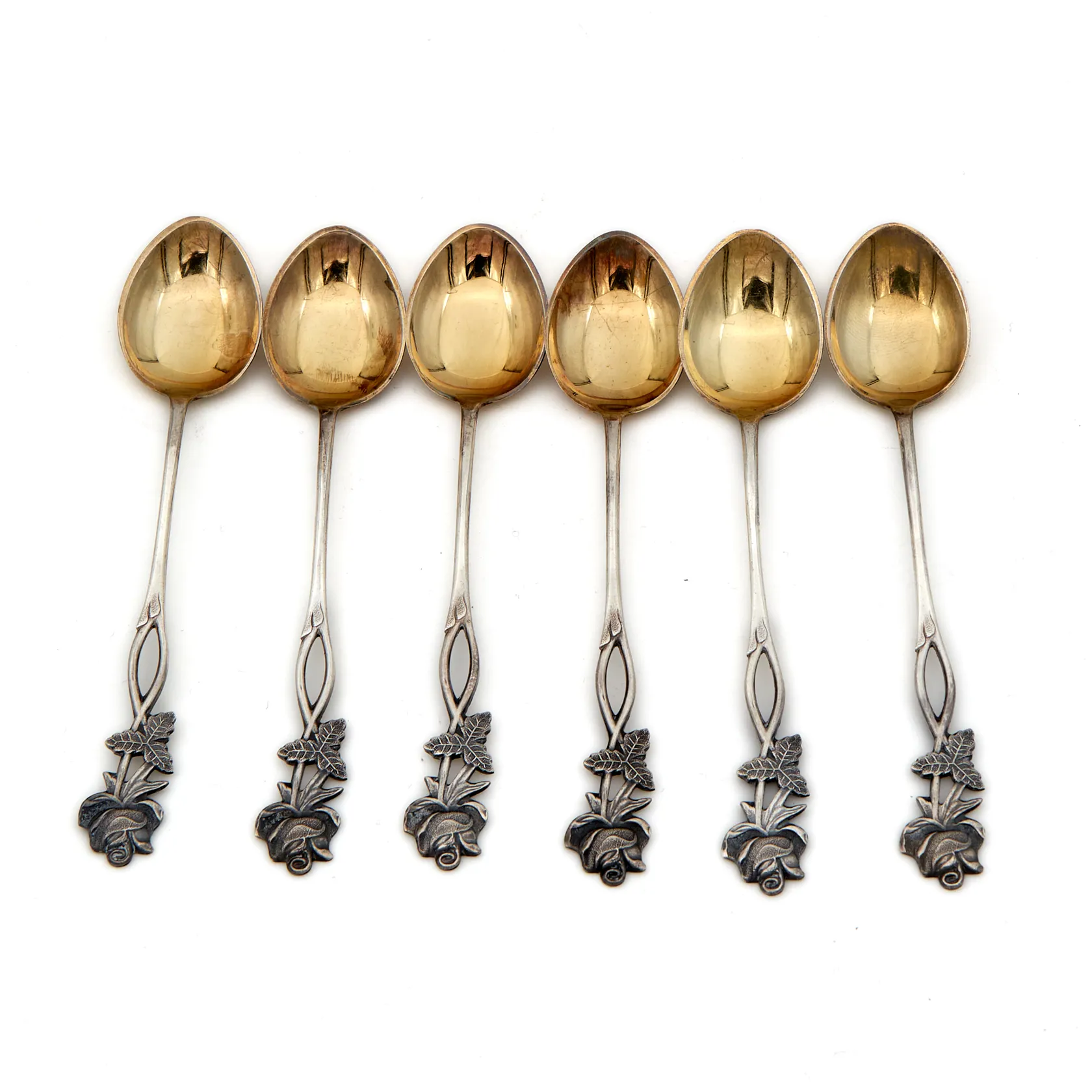 Kuusi kahvilusikkaa, kaiverrettu, Ruusu, pituus 121mm, alpakkaa