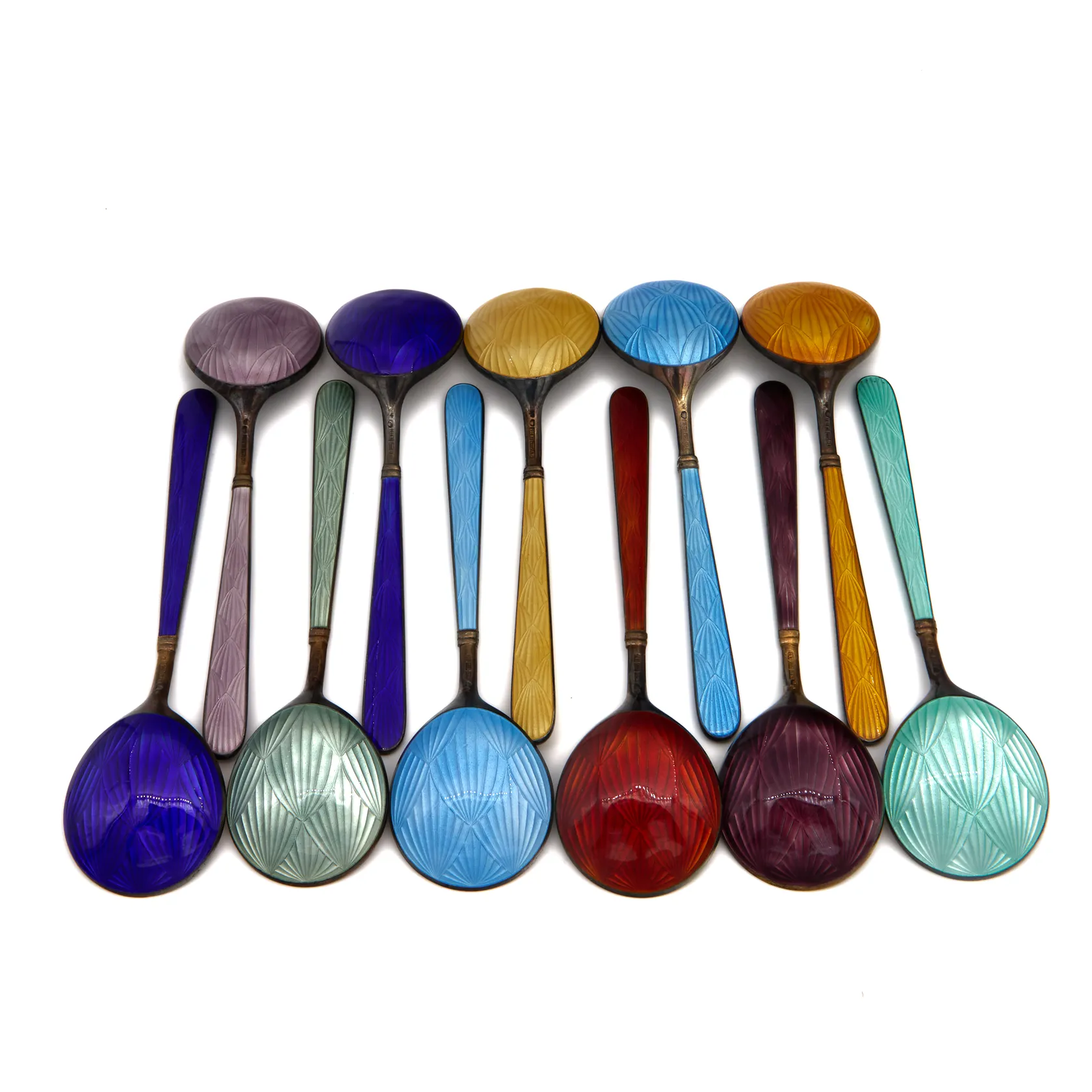 11 emaloitua kahvilusikkaa, pituus 130mm, Koruteollisuus Tillander Oy, vuodelta 1953-1954, emaloinnissa pientä kulumaa, 916br, Paino: 298,4 g