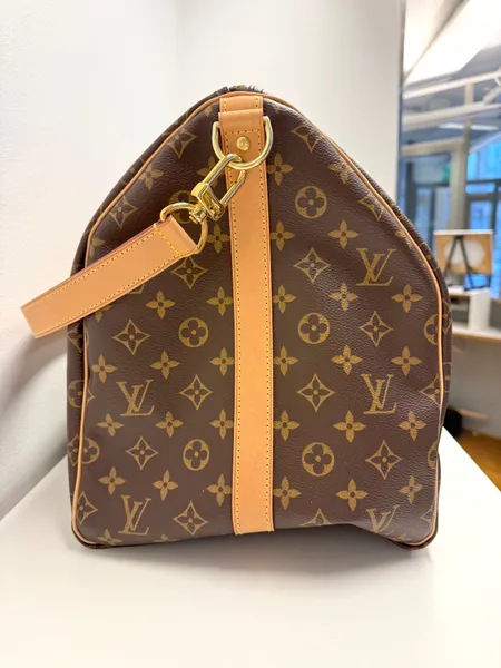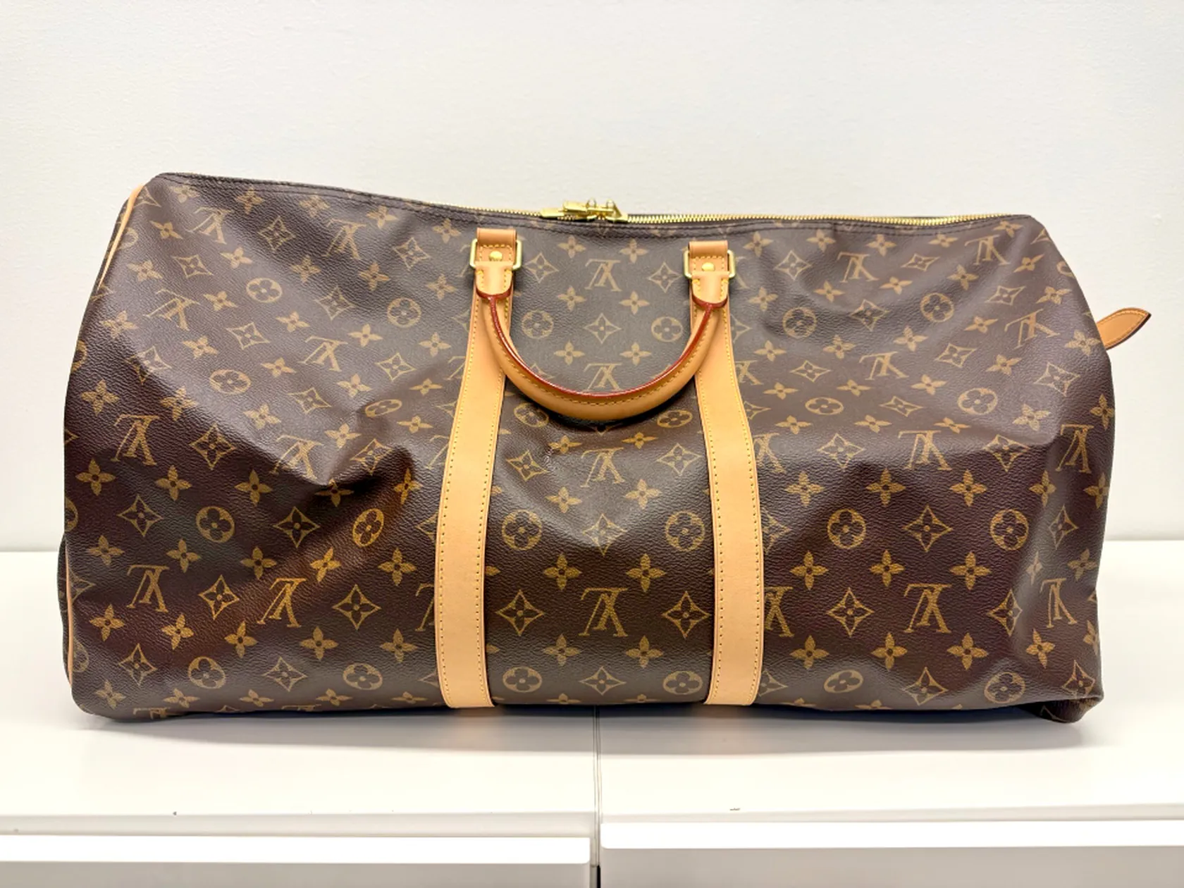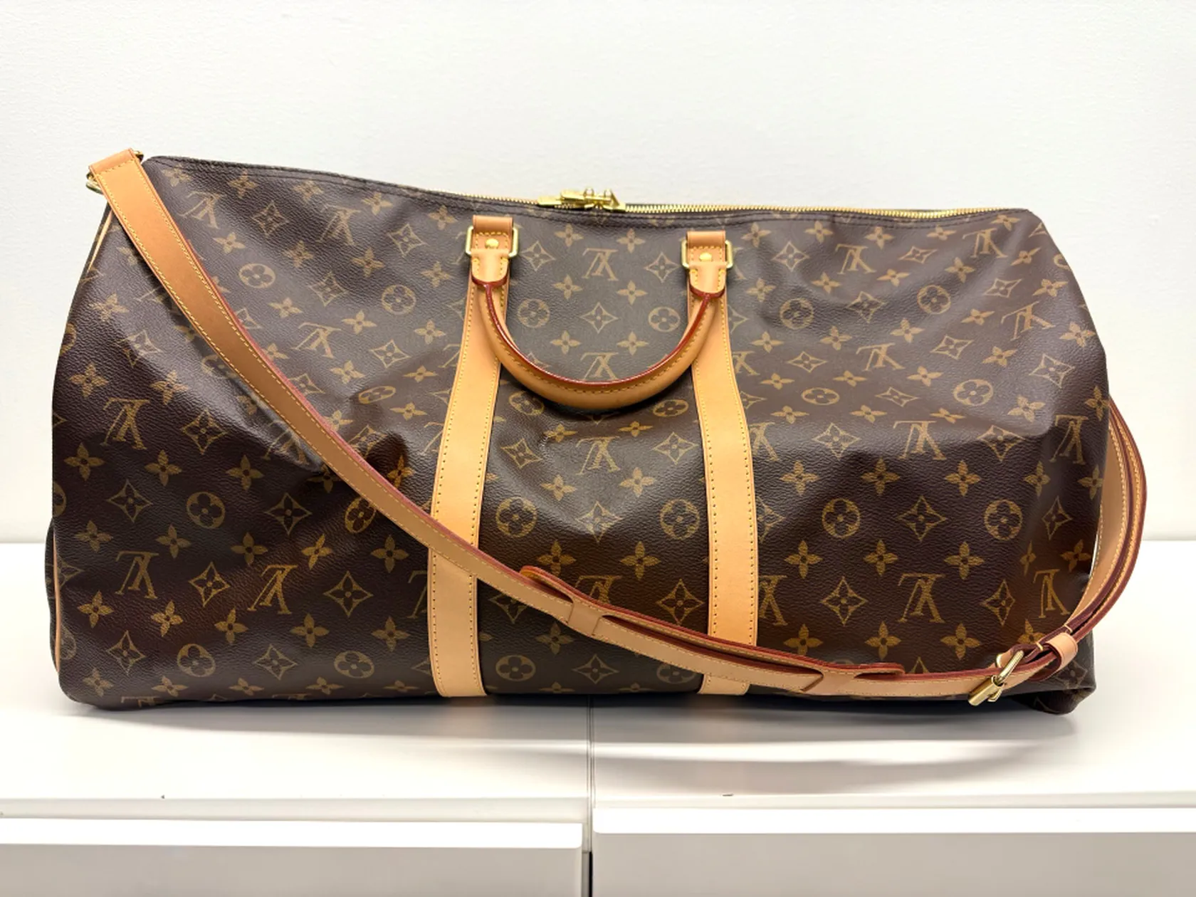 Louis Vuitton Keepall Bandoulière 55 monogram, M41414, suojapussi, keepall organizer, lukko, kaksi avainta, laatikko, ostokuitti LV Helsinki 4/22. Toisen kahvan alapuolella pieni jälki.