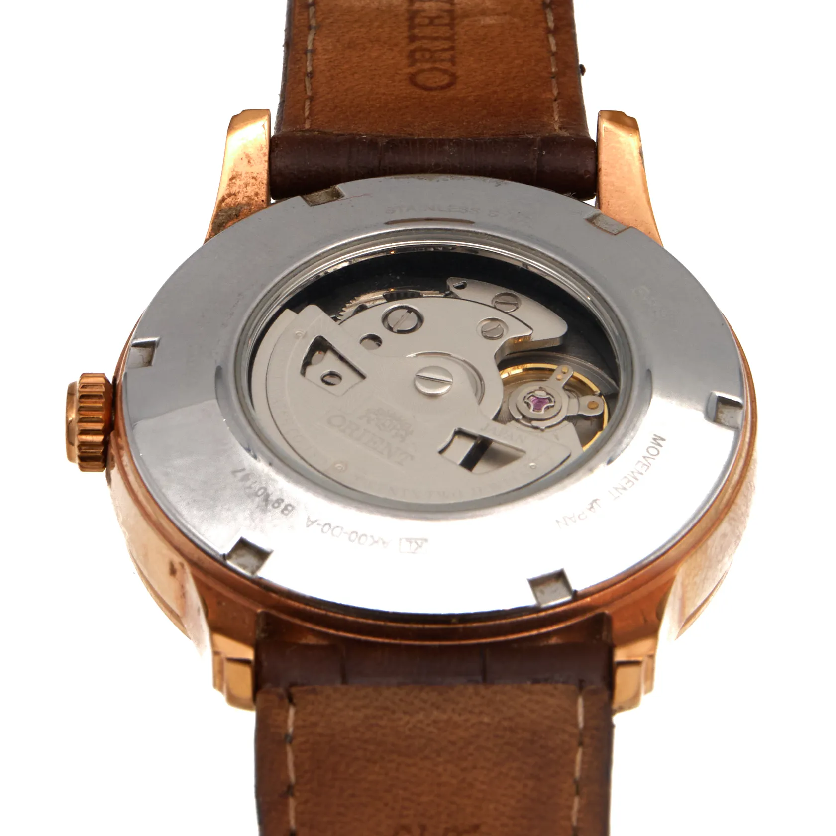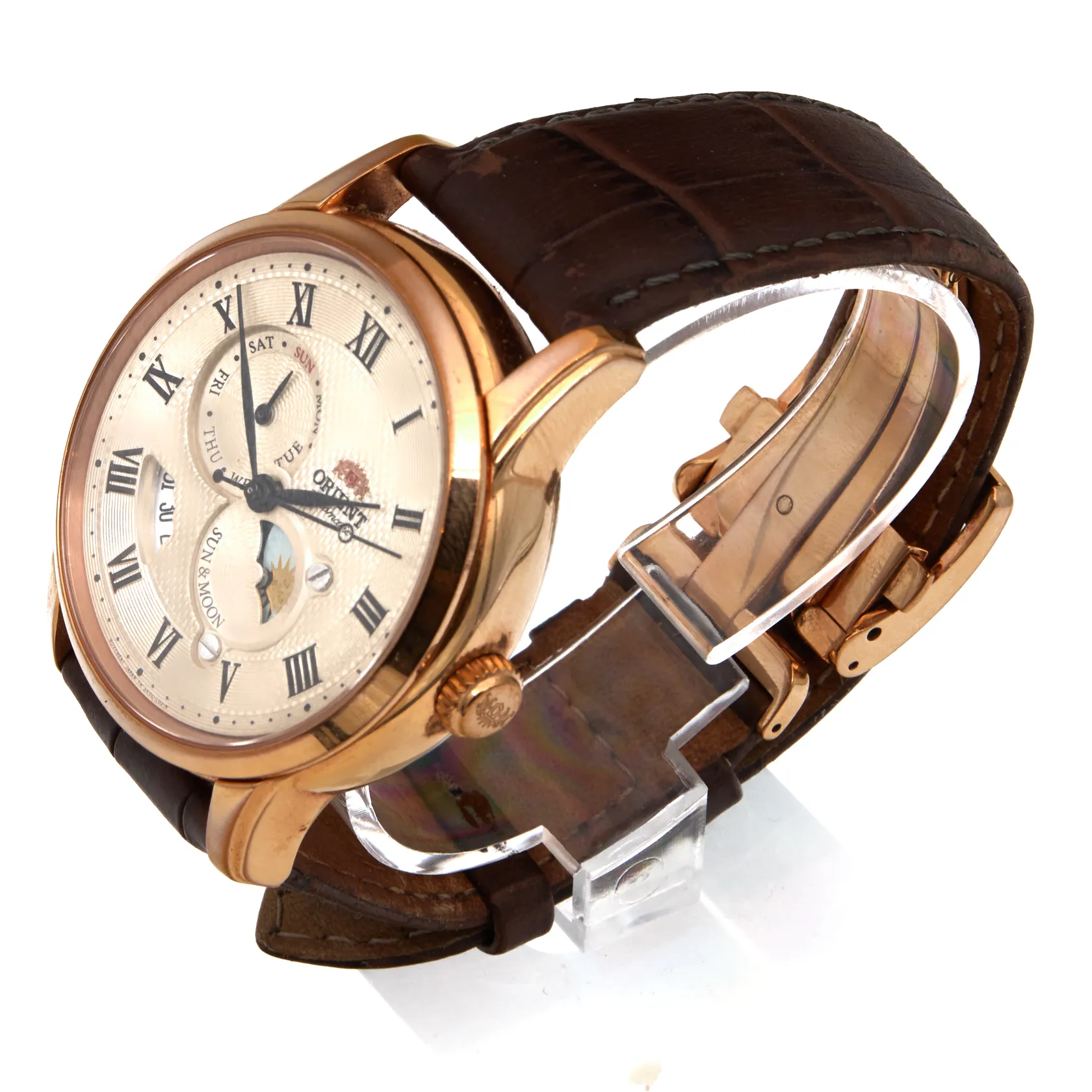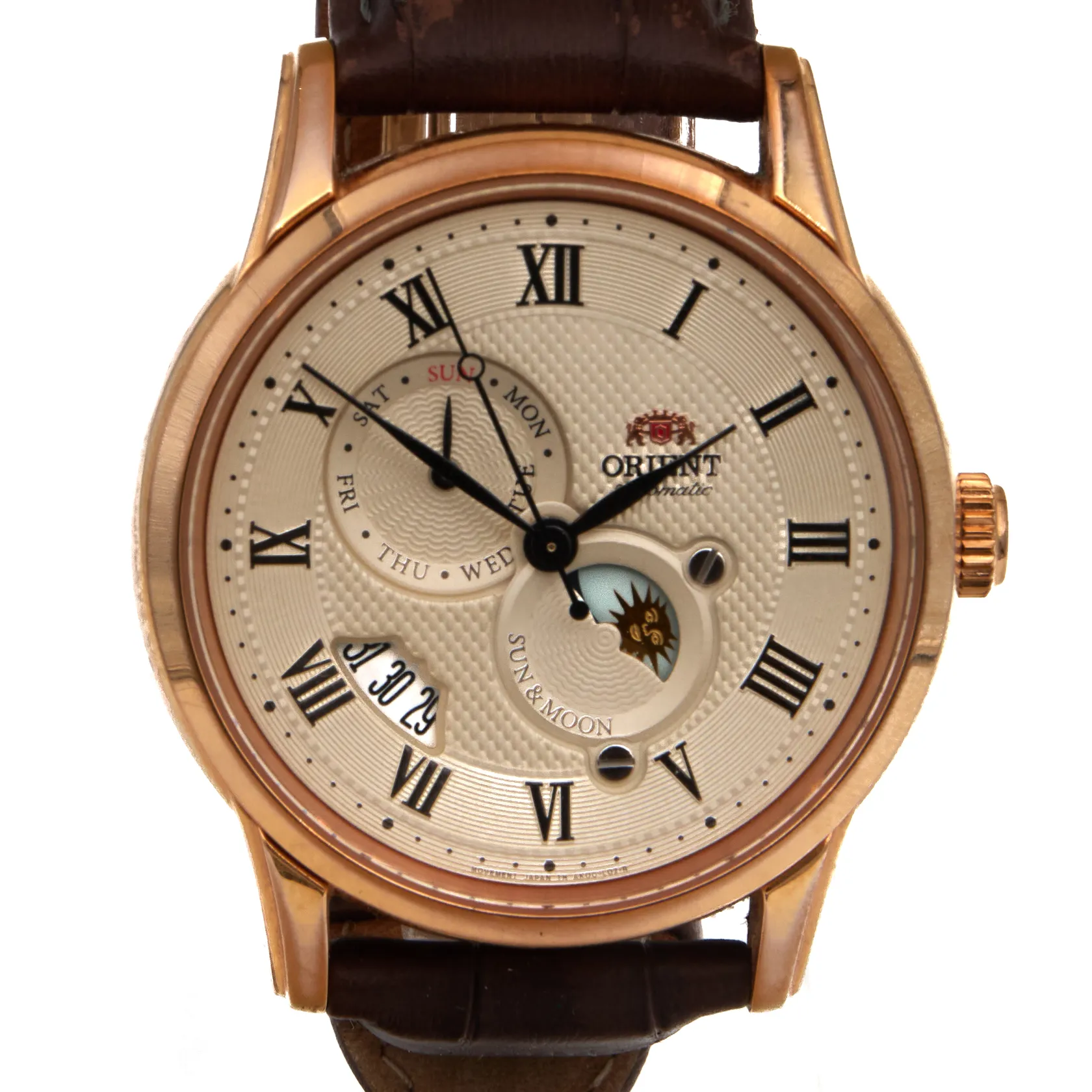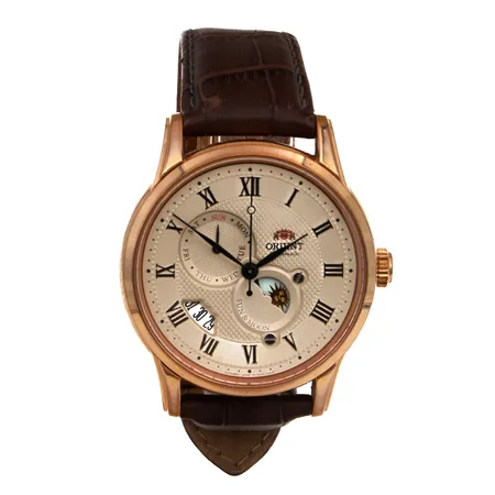 Teräsrannekello, Orient, Classic Sun & Moon, automaatti, japan movement, ref AK00-D0-A B910147, rungon Ø42.5mm, nahkarannekkeen pituus 170-220mm,