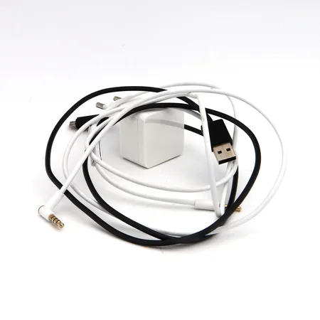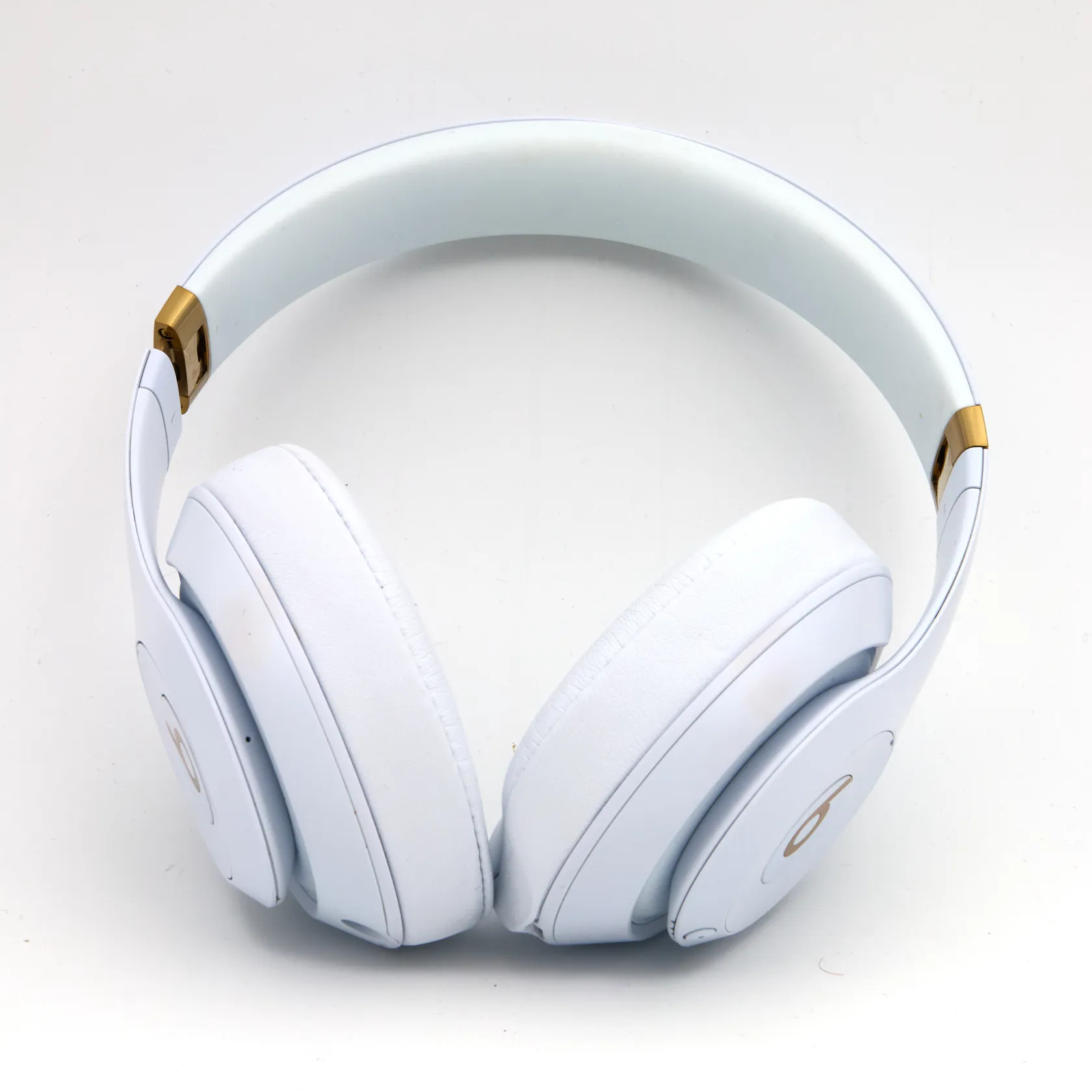 Kuulokkeet Beats Studio 3, valkoinen, laturi, 3.5mm sterokaapeli ja laatikko.