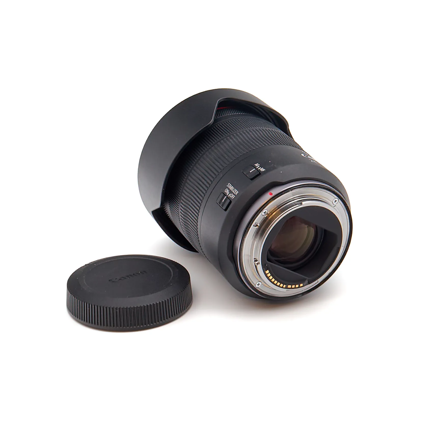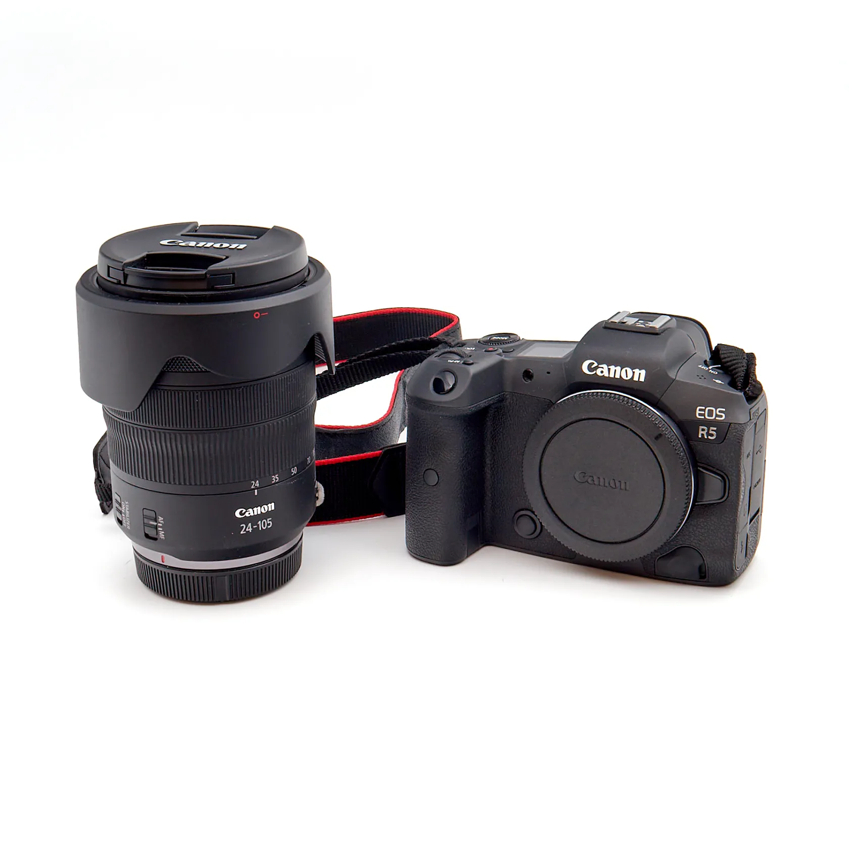 Järjestelmäkamera Canon EOS R5 ja objektiivi Canon 24-105mm F4 L IS USM 0.45m/1.48ft, sarjanumero 2764007456, mukana vastavalosuoja Canon EW-83N ja objektiivin säilytyspussukka.