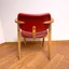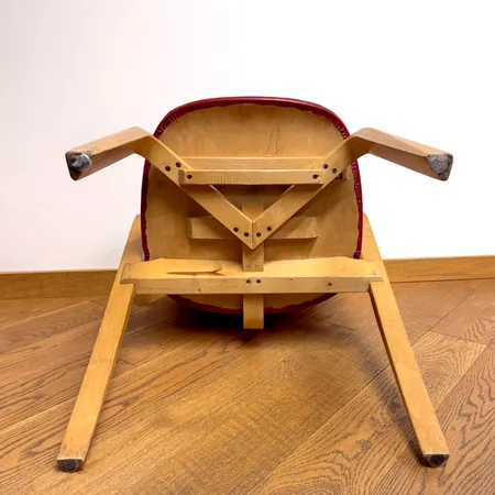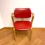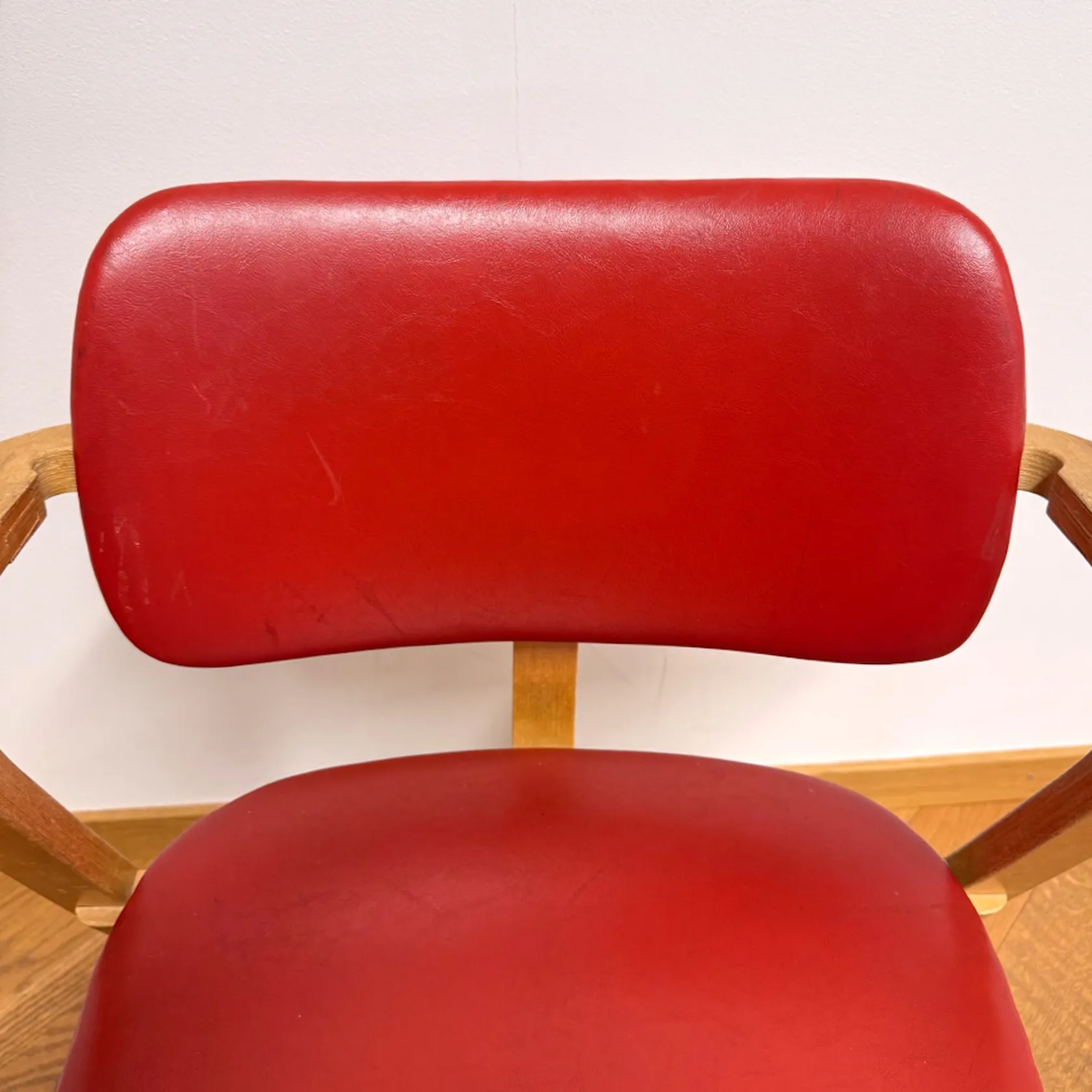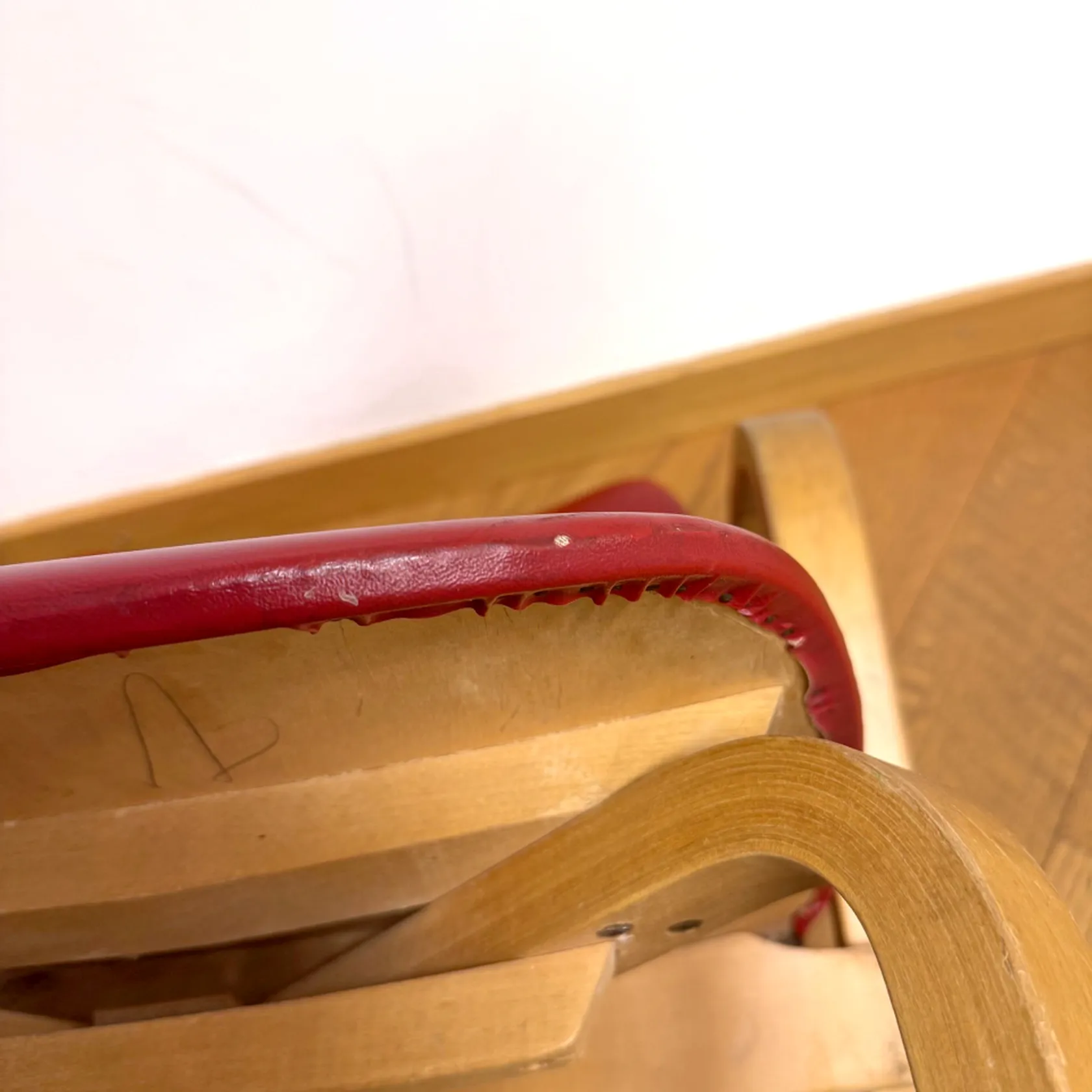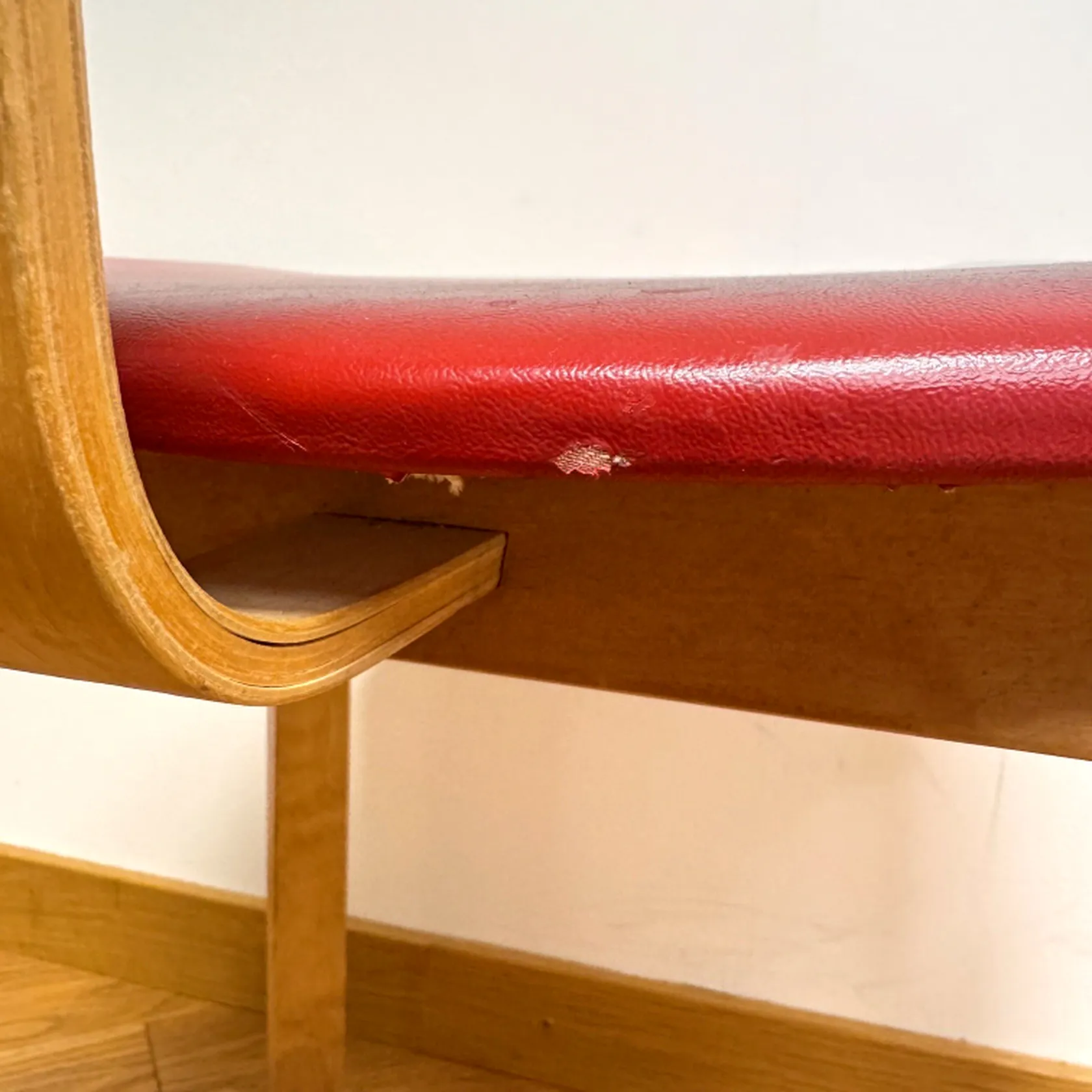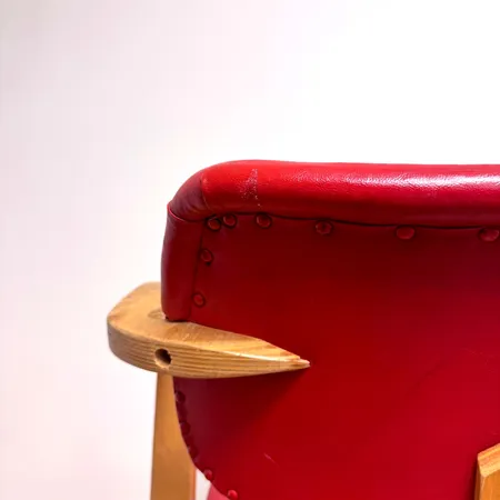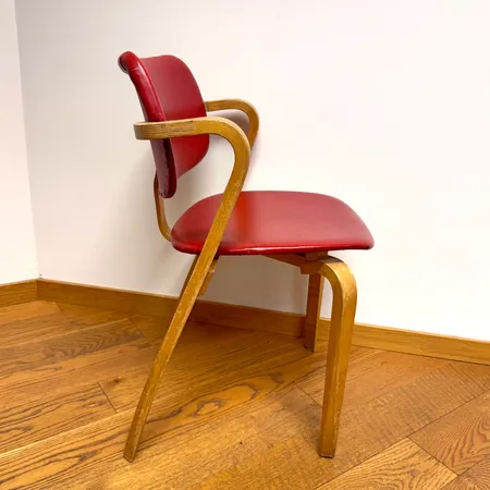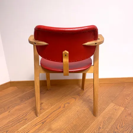 Tuoli Aslak, design Ilmari Tapiovaara, korkeus 74cm, istuinkorkeus 46cm, koivurunko, istuin ja selkänoja keinonahkaa, valmistettu 1960-luvulla, käytöstä aiheutunutta kulumaa.