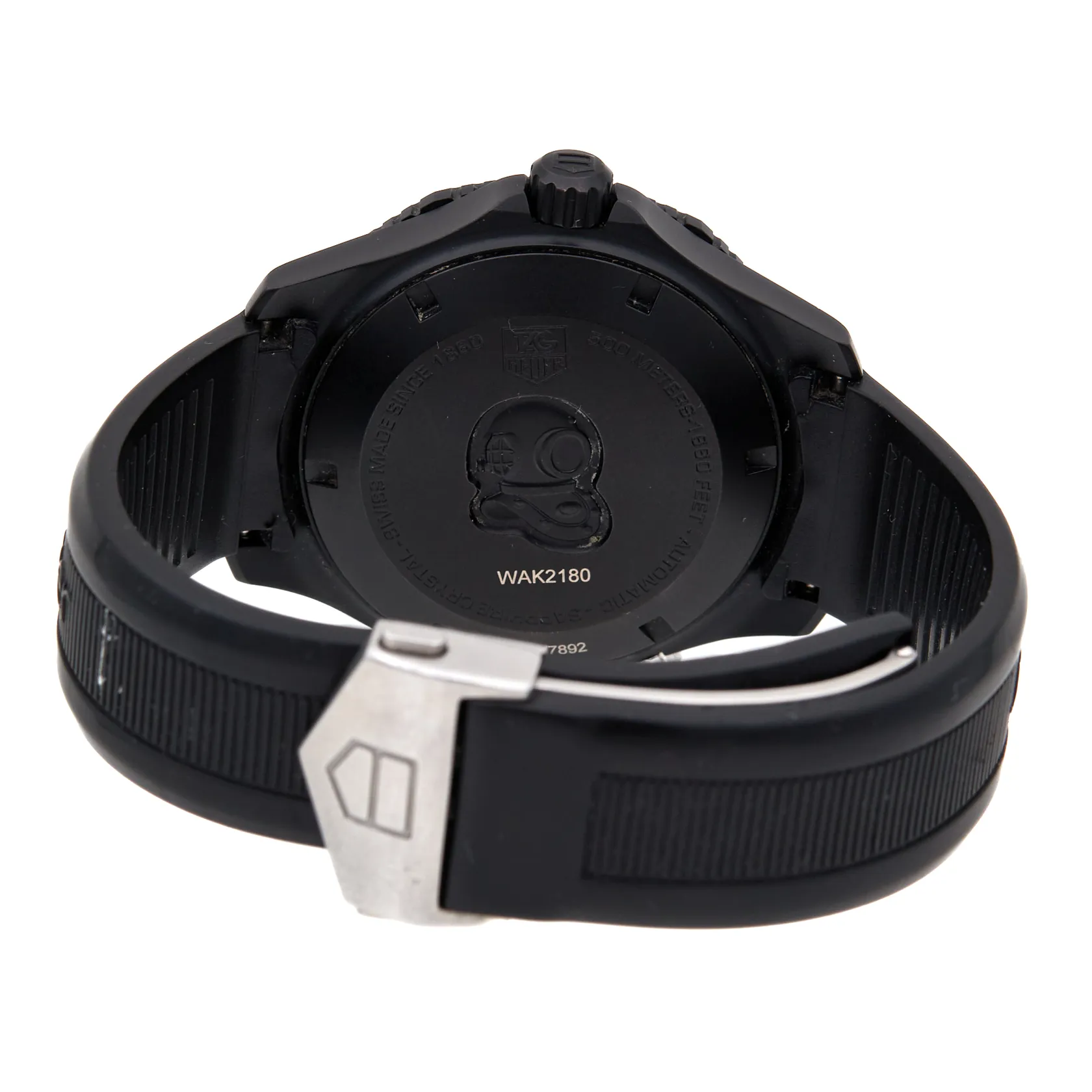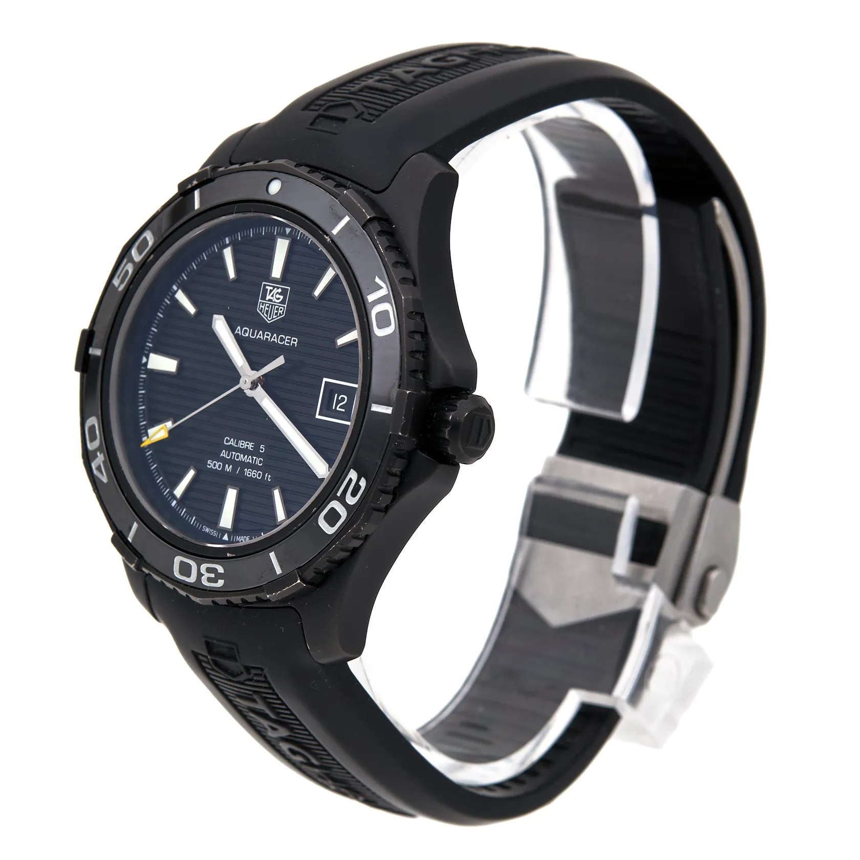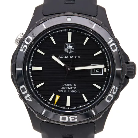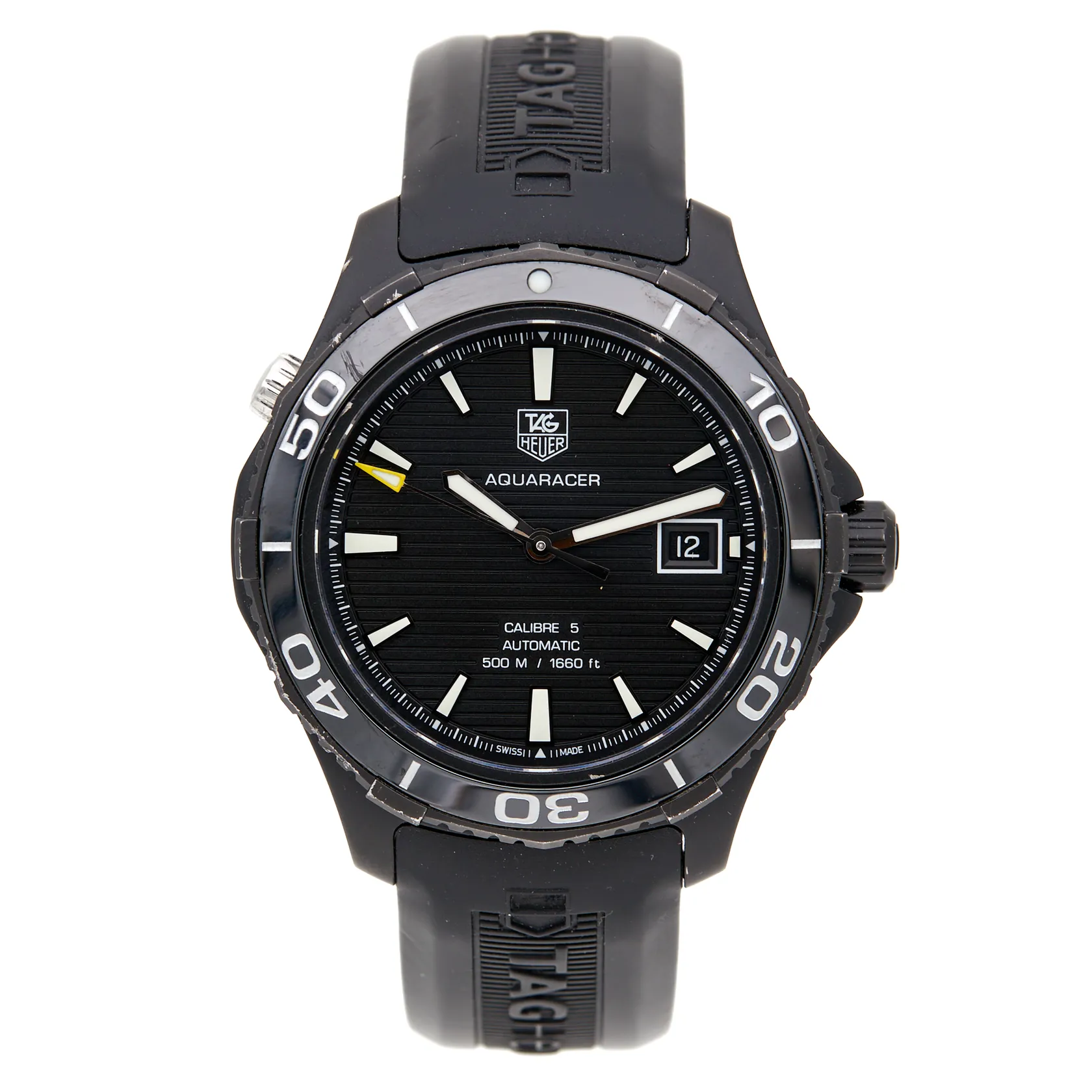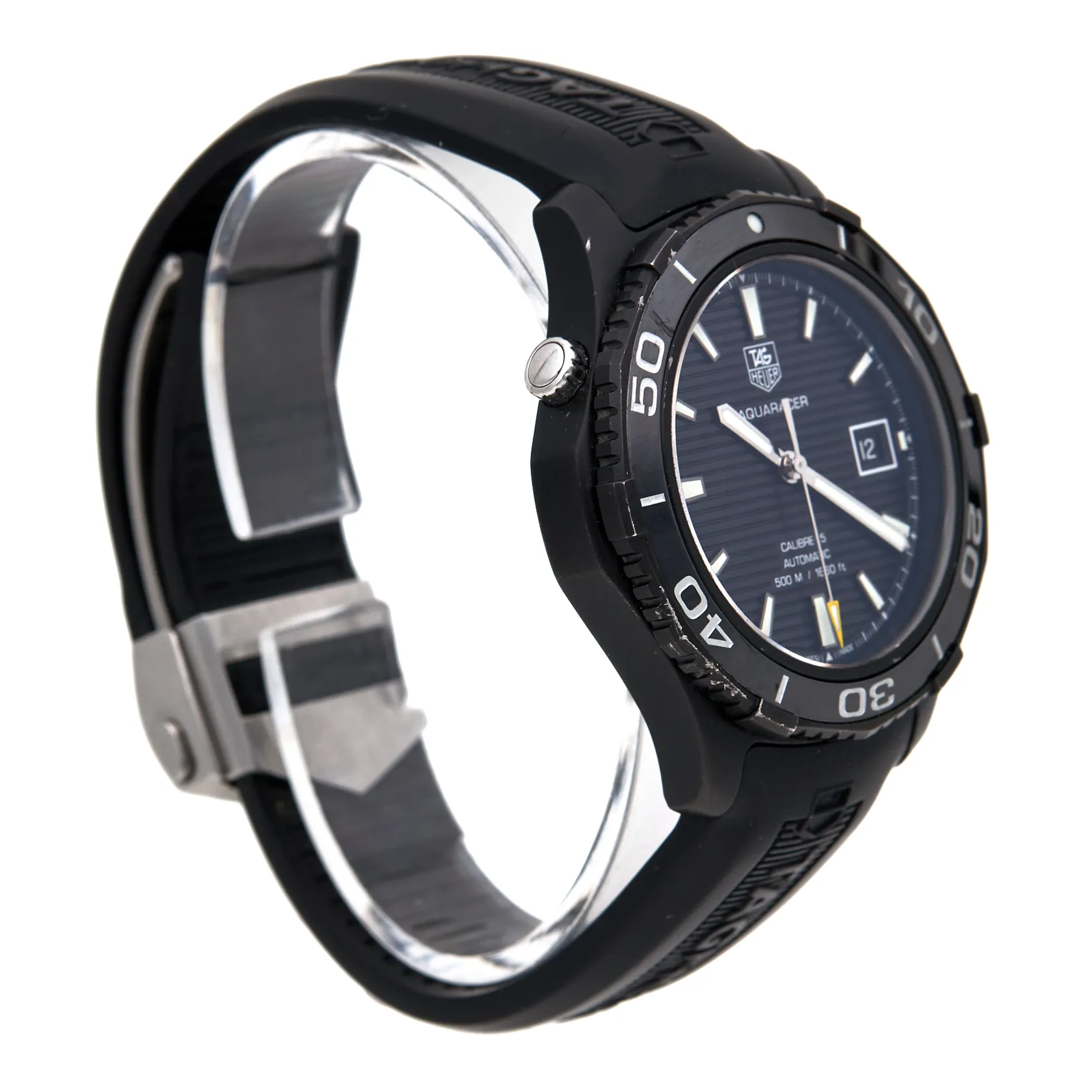 Titaanirannekello, Tag Heuer, Aquaracer 500M, automaatti: Calibre 5, rungon Ø 41mm, ref. WAK2180.FT6027, sr. PZVM-QMSC-BSWT, kumiranneke, kehässä ja rungossa käytön jälkiä, takuukortti ja laatikko
