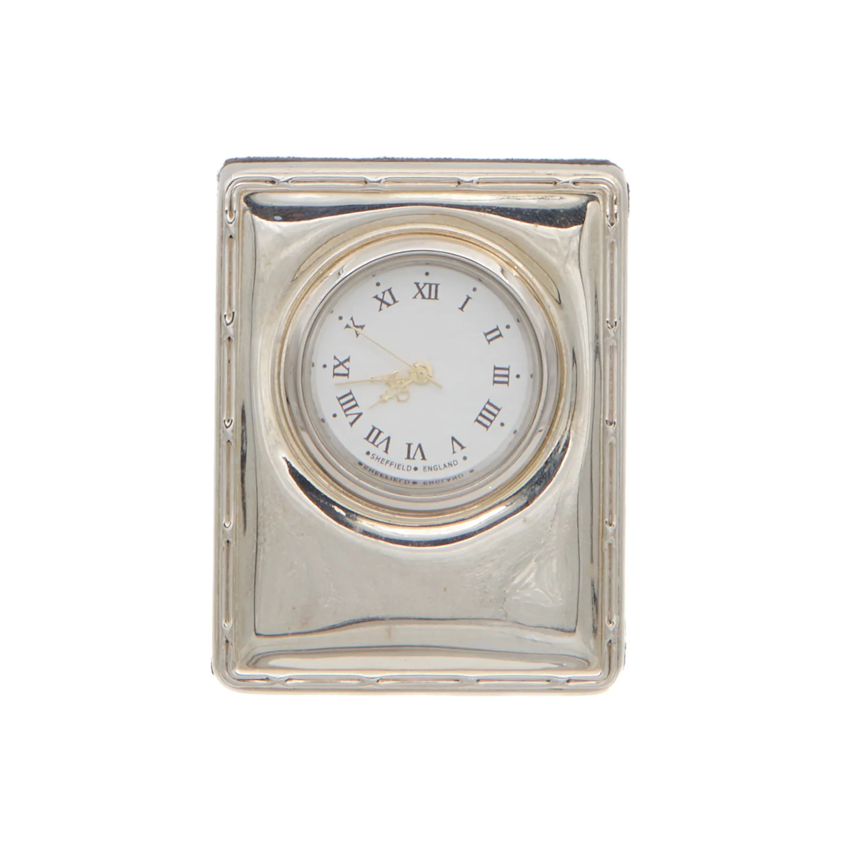 Hopeinen pieni pöytäkello, Sheffield - England, mitat 52x66mm, Quartz:paristo loppunut, 925br, Paino: 65,6 g