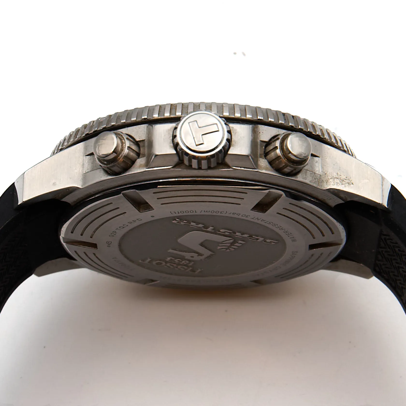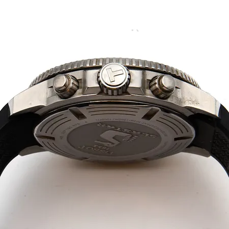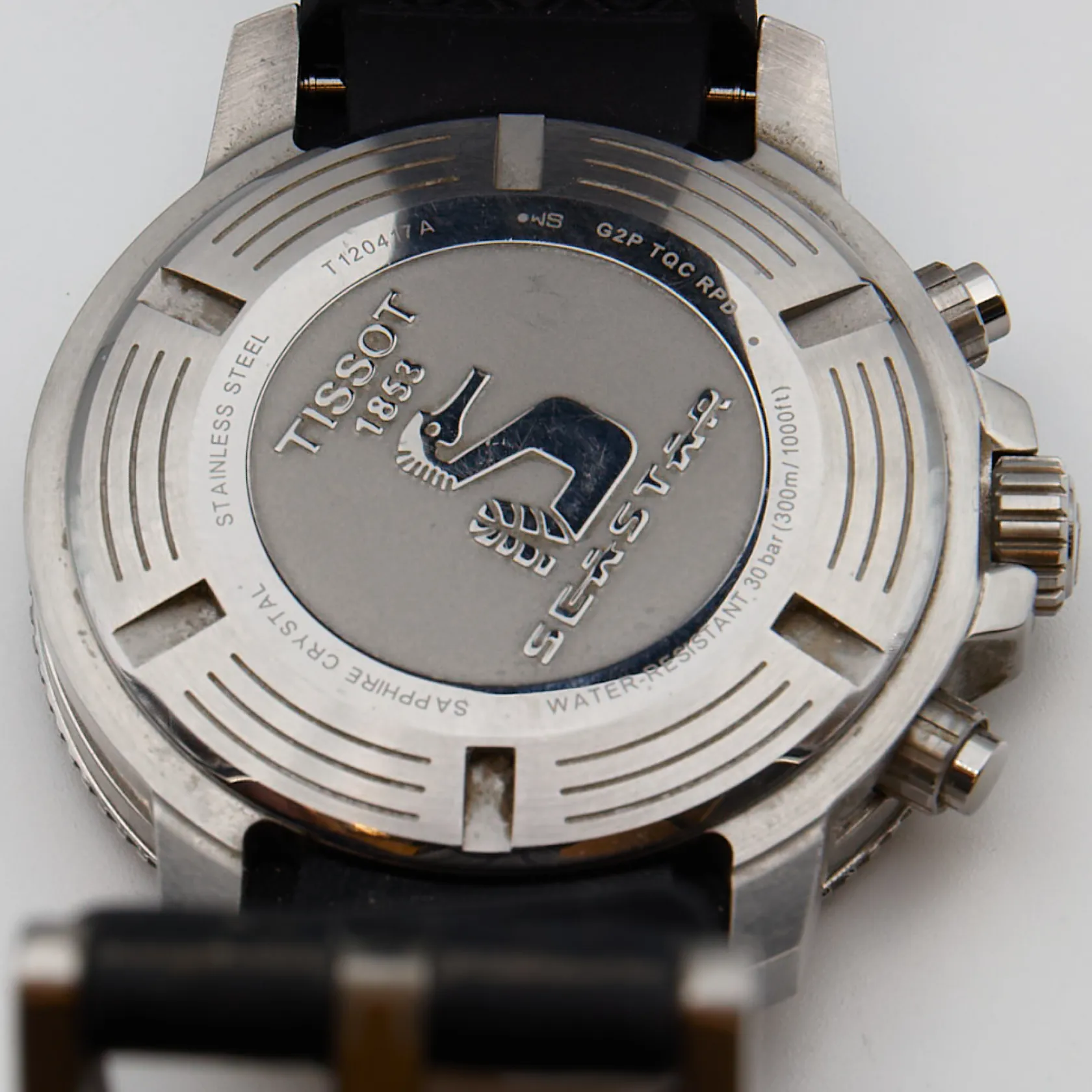 Teräsrannekello Tissot Seastar kumirannekkeella, quartz, chronograph, Ø 45mm, pituus 160-210mm, takuukortti; ostettu 6.5.2022, ja säilytyskotelo.