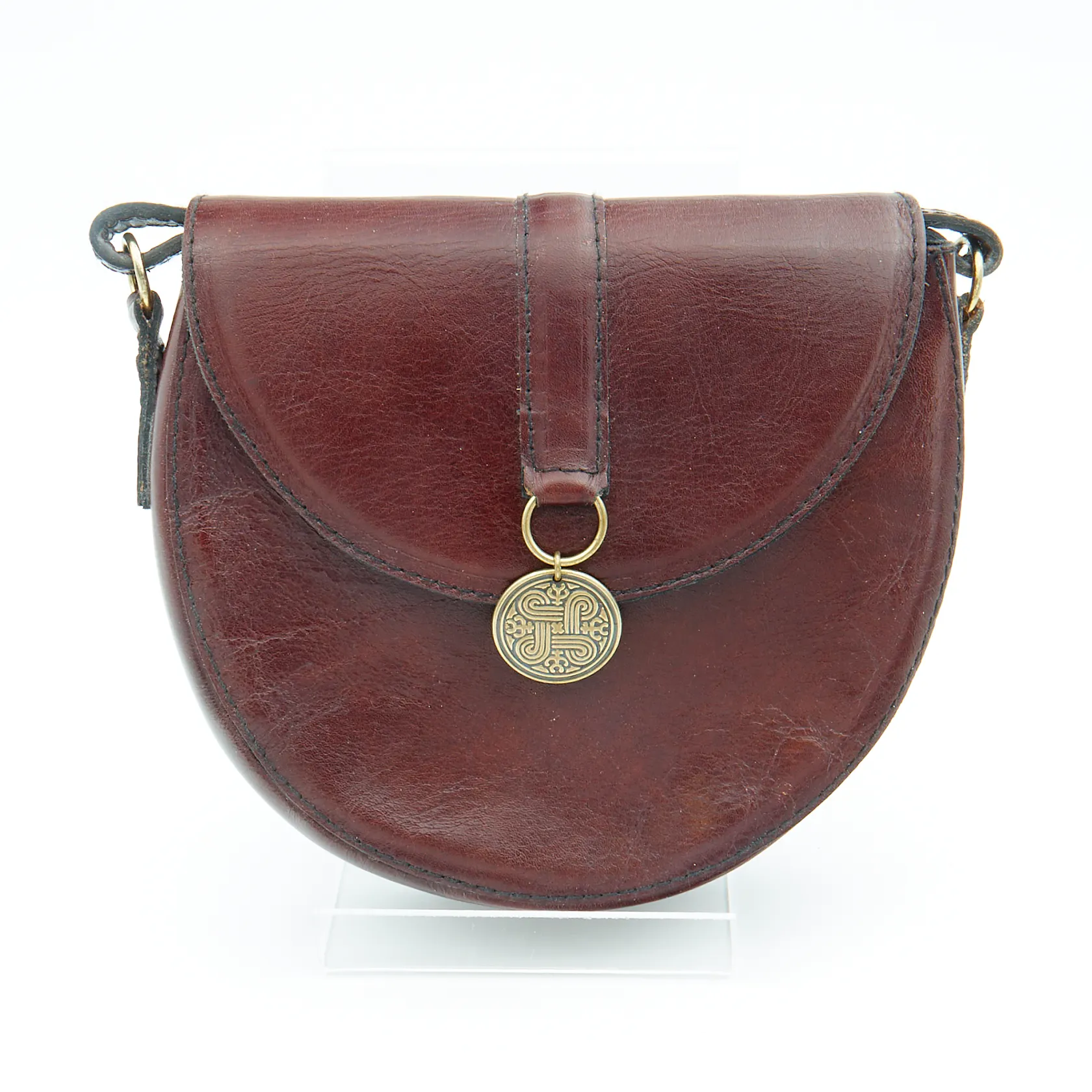 Nahkainen käsilaukku, Kalevala Koru -aiheinen, korkeus 180mm, leveys 180mm, syvyys 40mm, pientä käytöstä aiheutunutta kulumaa.