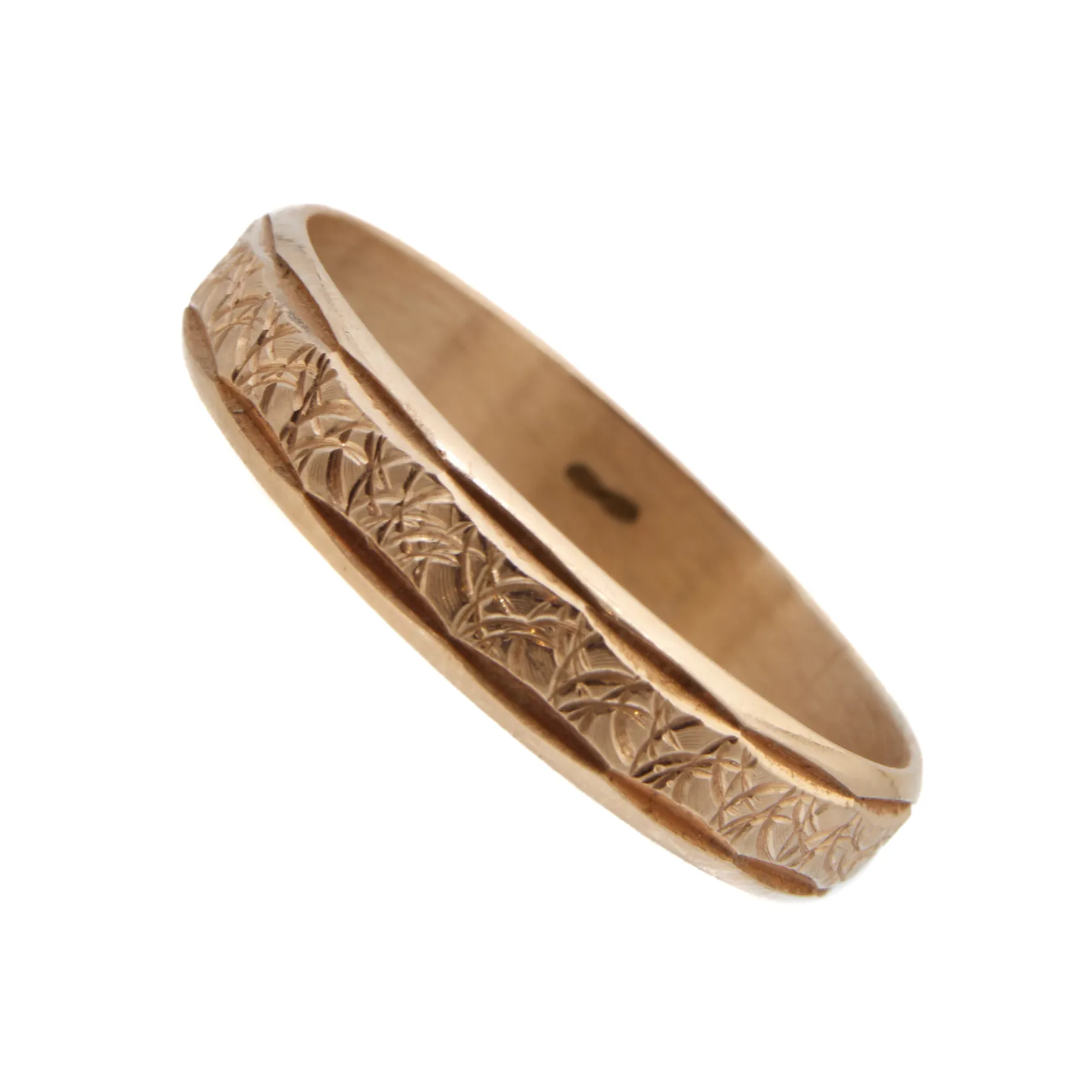 Kuvioitu sormus, koko 18, kaiverrettu, rungossa pientä vääntymää, 585, Paino: 2,5 g