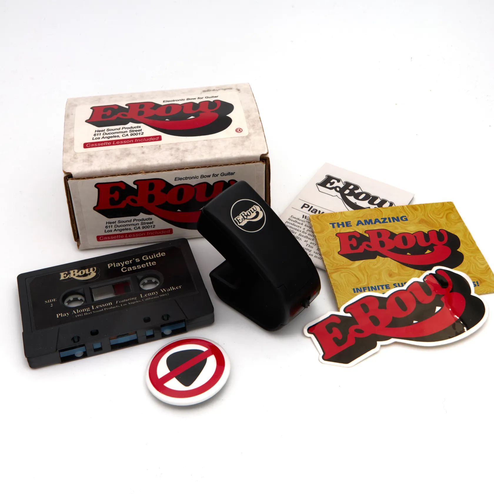 Sähköjousi E-Bow, mukana manuaali, rintamerkki, esite, tarra, kasetti, pussi ja laatikko