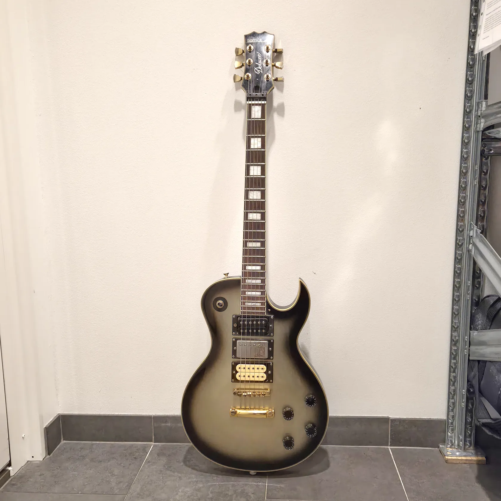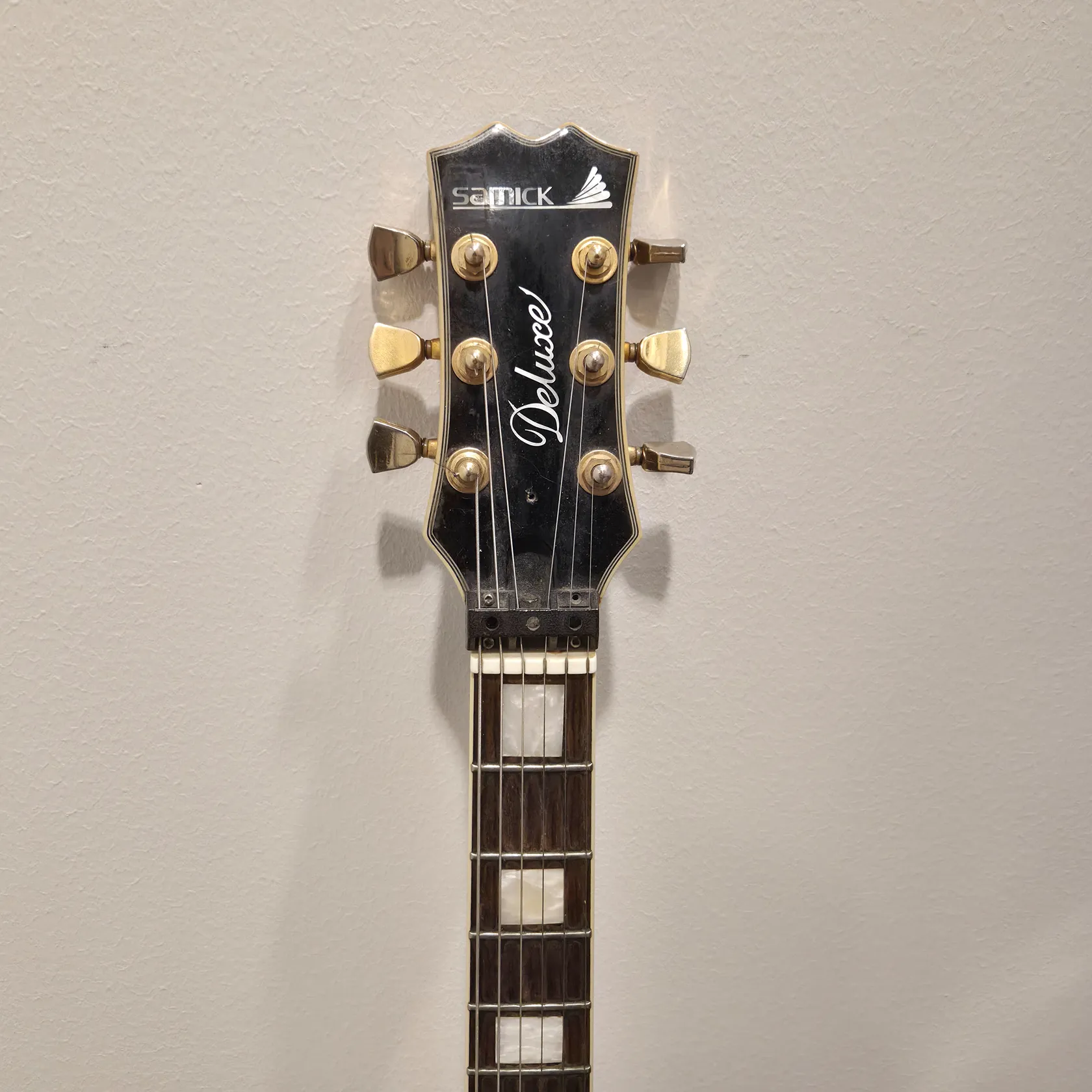 sähkökitara samick deluxe, käytön jälkiä, kolhuja, plektrasuoja puuttuu, pehmeä laukku