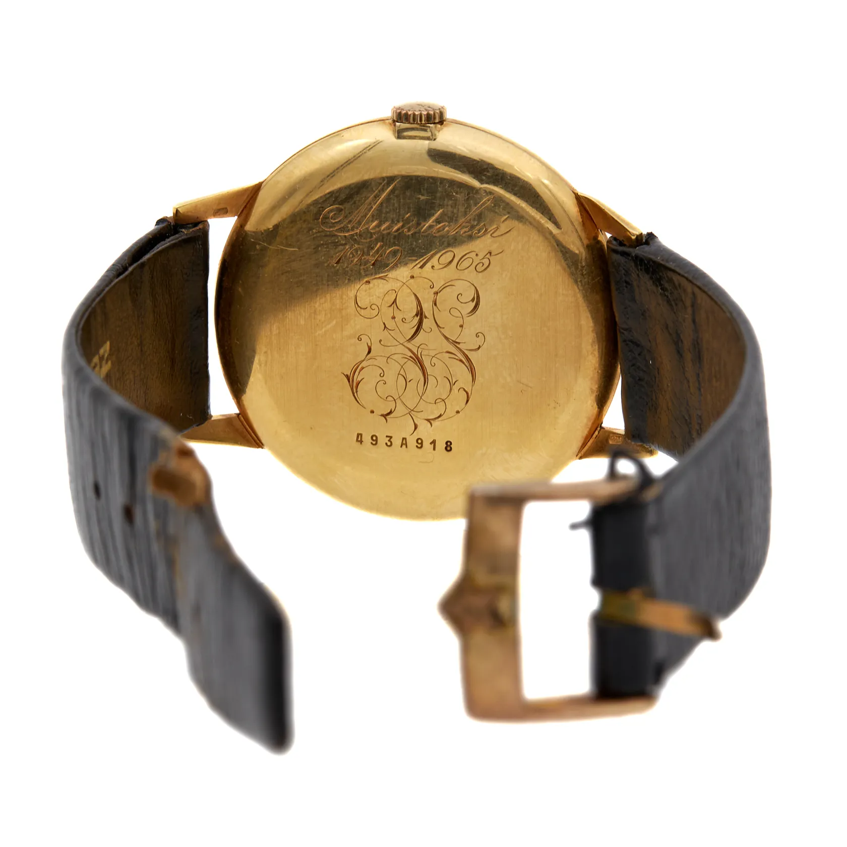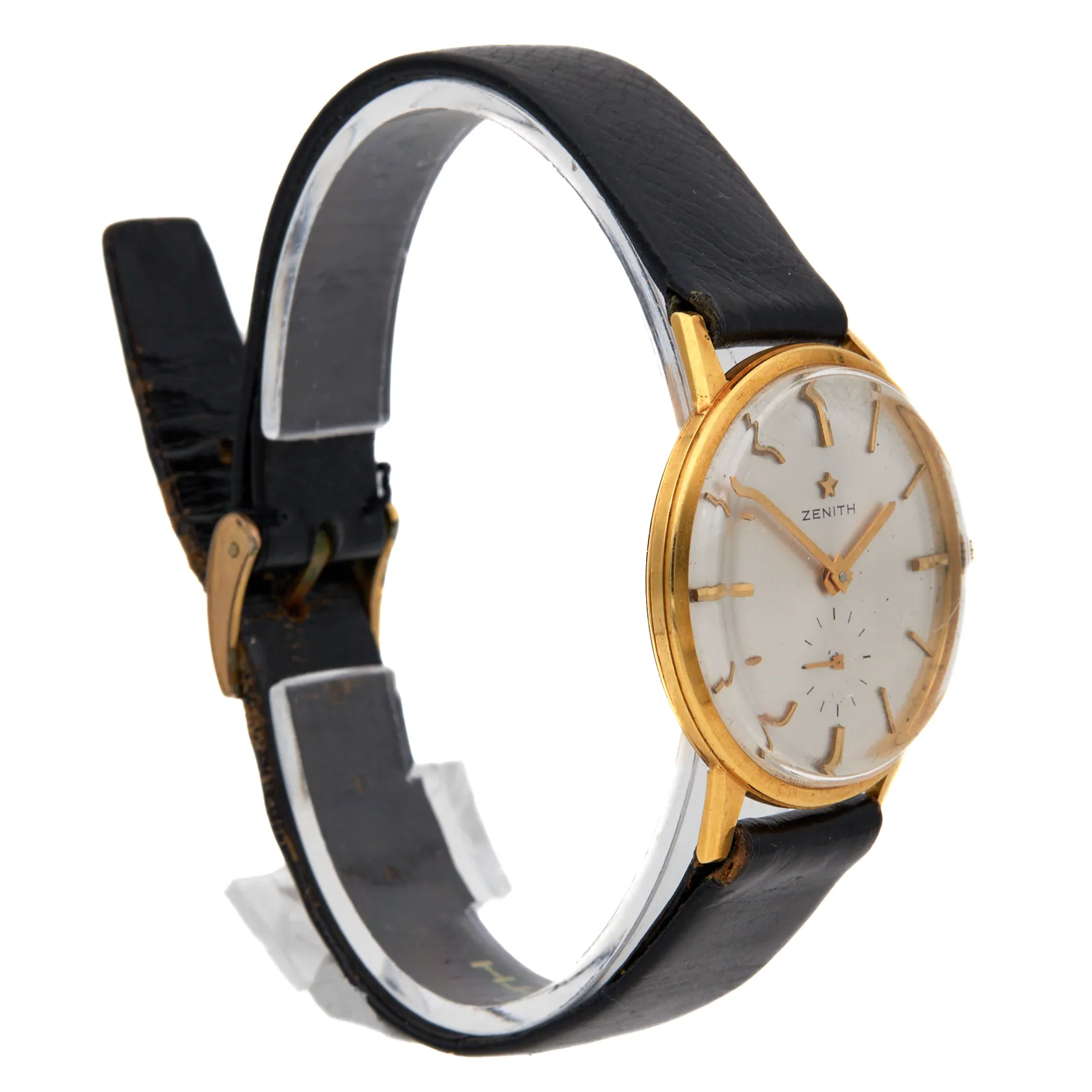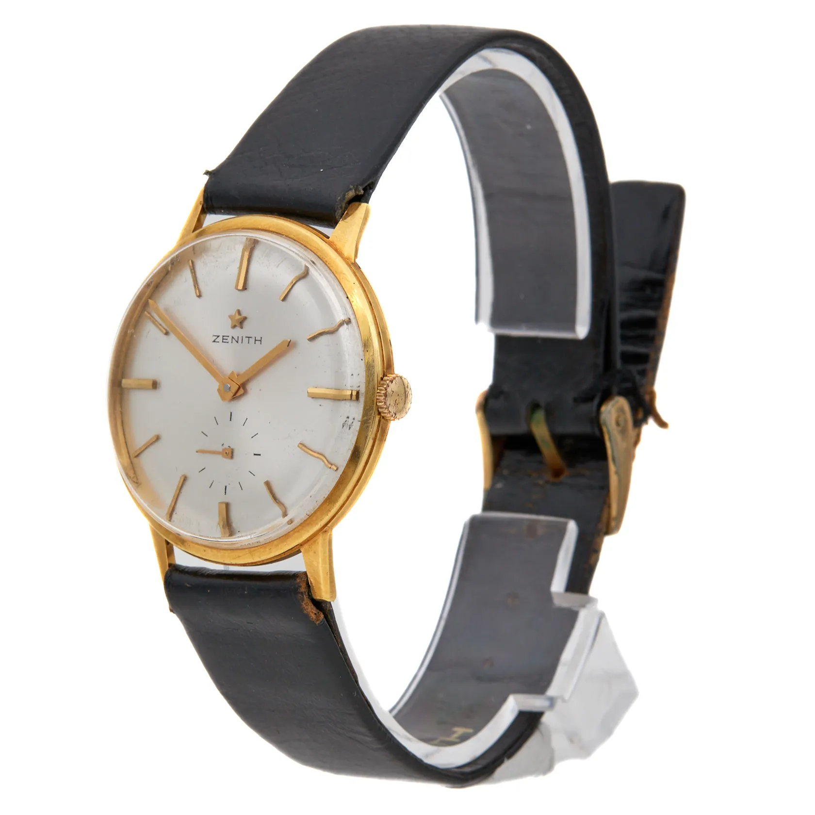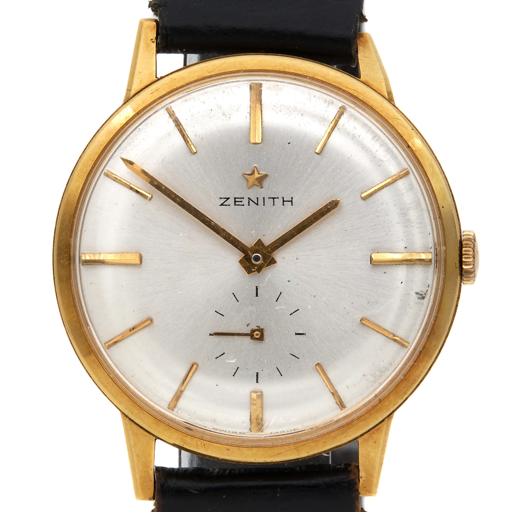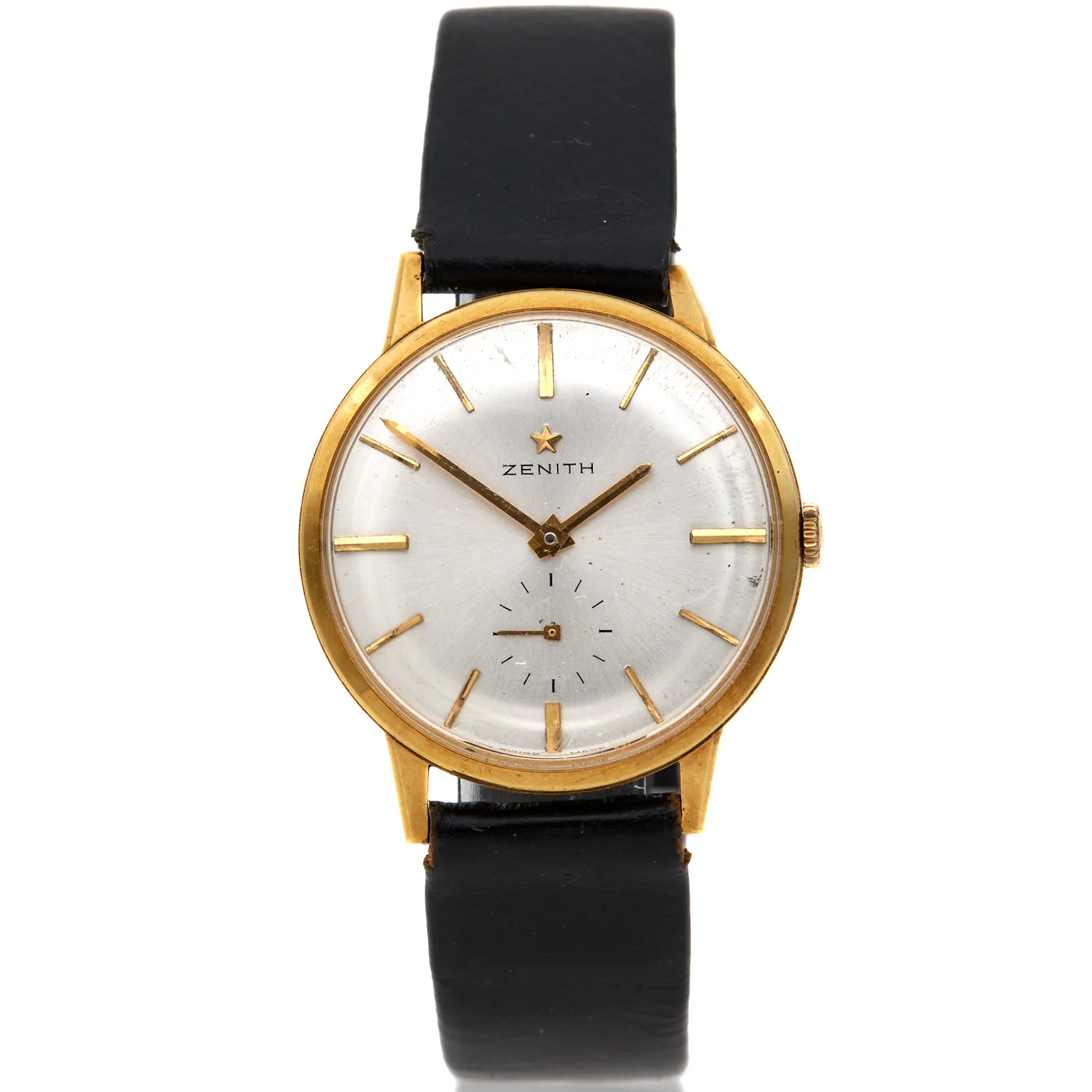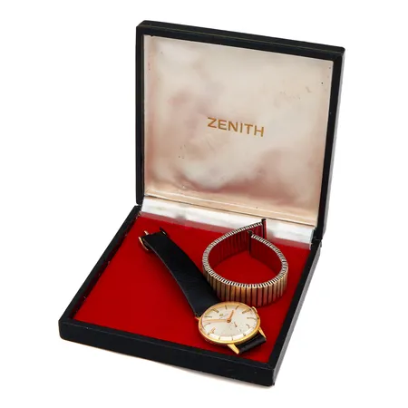 Kultanrannekello, Zenith, manuaalinen, rungon Ø 34mm, takakannessa kaiverrus, alkuperäinen nahkaranneke viallinen, metalli vaihtoranneke, laatikko