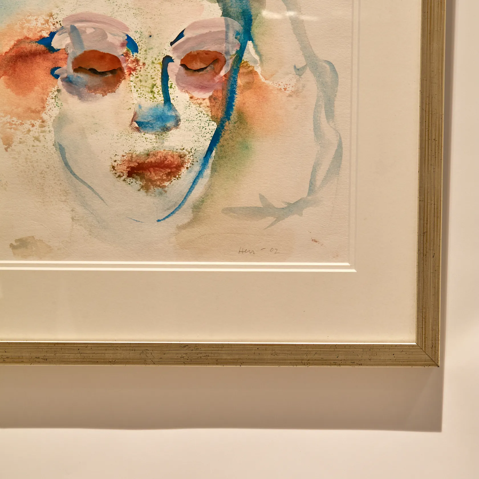 Vesivärityö Outi Heiskanen, oma muotokuva, signeerattu Heis -02, teoksen mitat 37x29cm, koko mitat 52,5x45,5cm