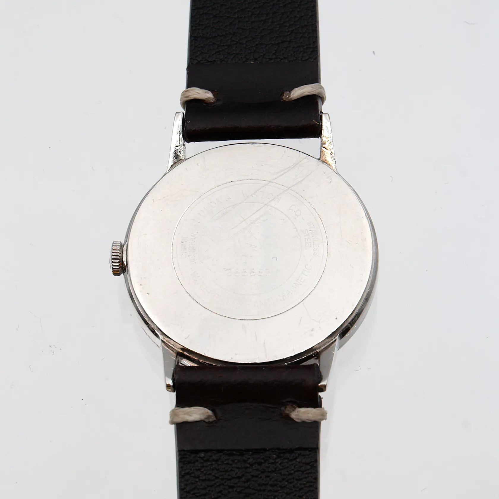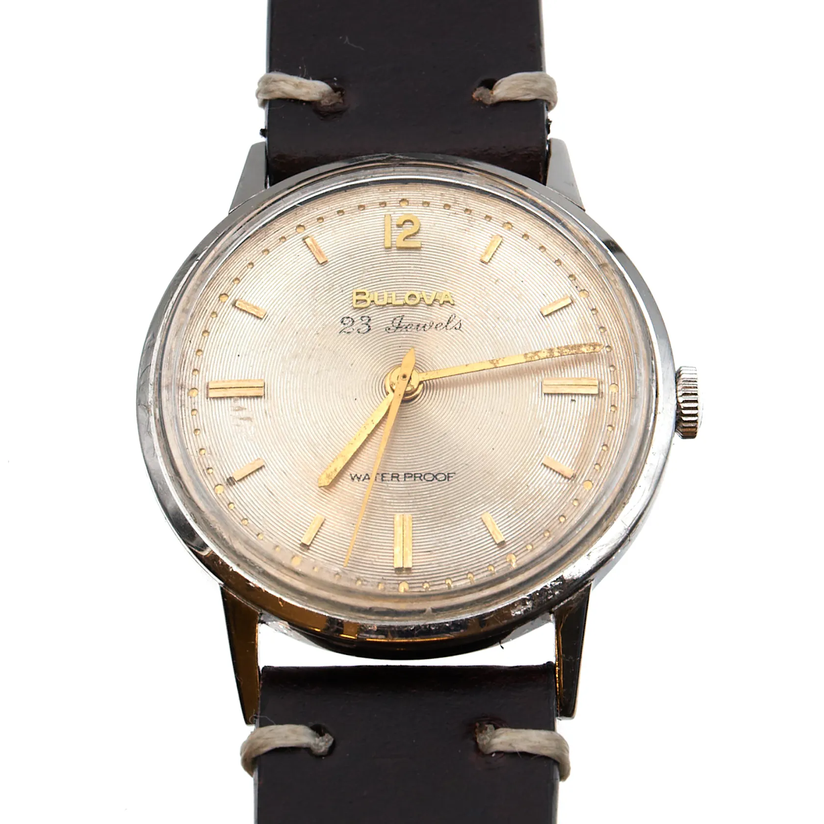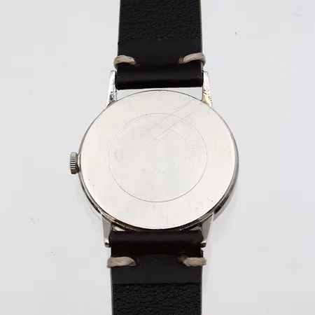 Teräsrannekello Bulova nahkarannekkeella, manuaali, 23-kivinen, 366683 M1, käytöstä aiheutunutta kulumaa, jäykkä veto, Ø 32mm, pituus 140-200mm. Paino: 0 g