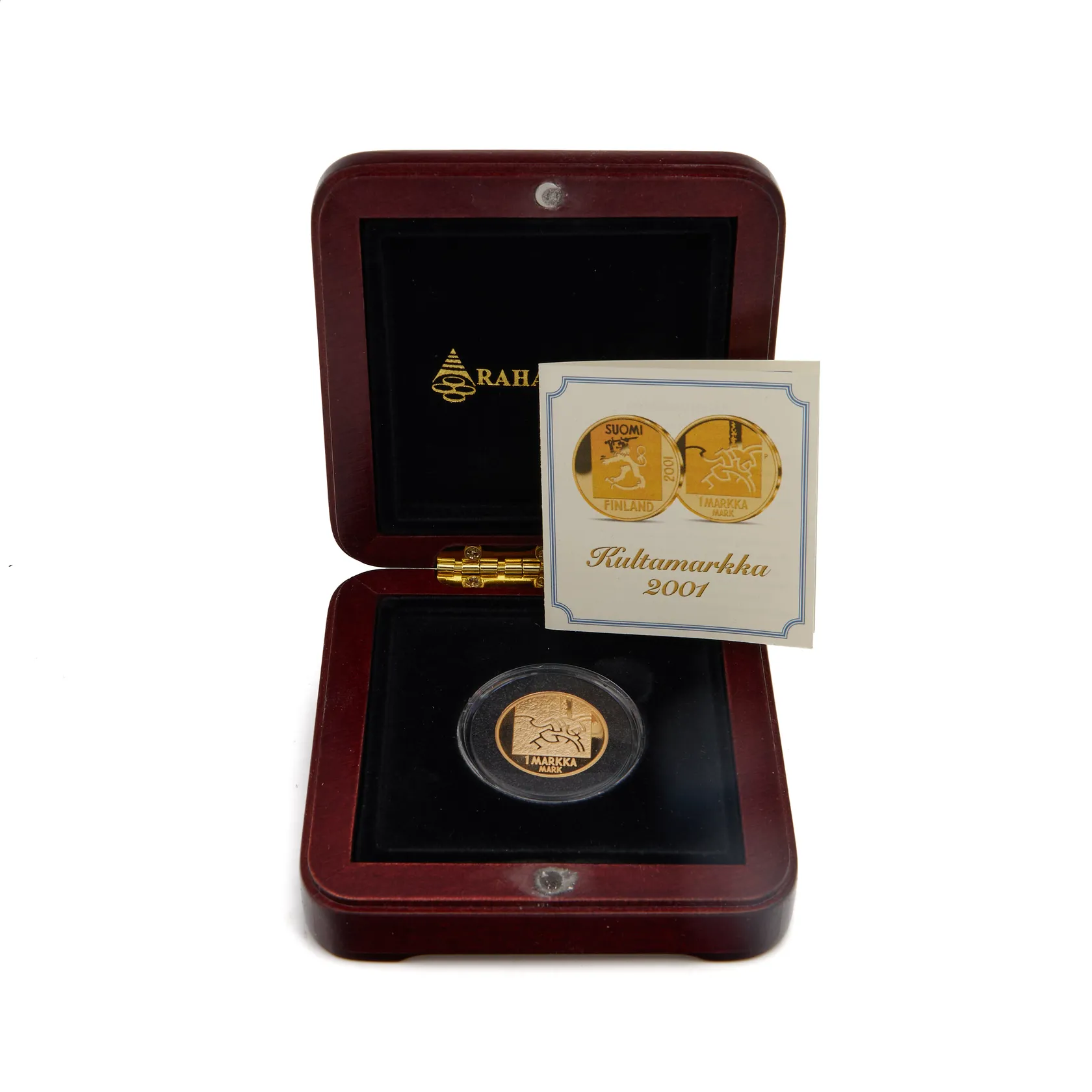 Kultaraha, Suomi 2001, Kultamarkka 2001, nimellisarvo 1 markka, rasia, 750, Paino: 8,6 g