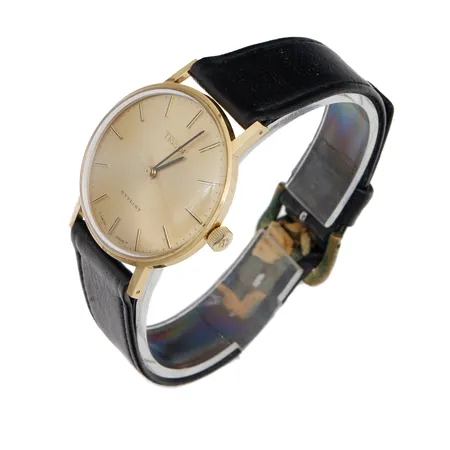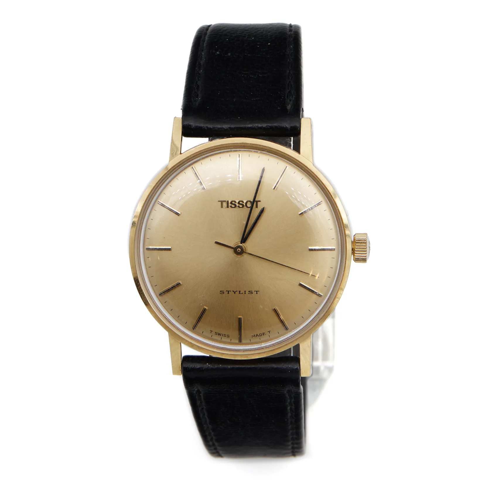 Kultarannekello, Tissot Stylist, mekaaninen, taulun Ø 33mm, viallinen nahkaranneke, kaiverrettu, 750br,