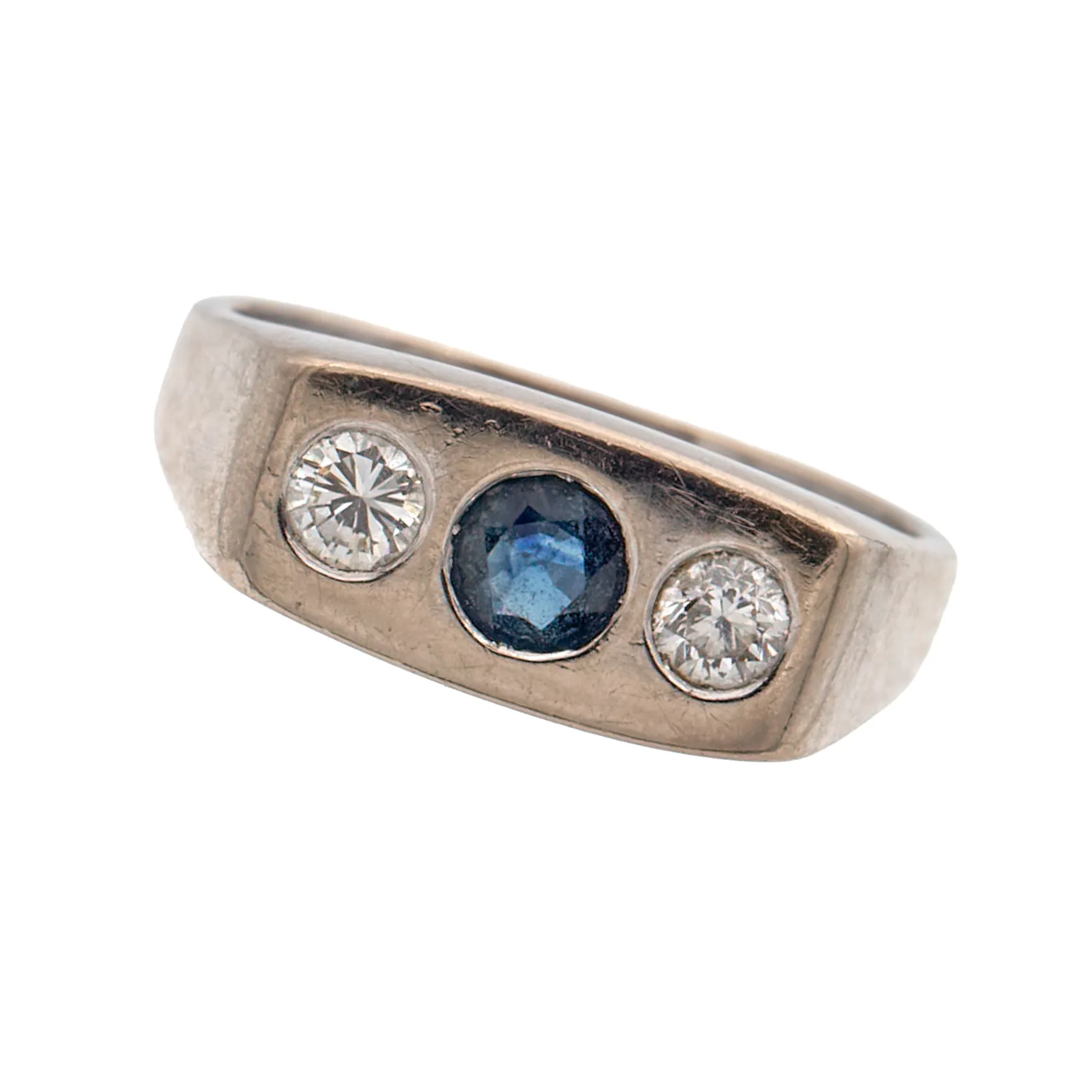 Sinisafiirisormus timanteilla 2xn.0.15ct, koko 17¾, leveys 3-7mm, 750br valkokultaa, Paino: 6,5 g
