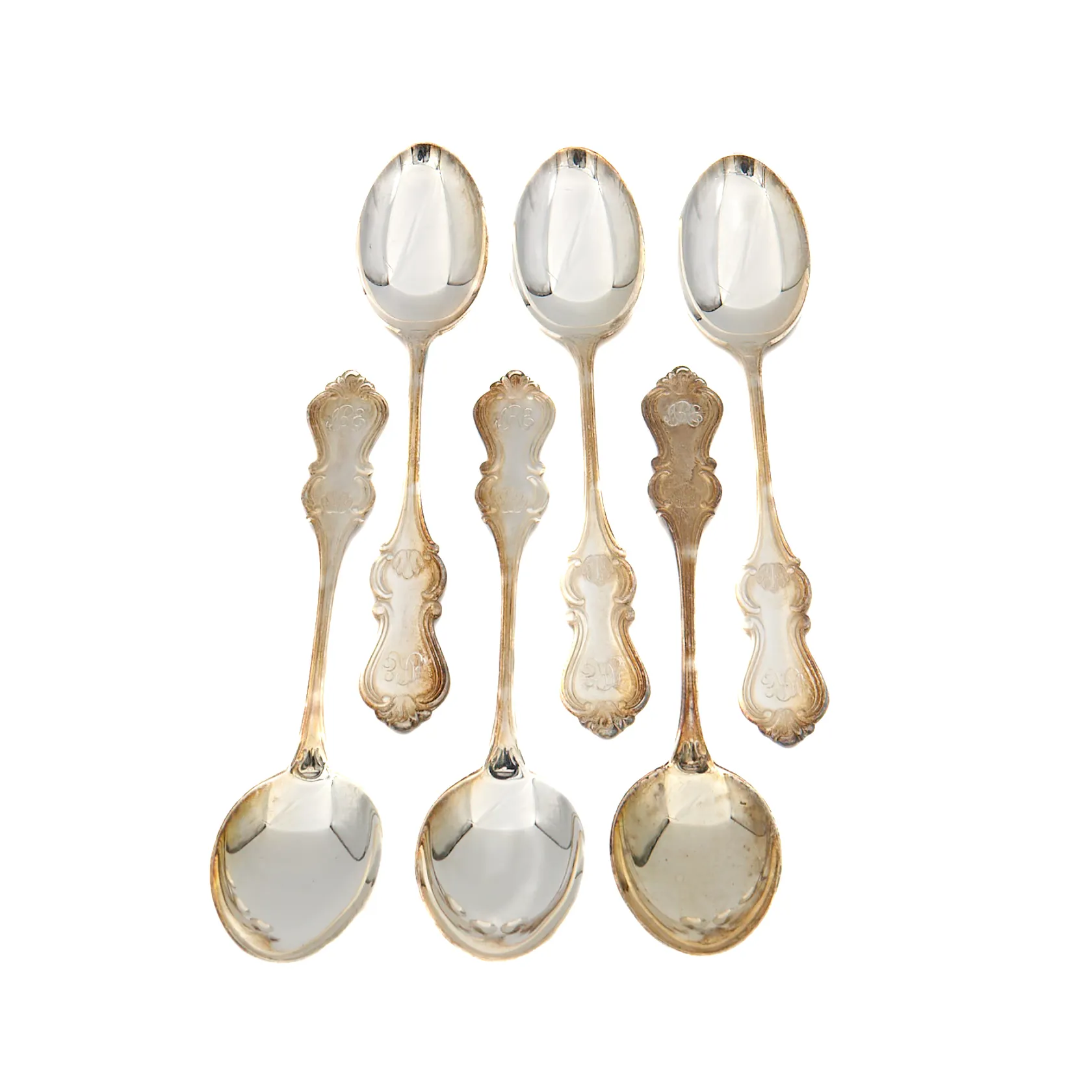 Kuusi jälkiruokalusikkaa, Romantiikka, pituus 165mm, kaiverrettu, Kultakeskus Oy, valmistettu Hämeenlinnassa 1971, 830, Paino: 211,5 g