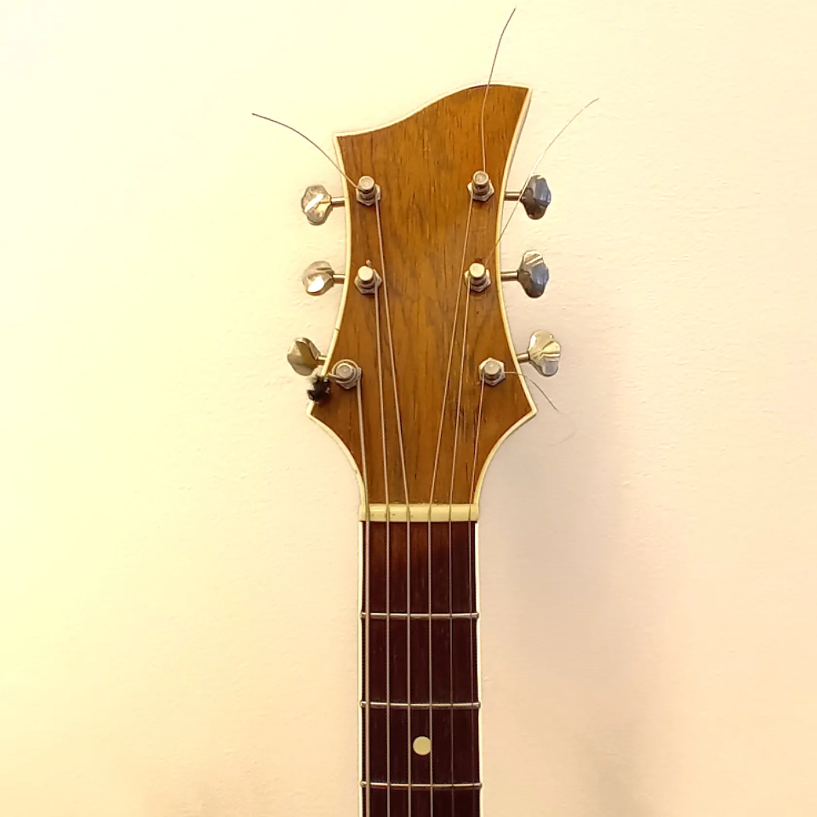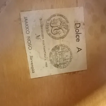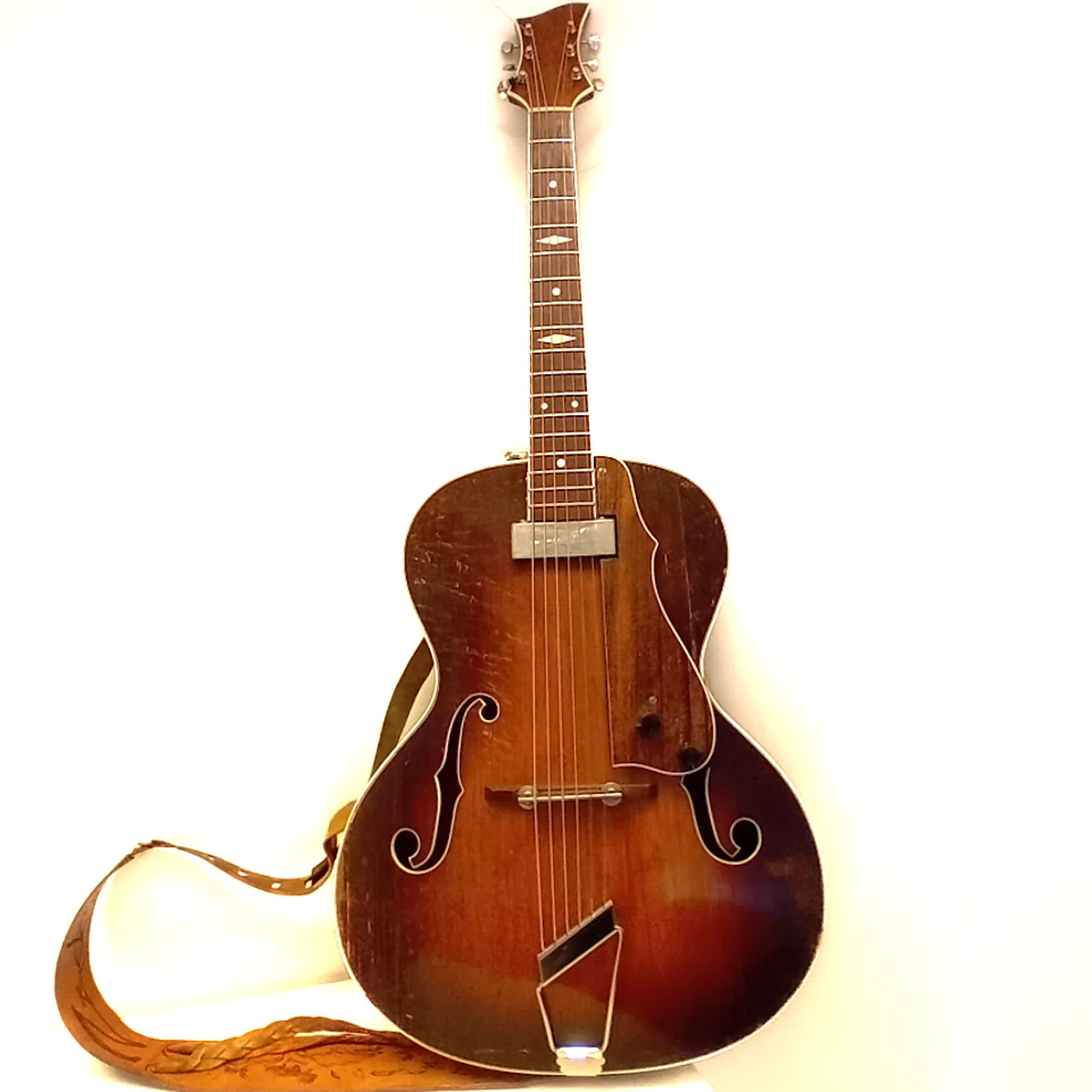 Elektroakustinen kitara Jaakko Noso Dolce A, valmistettu Järvenpäässä, 1950 luvulla, useassa kohtaa käytöstä aiheutunutta kulumaa ja kantolaukku.