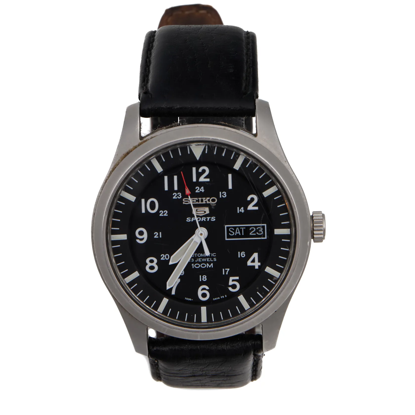 Teräsrannekello, Seiko 5 Sports automaatti, 23 kivininen, nahkaranneke, ref. 7S36-03J0, rungon Ø 40mm, lasissa pieniä käytön jälkiä, rannekkeen pituus 150-210mm