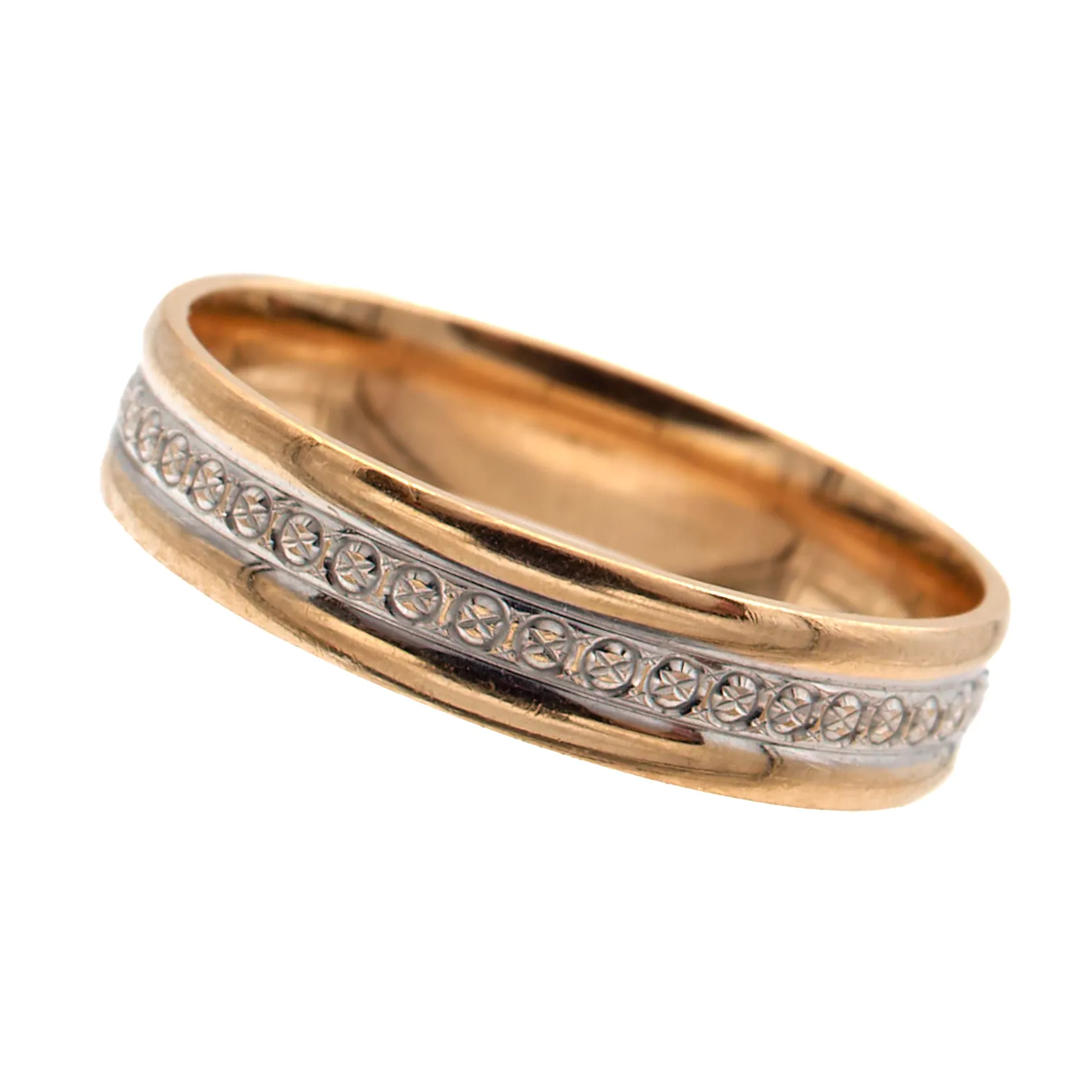 Kuvioitu sormus, koko 17, Kultakeskus, 585 kelta- ja valkokultaa, Paino: 2,5 g