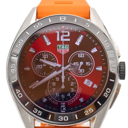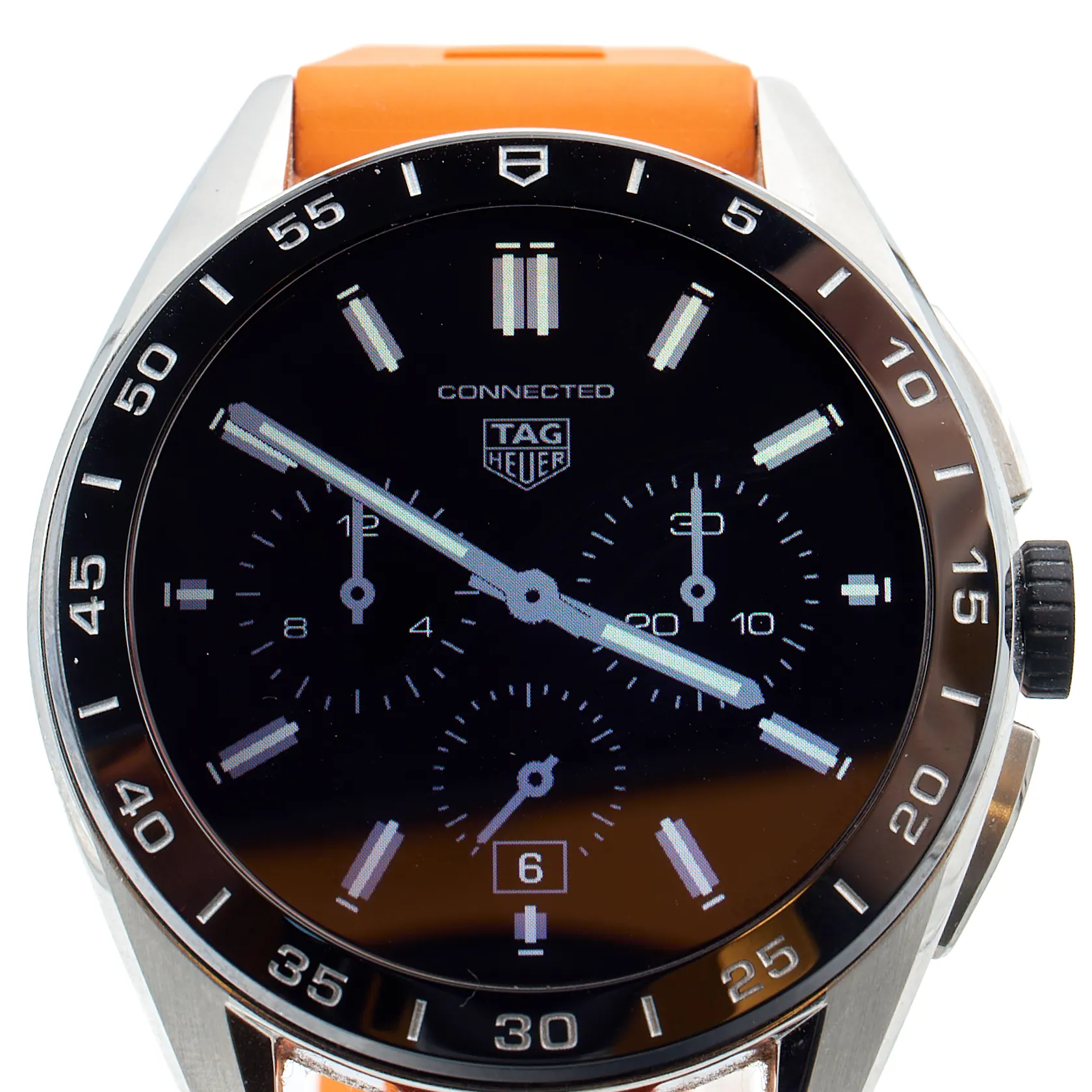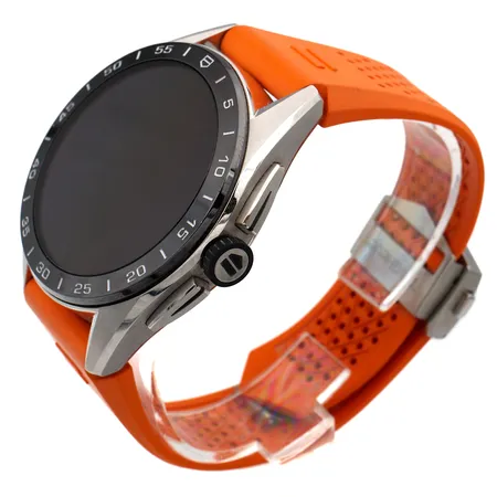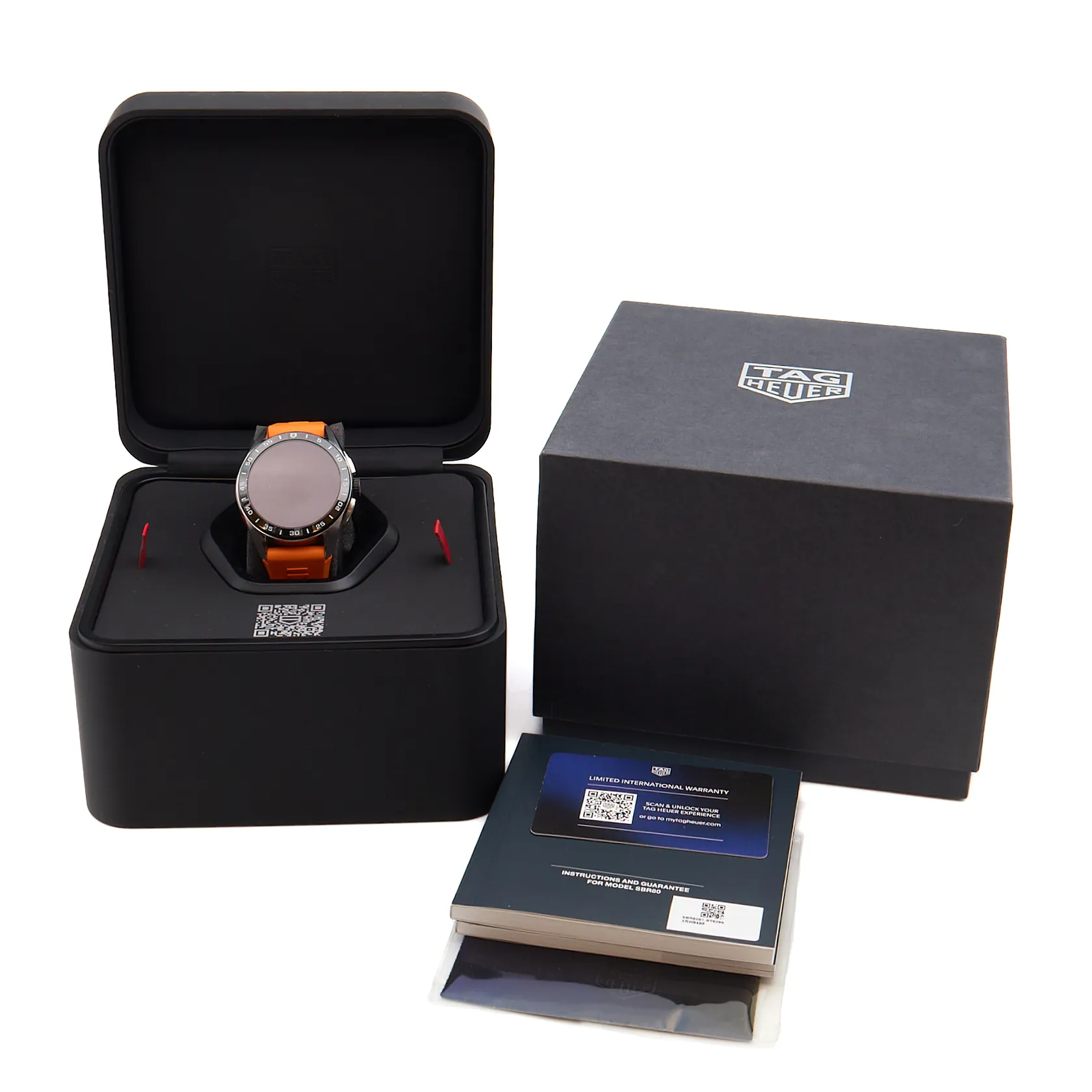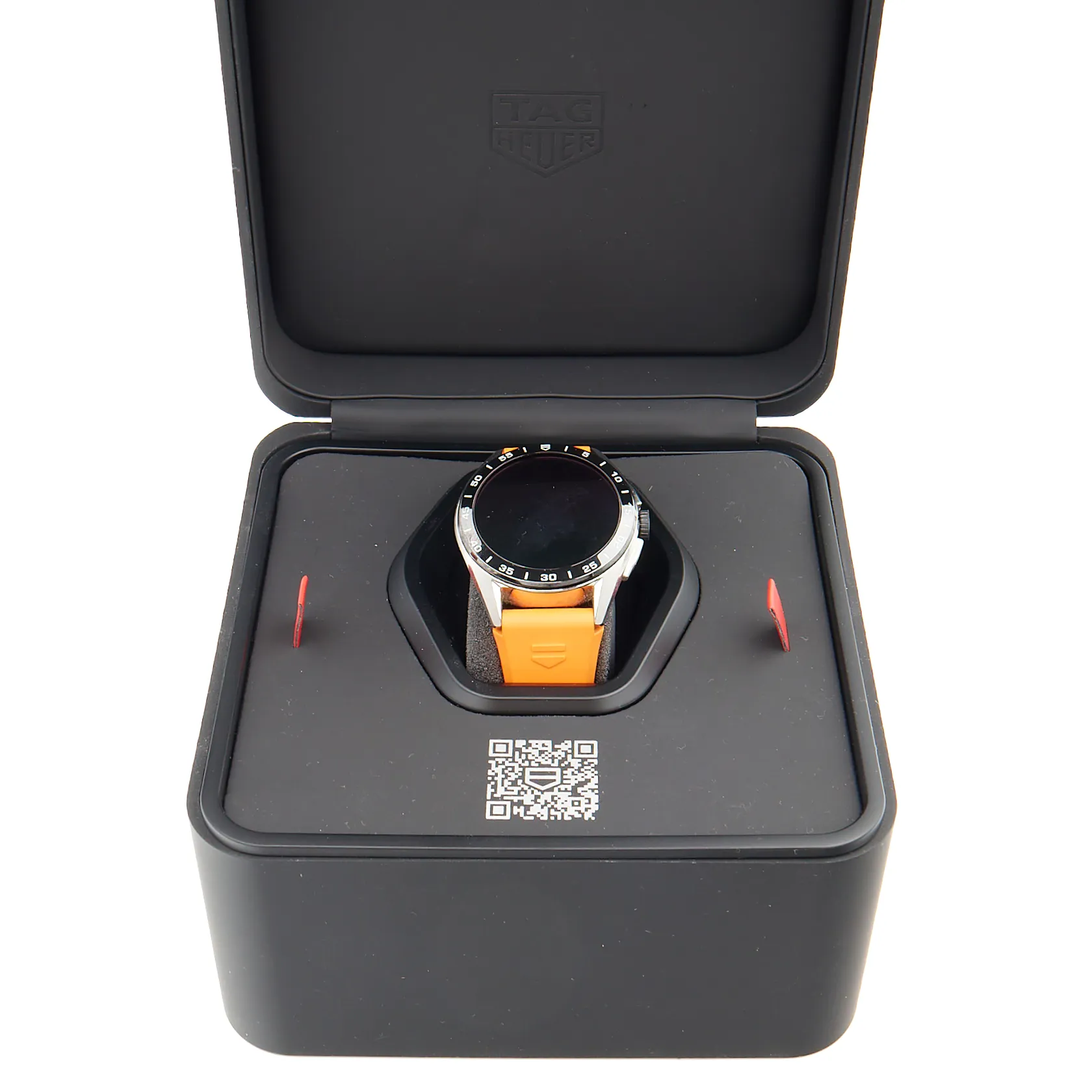 Älykello Tag Heuer, Connected E4, SBR8A10.BT6259, ref. XER2554, Ø 45mm, silikoniranneke, Lindroosin takuu vanhentunut 4/2024, takuukortti, ohjekirjat, latausjohto ja -alusta sekä laatikot.