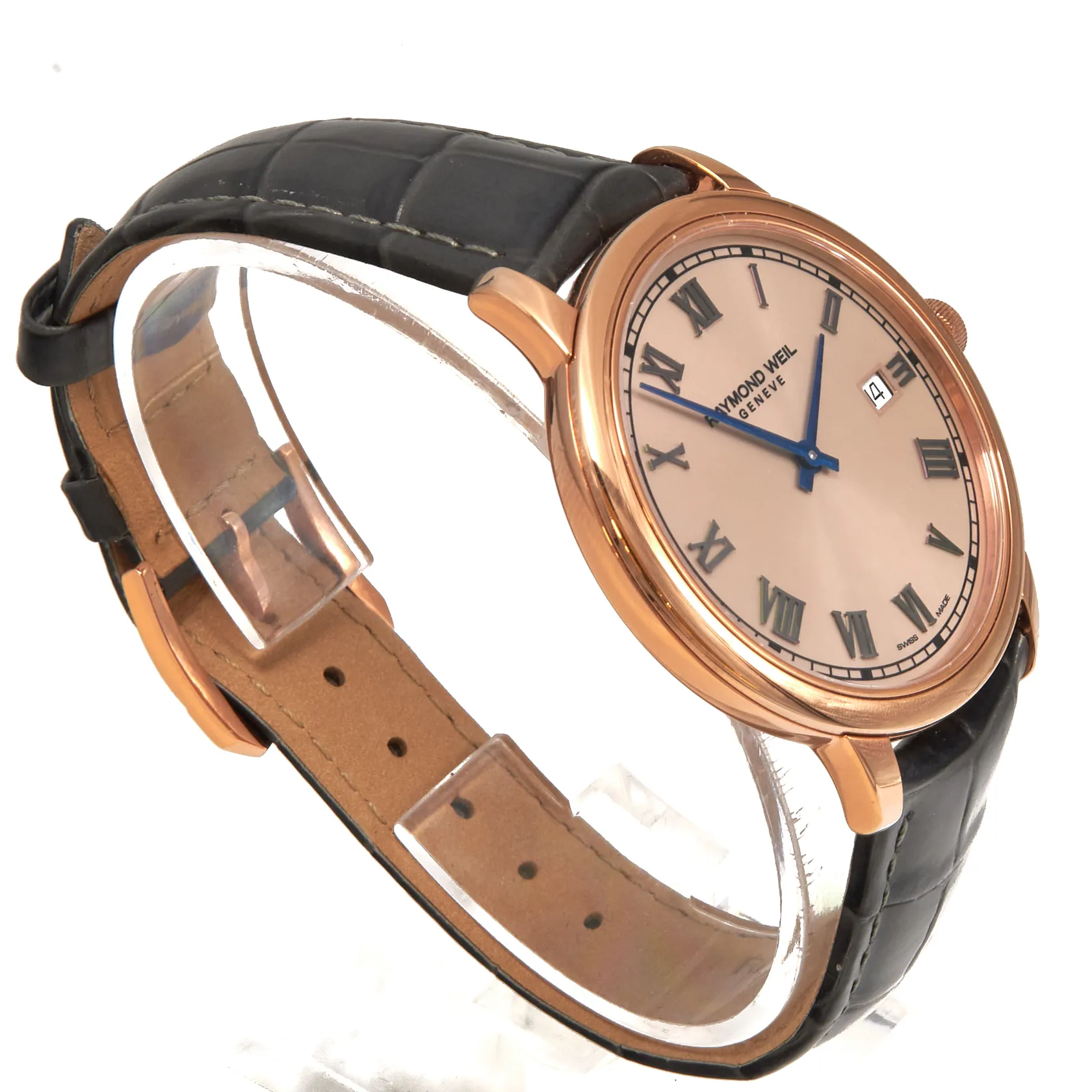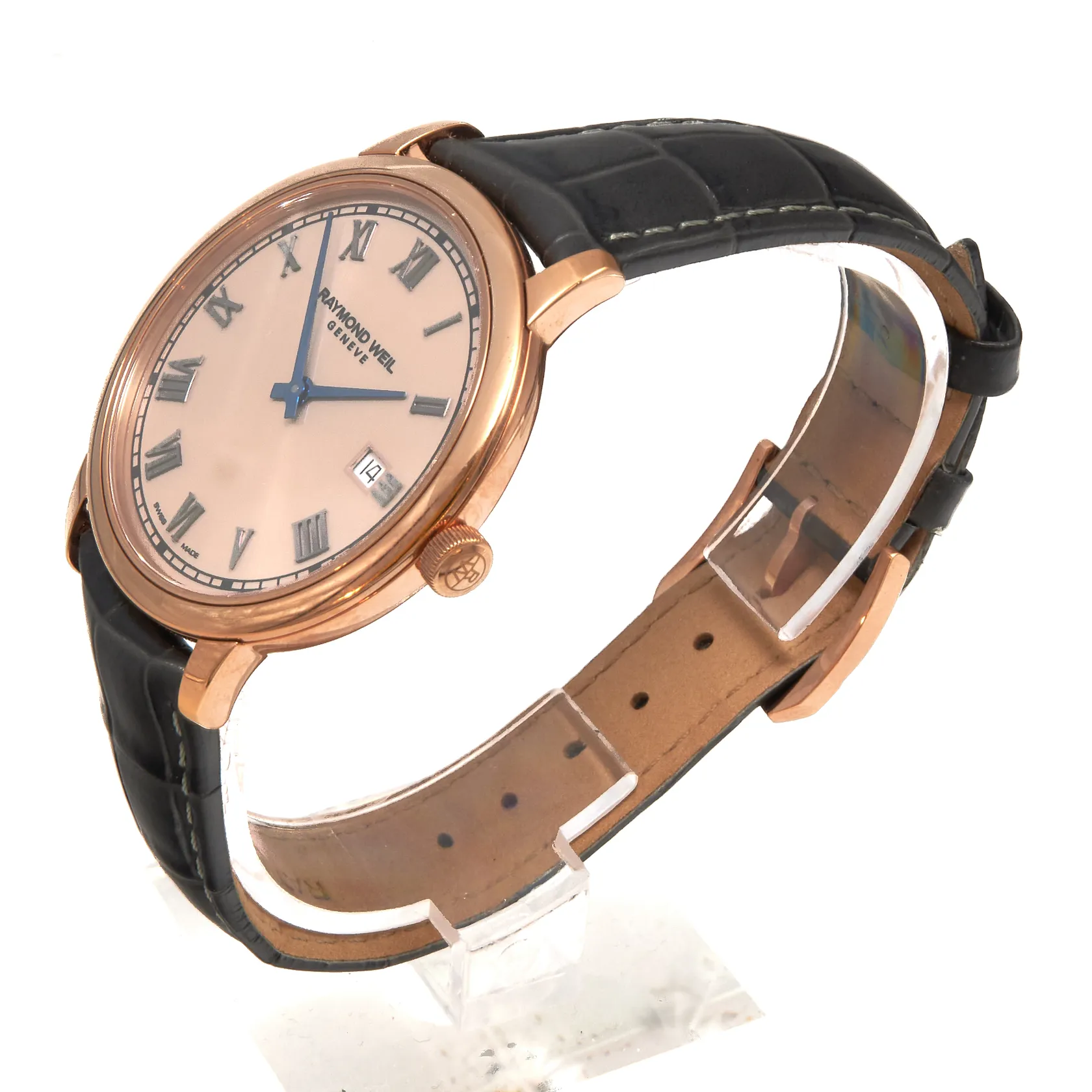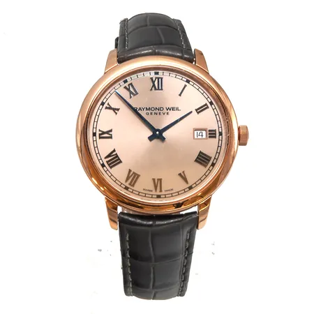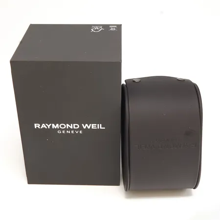 Teräsrannekello Raymond Weil Geneve, ref 5485-X663896, quartz, patteri loppunut, rungon Ø39mm, nahkarannekkeen pituus 175-215mm, WR50, laatikko,