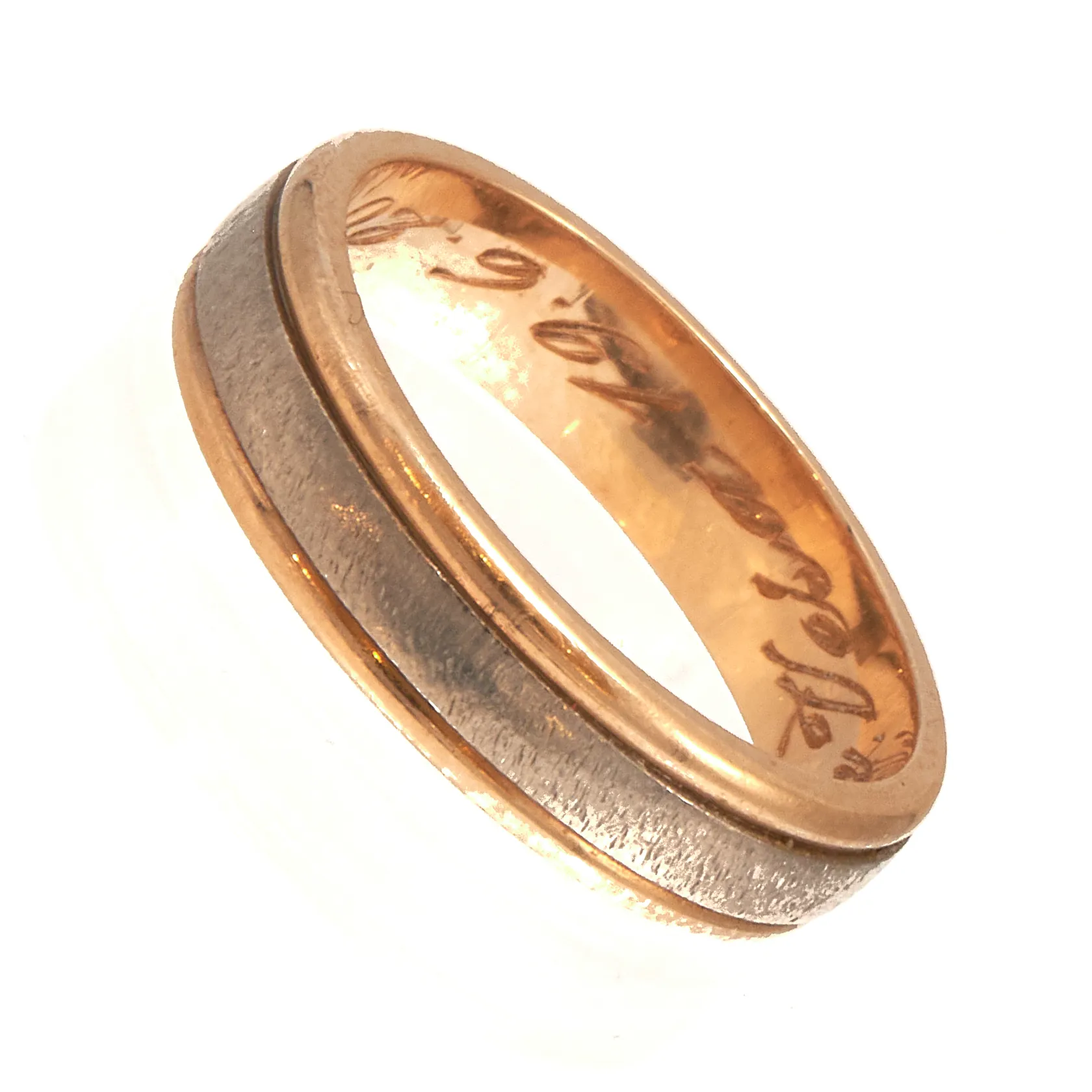Kuvioitu sormus, kaiverrettu, koko 15, 585 valko- ja keltakulta, Paino: 3,4 g