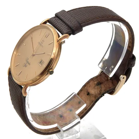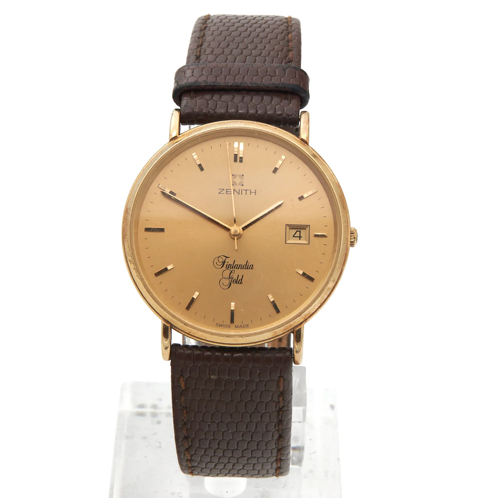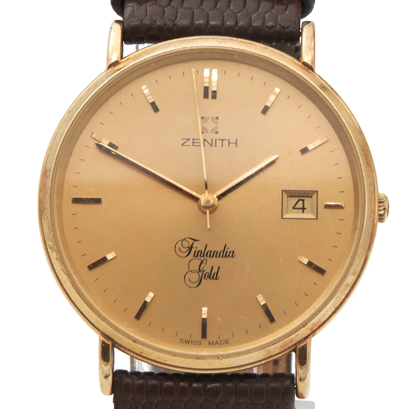 Kultarannekello Zenith, Finland Gold, quartz, kaiverrettu, patteri loppunut, rungon Ø33.5mm, nahkaranneke ei alkuperäinen, ranneke viallinen, rannekkeen pituus 170-210mm, 585br, Paino: 29,9 g