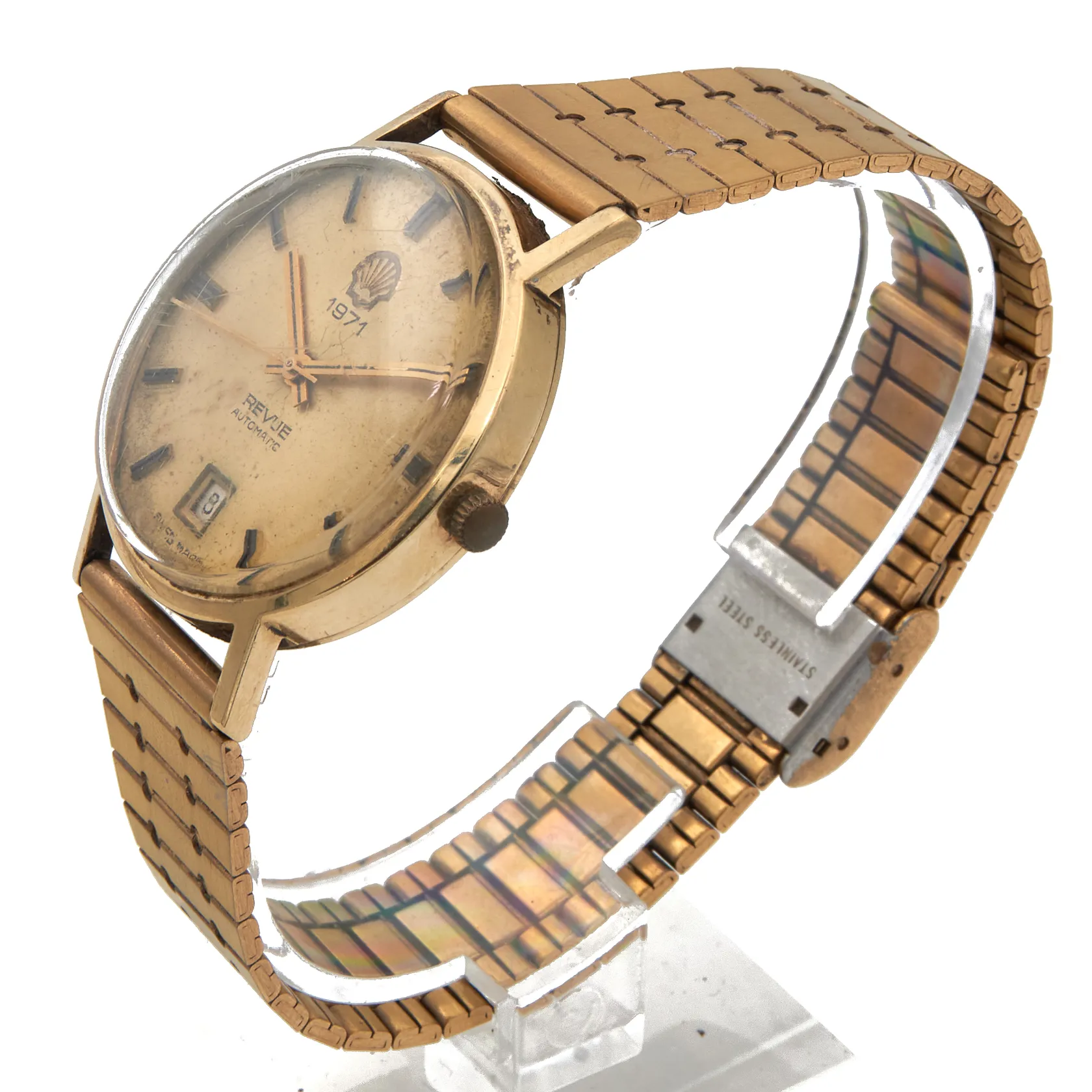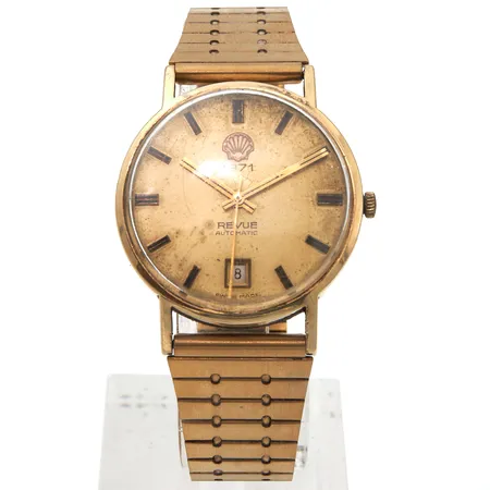Kultarannekello Revue, Shell, Automatic, swiss made, rungon Ø34mm,, S:N 15641A, käytön jälkiä, ranneke ei alkuperäinen, teräsrannekkeen pituus muutettavissa, 585br Paino: 59,7 g