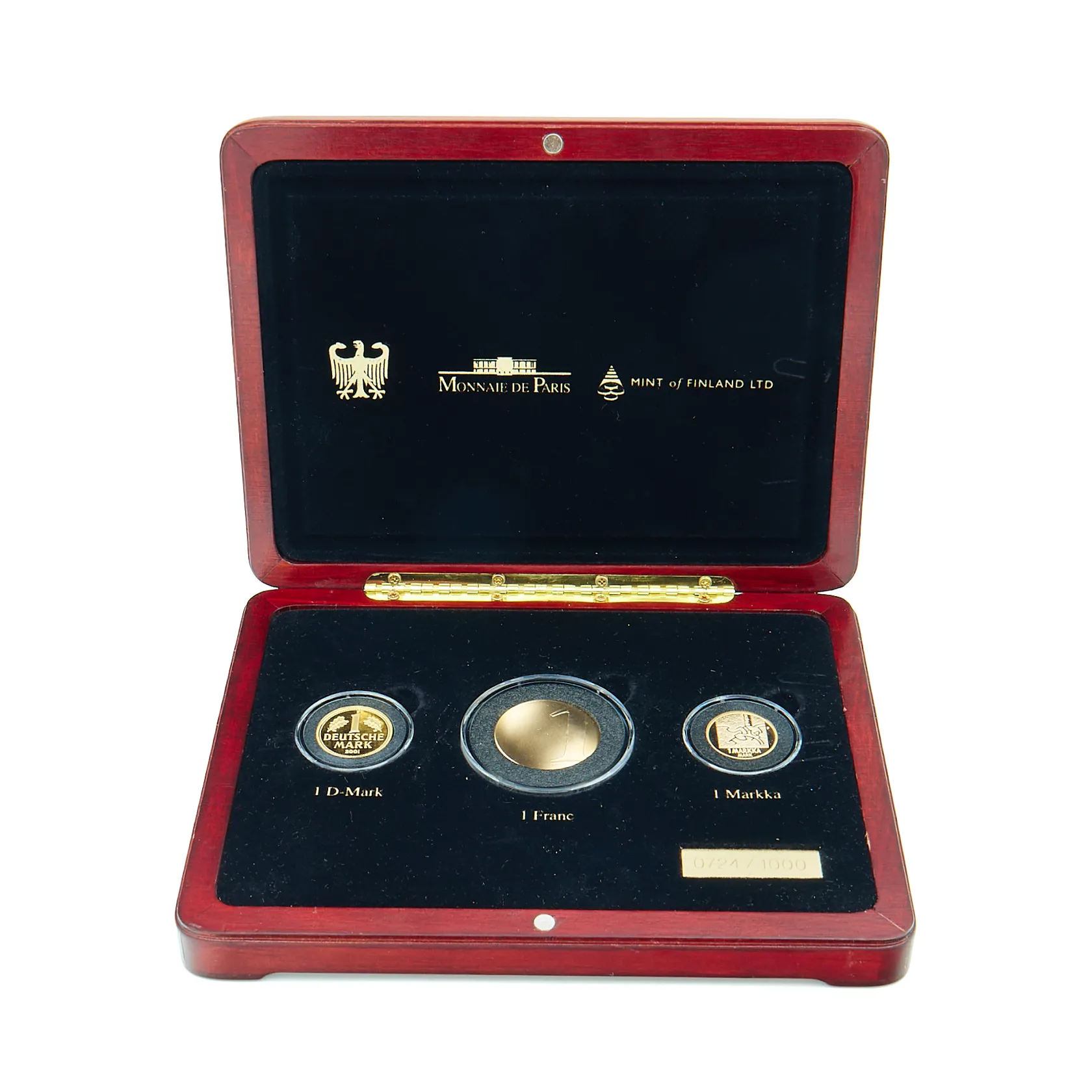 Kultainen juhlakokoelma 2001, Rahapaja Moneta, 1 D-Mark 999 12g, 1 Franc 750 26,1g, 1 Markka 750 8,6g, 0724/1000, puulaatikko ja todistus.