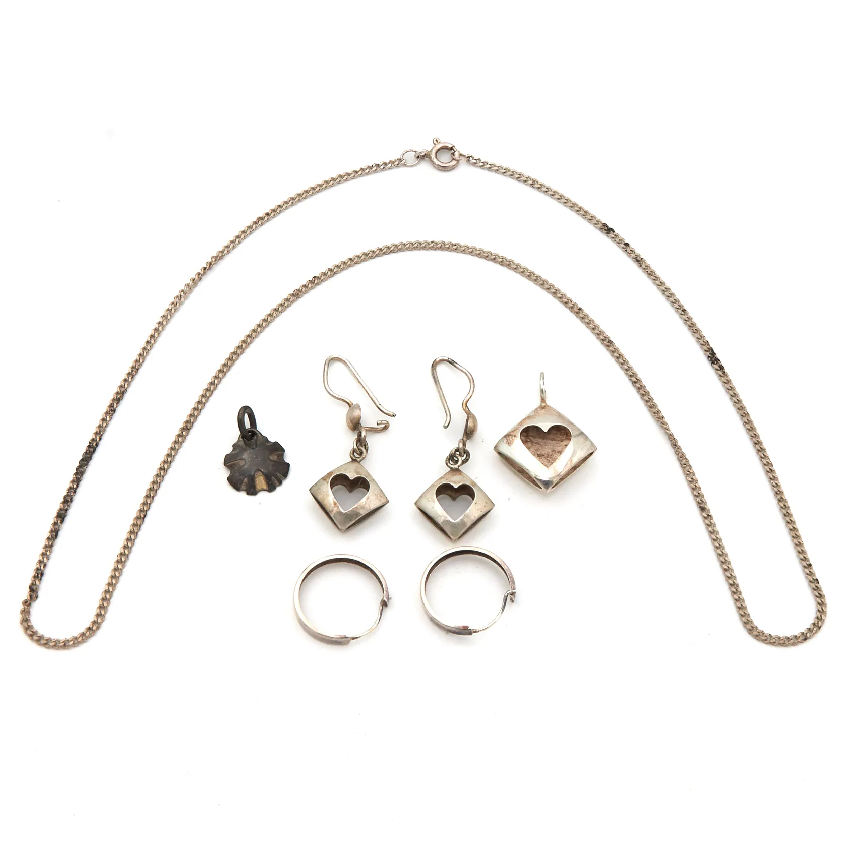 Kaulaketju, kahdet korvakorut ja kaksi riipusta, 925, Paino: 10,4 g