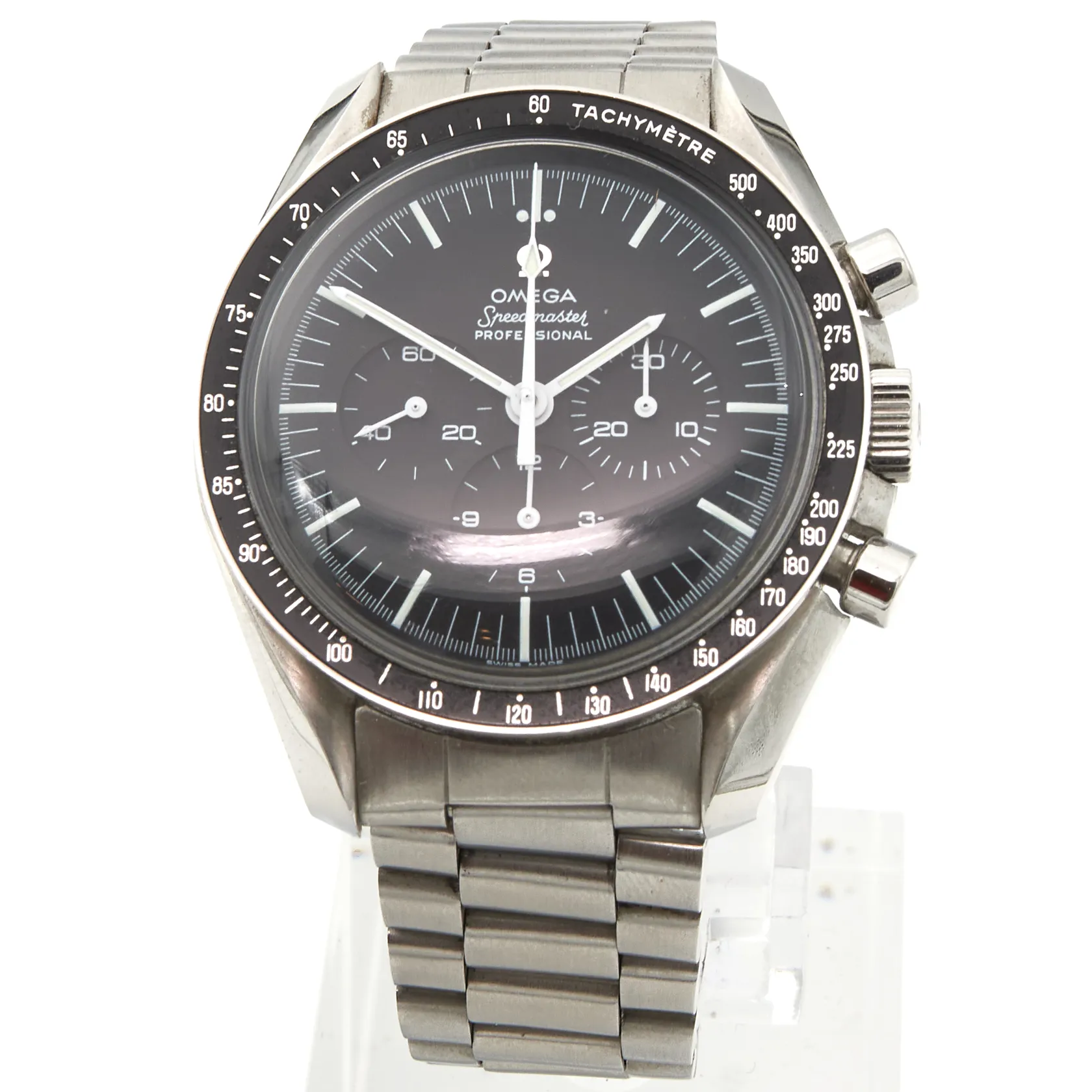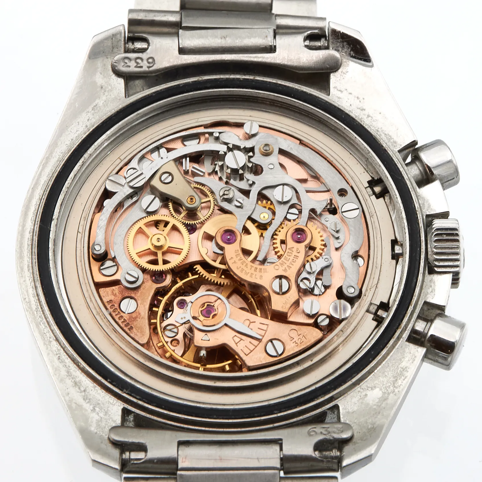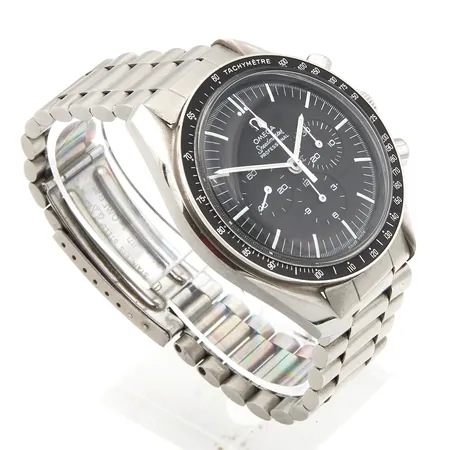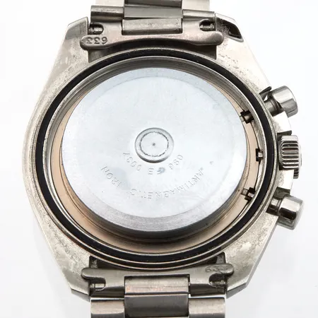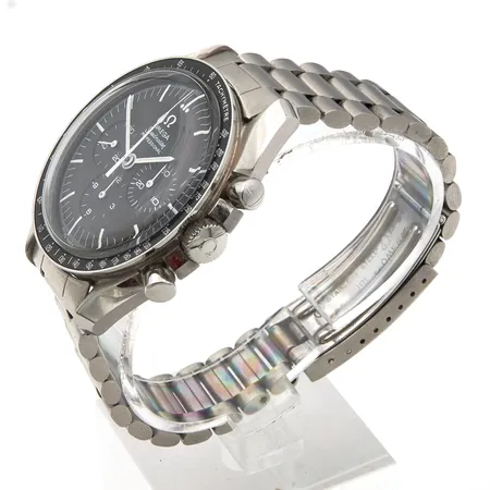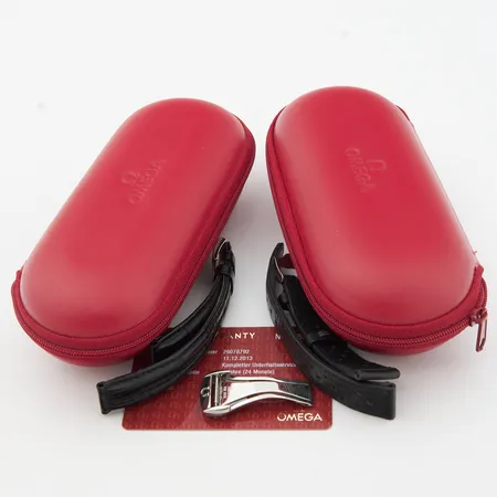 Teräsrannekello Omega Speedmaster, manuaalinen, caliber 321, S:N 26078792, Swiss Made, rungon Ø43.5mm, kaksi nahkaranneketta, yksi perhoslukko, teräsrannekkeen pituus 200mm, kaksi matkakoteloa, huoltotodistus v.2013 Paino: 0 g