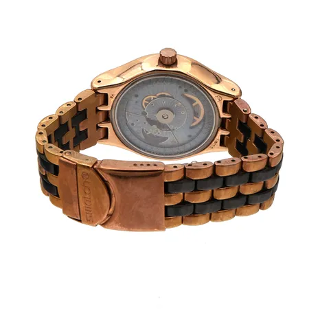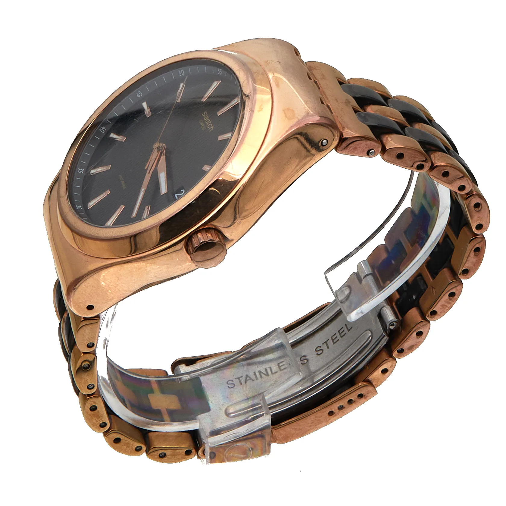 Teräsrannekello, Swatch, automaatti, rungon Ø 42mm, lasissa naarmuja, rungossa käytön jälkiä, jatkopalat, rannekeen pituus 180mm