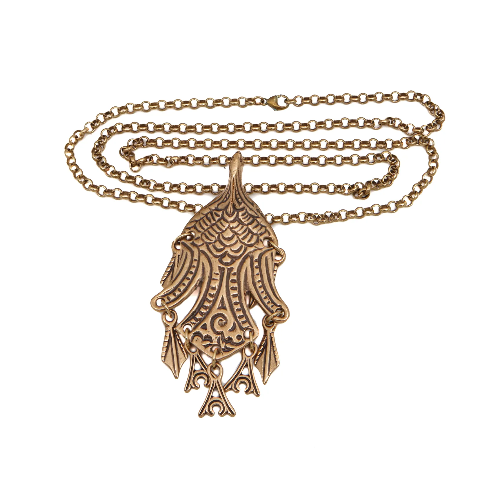 Kaulakoru solkiriipuksella Kalevala, Uhtuan Sotka, ketjun pituus 86cm, riipuksen korkeus 95mm, pronssia