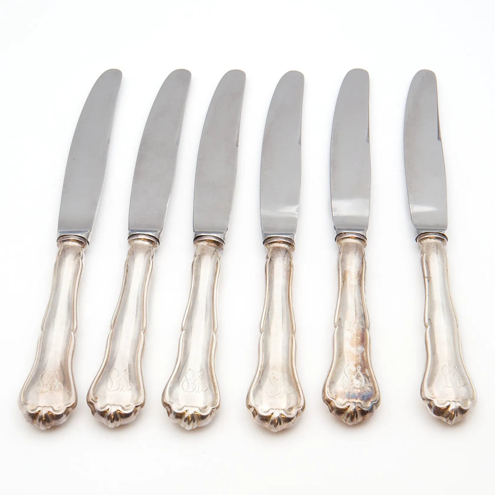 Kuusi ruokaveistä, Chippendale, pituus 210mm, kaiverrettuja, 830br, Paino: 398,1 g