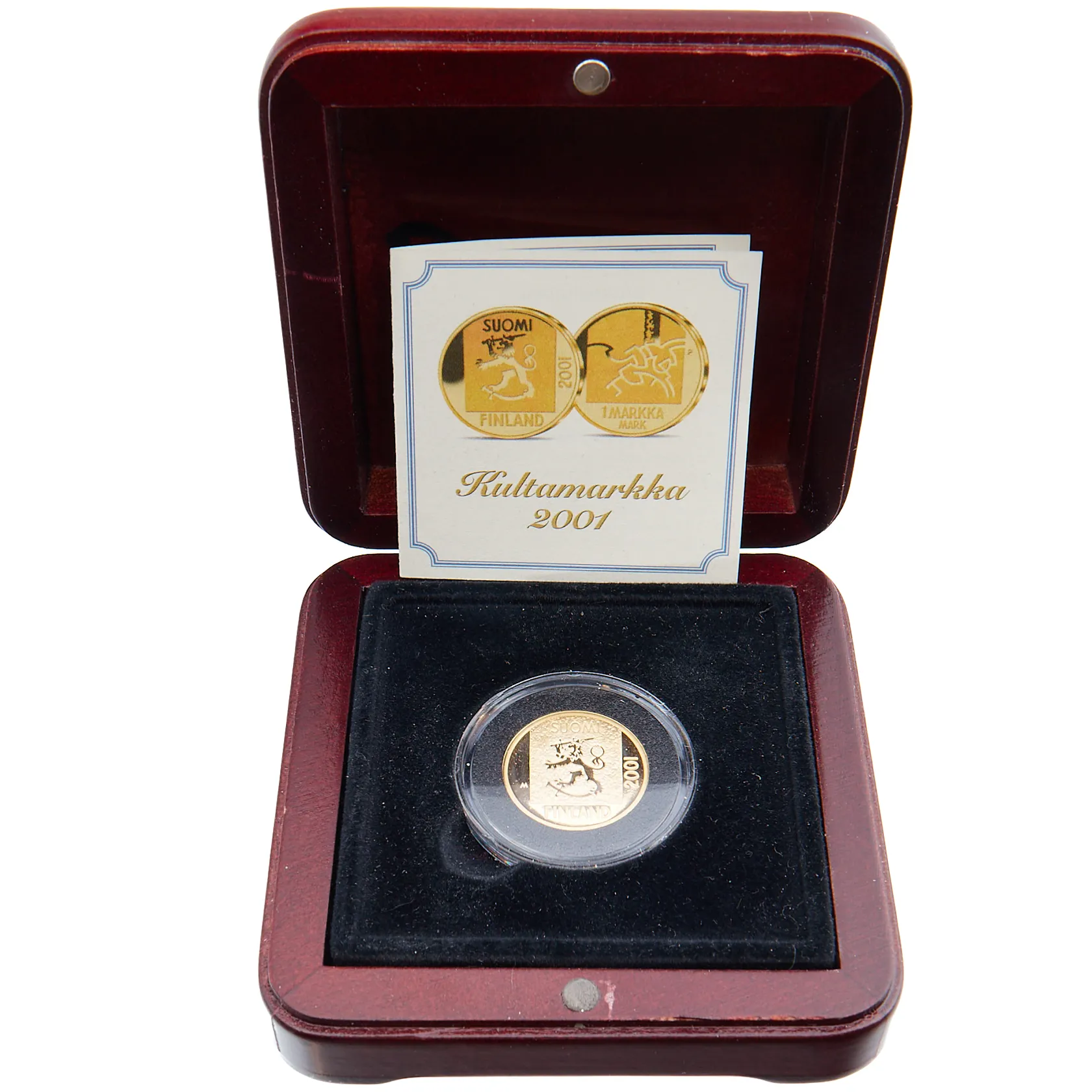 Kultaraha, Suomi 2001, Kultamarkka 2001, nimellisarvo 1 markka, rasia, 750, Paino: 8,6 g