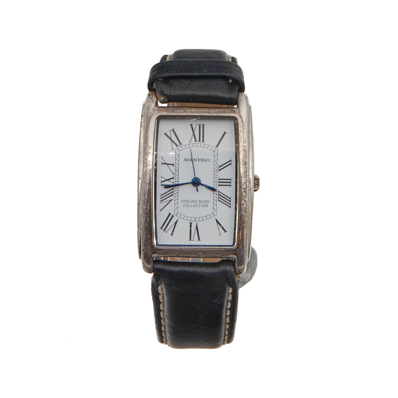 Hopeinen rannekello Avantino, Stetling silver collection, taulun mitat 26x33mm, nahkaranneke, Quartz:paristo loppunut, 925br,