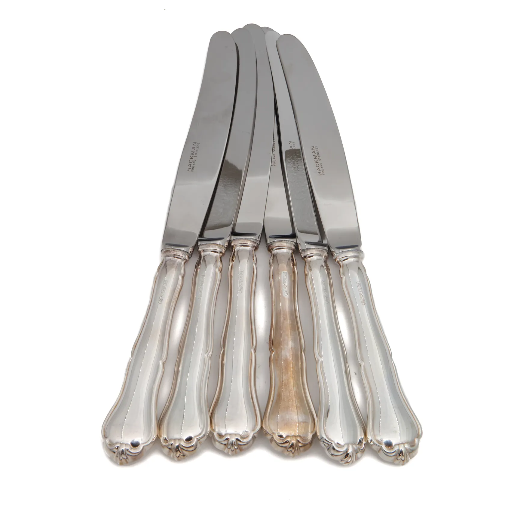 Kuusi ruokaveistä, Chippendale, pituus 230mm, käytön jälkiä, 830br, Paino: 373,2 g