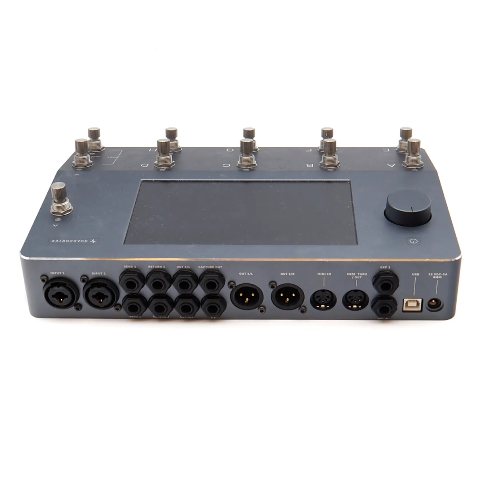 Multiefektiprosessori Neural DSP Quad Cortex, muuntaja kolmella adapterilla ja laatikko.