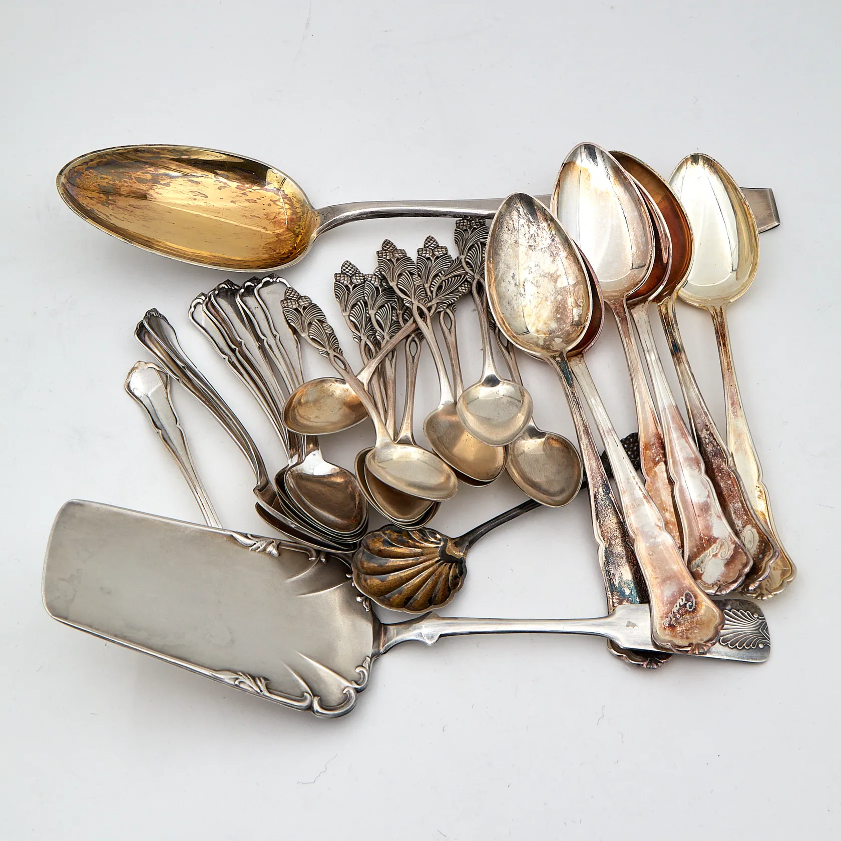 Hopeisia ruokailuvälineitä, osa kaiverrettuja tai viallisia, 813- 830, Paino: 563,7 g