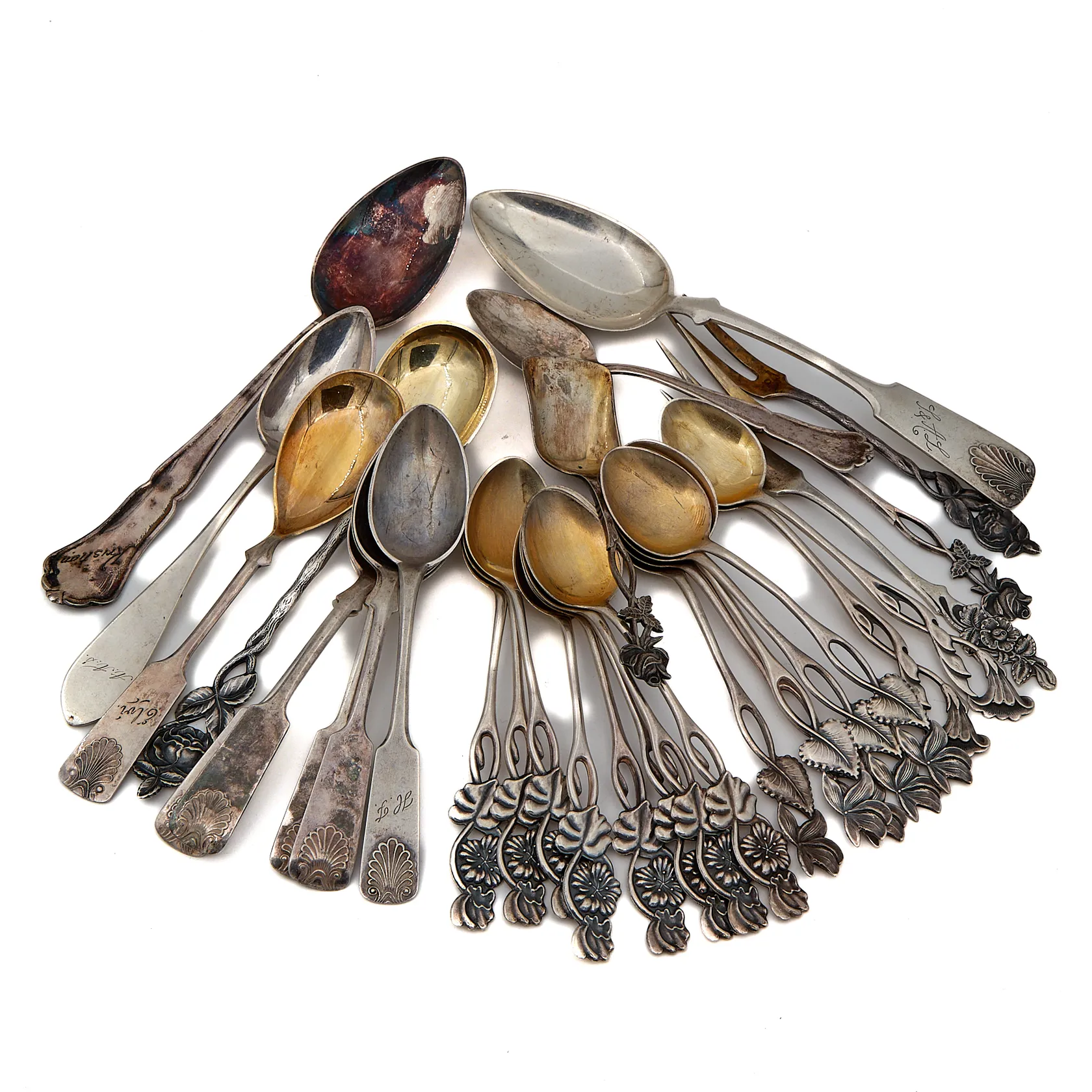 Hopeisia ruokailuvälineitä, osa kaiverrettuja tai viallisia, 813-830, Paino: 379,2 g
