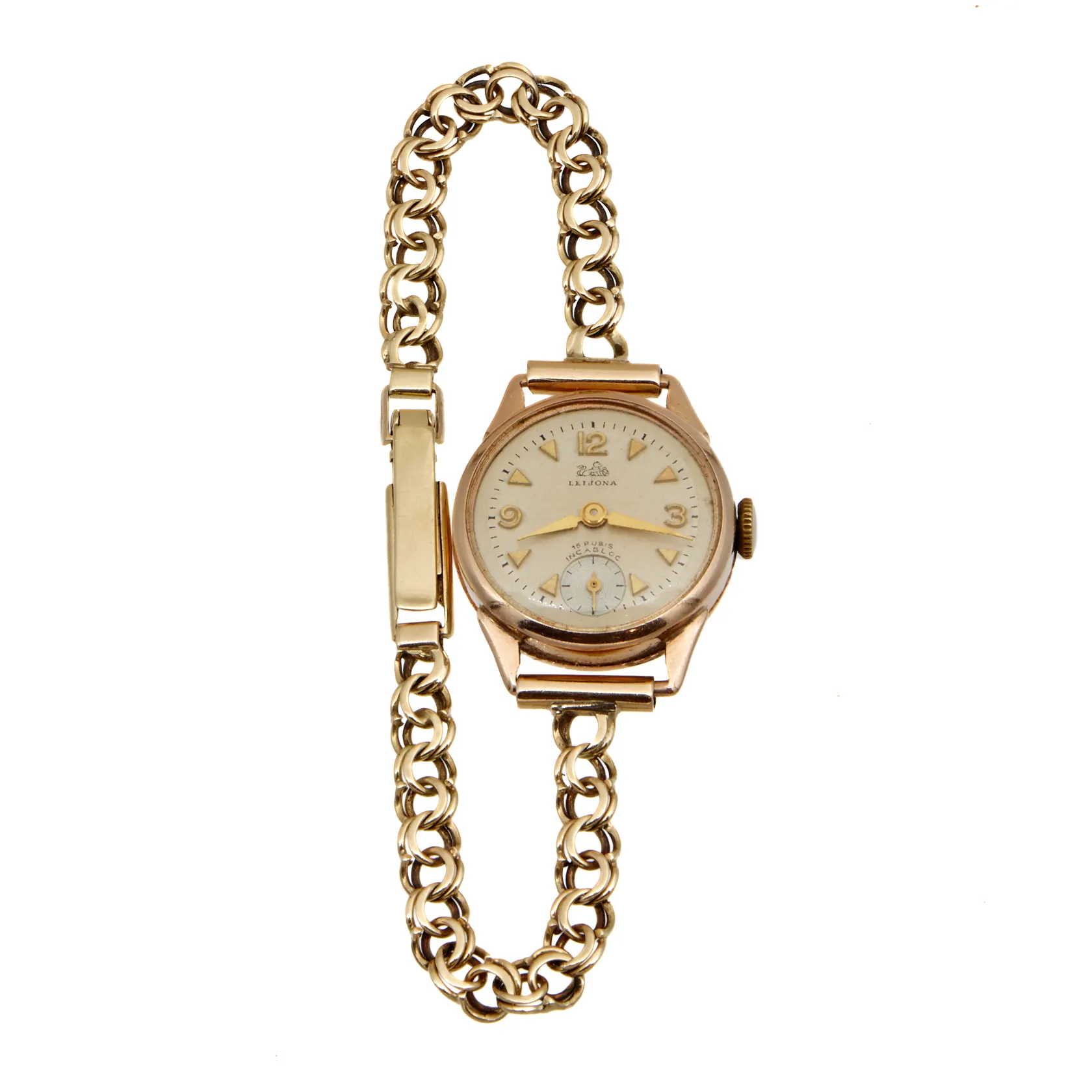 Kultarannekello Leijona, 15 kivinen, kultaranneke, rannekkeen pituus 160mm, taulun Ø 21mm, kaiverrettu, 585br, Paino: 16,1 g